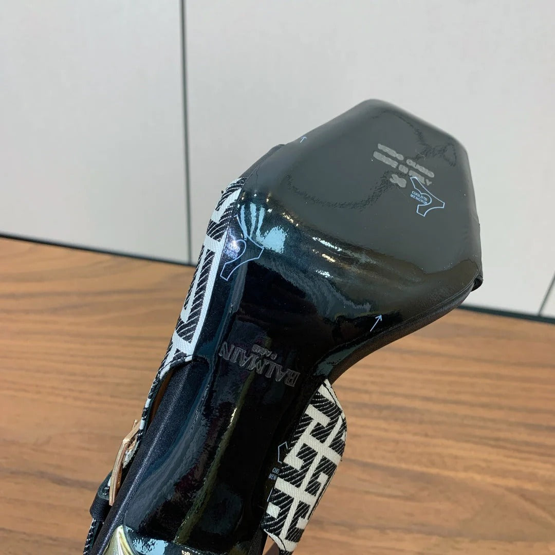 BALMAIN 25S SQUARE STRAP HIGH HEELS 100MM IN BLACK PATENT CALFSKIN