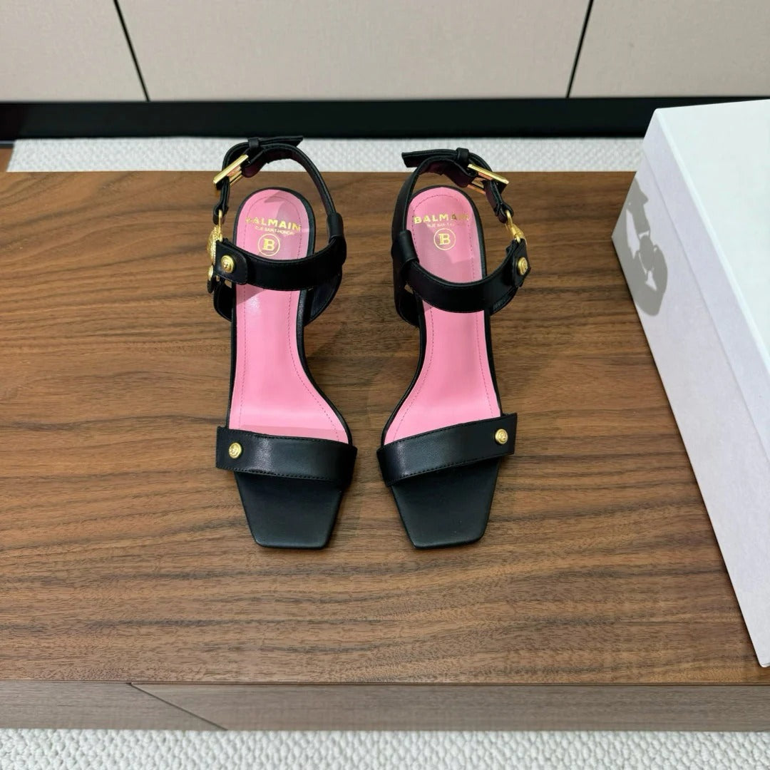 BALMAIN 25S SQUARE STRAP HIGH HEELS 100MM IN BLACK CALFSKIN
