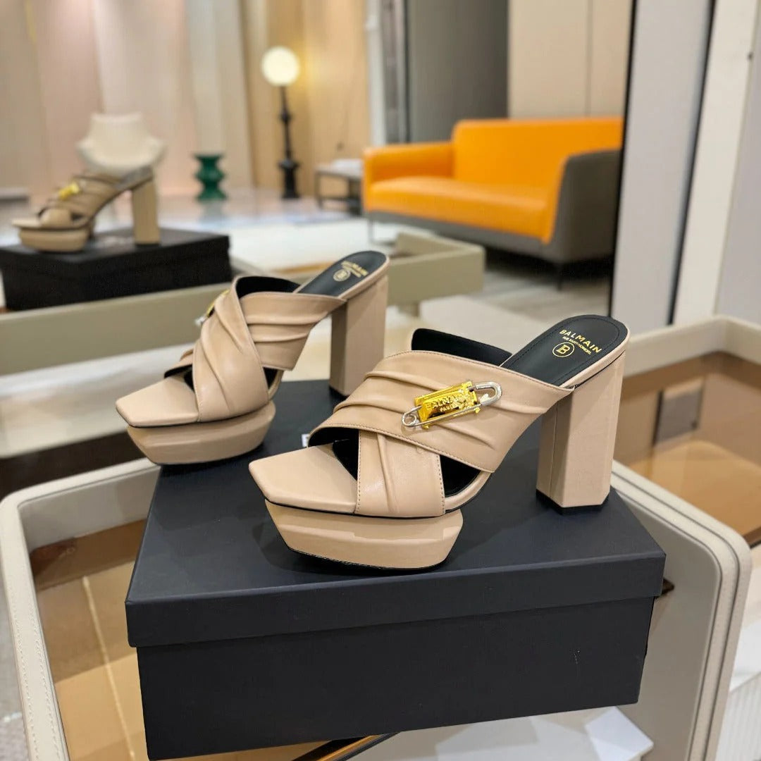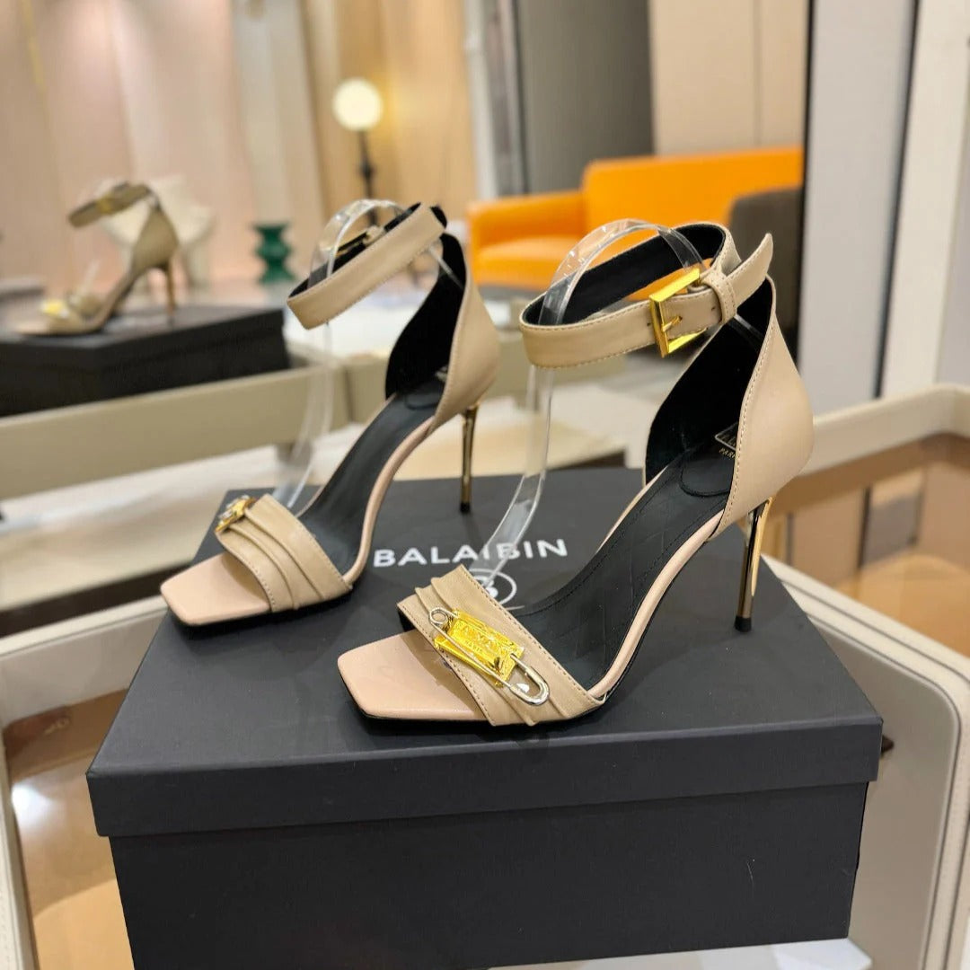 BALMAIN 25S SQUARE STRAP HIGH HEELS 100MM IN BEIGE GRAY CALFSKIN