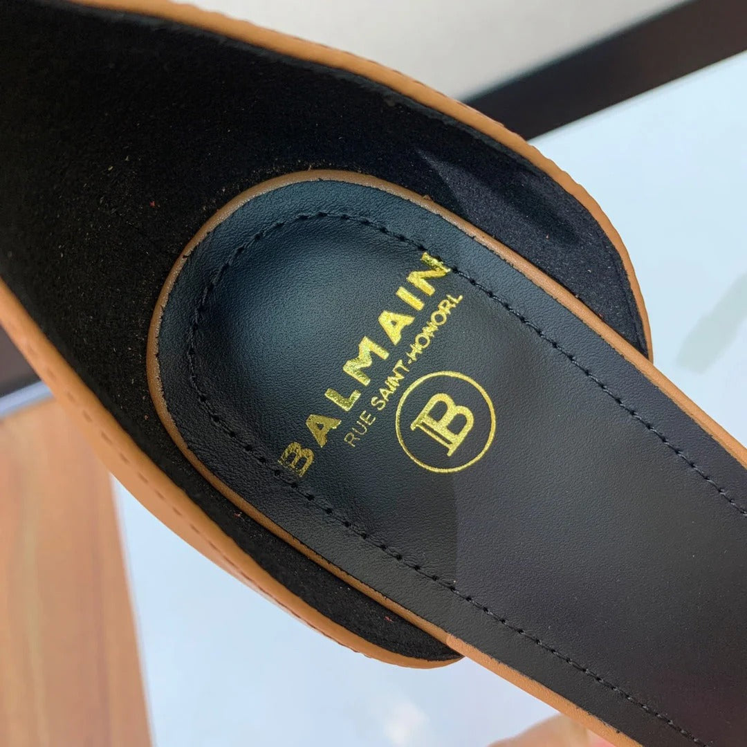 BALMAIN 25S METAL STRAP HIGH HEELS 95MM IN BLACK SUEDE GOLD HARDWARE