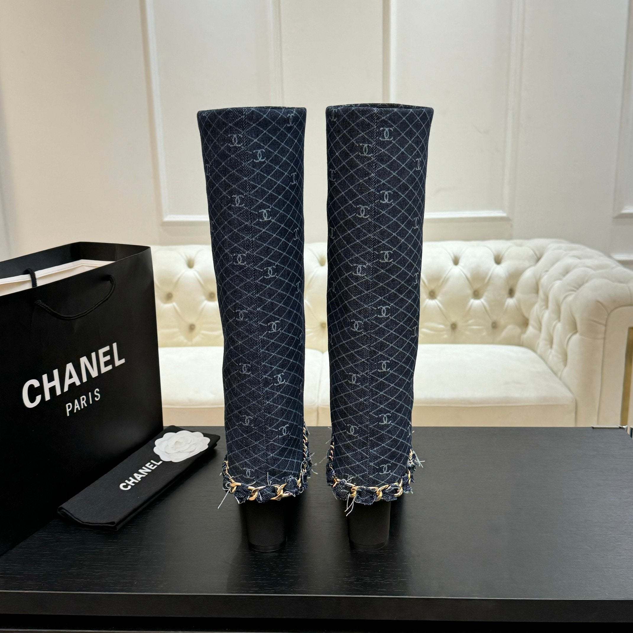 CC 25B High Boots Navy Blue Denim With Chain Black Grosgrain 373807