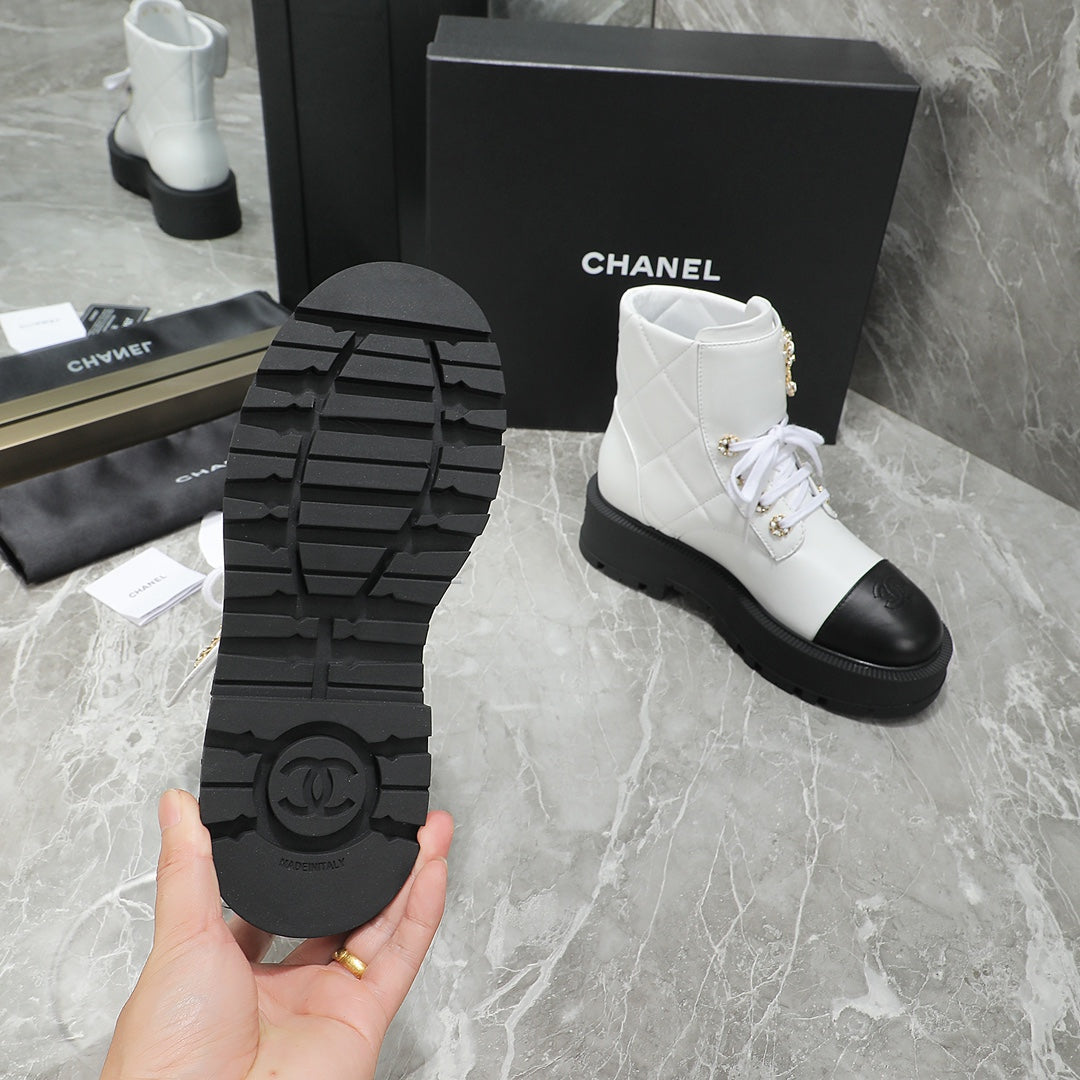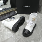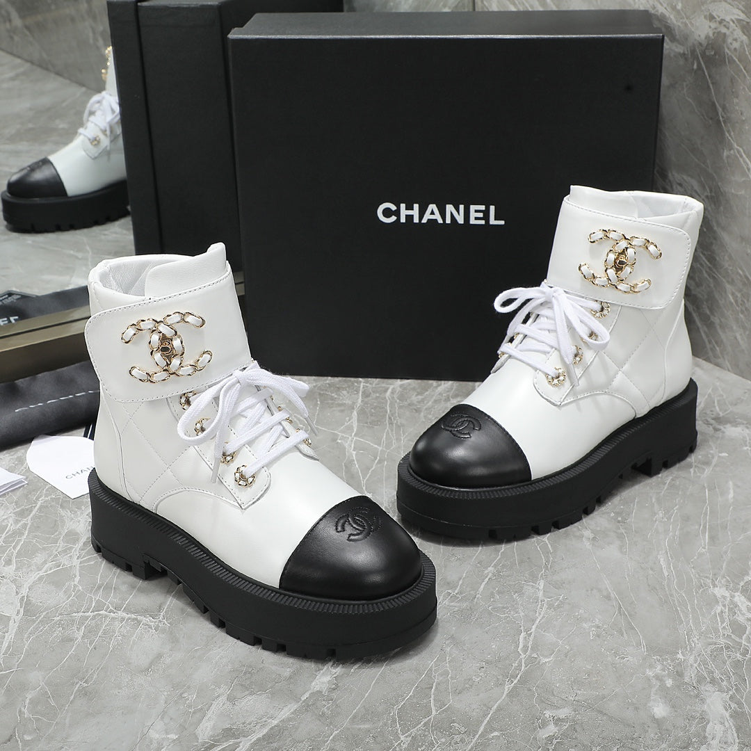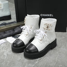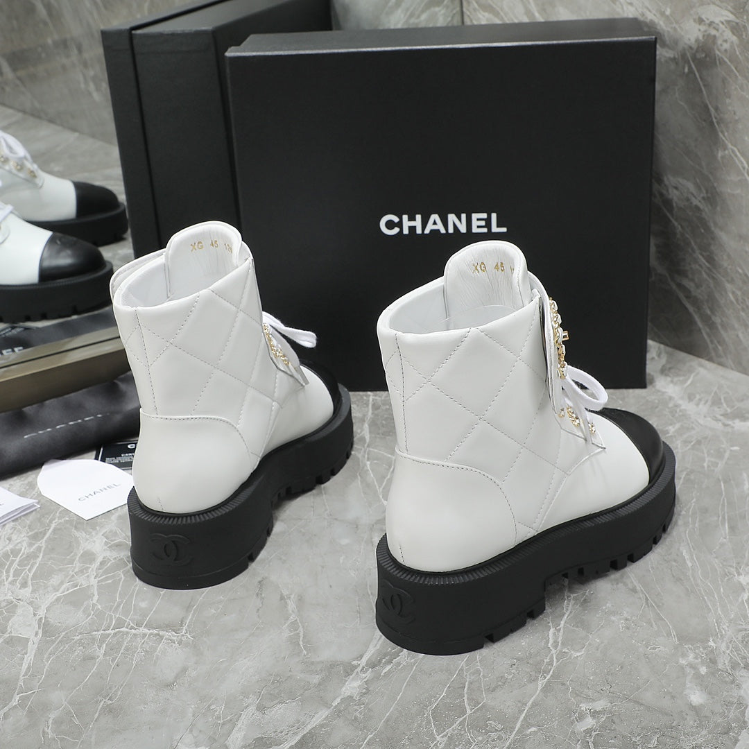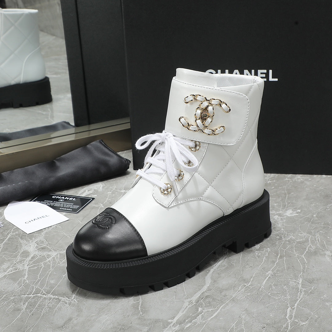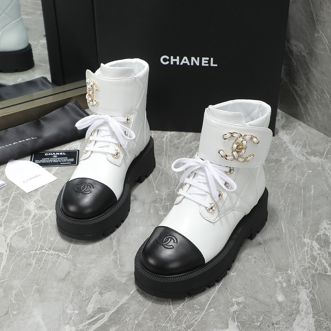 CC Interlocking Logo Combat Boots In Black White Quilted Lambskin 432655