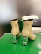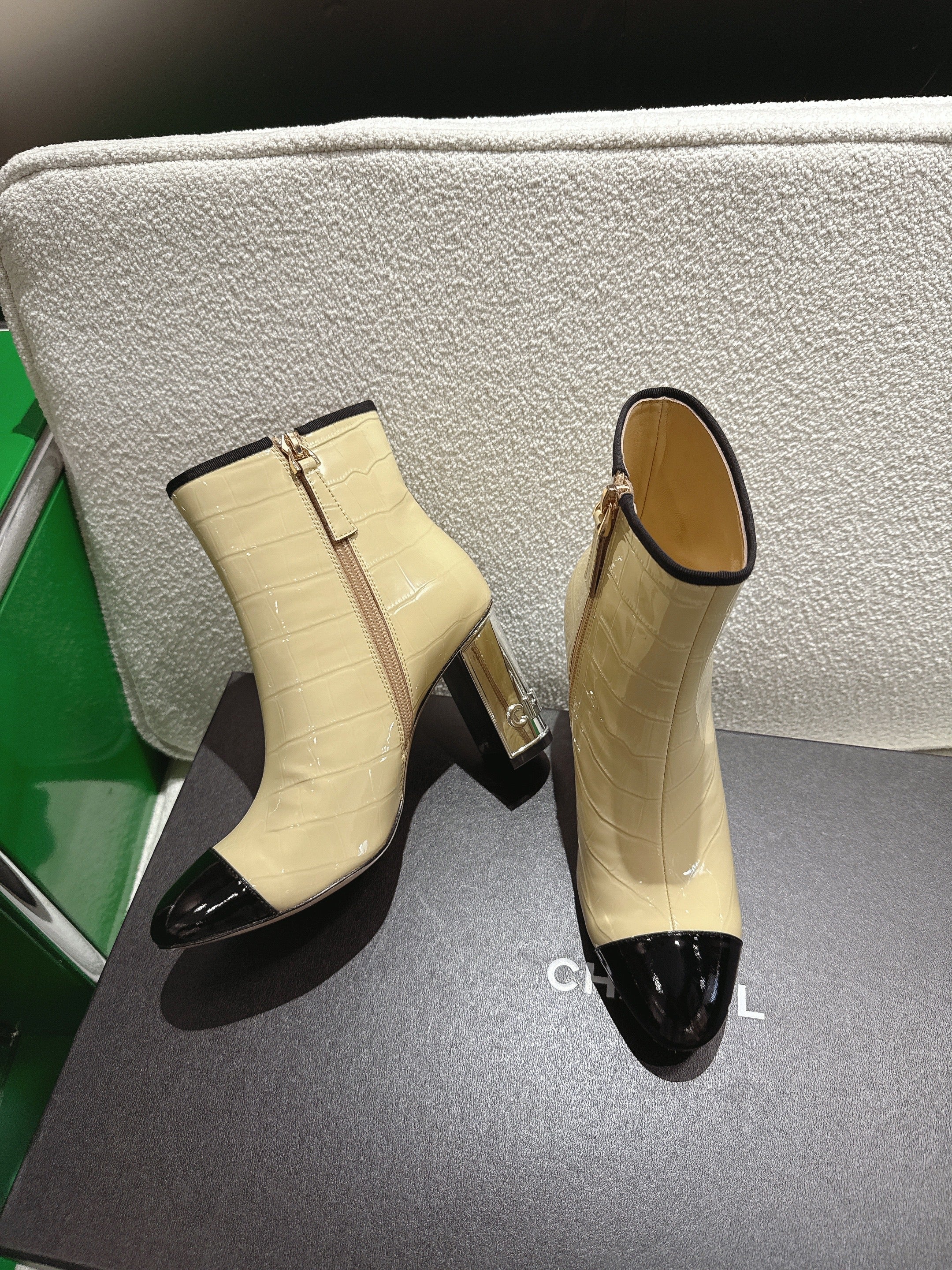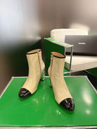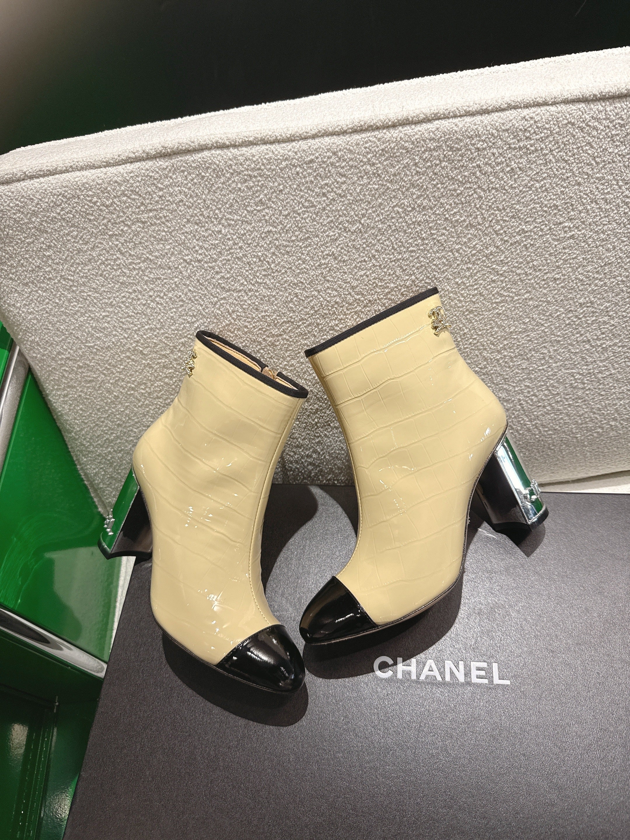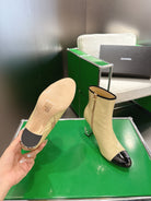 Chanel 2025ππ High Heeled Ankle Boots Light Beige & Black Glossy Leather 507545