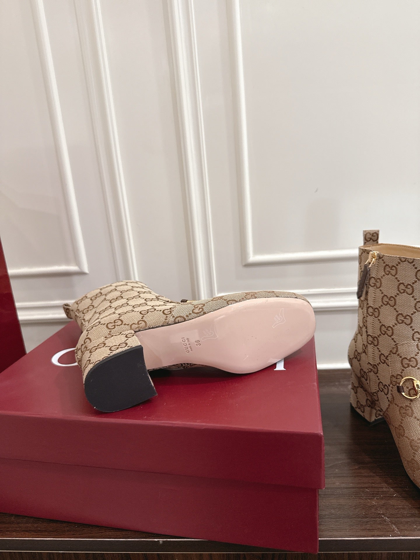 Gucci Horsebit Chunky Heel Ankle Boots Brown Beige Cowhide Fabric 490559