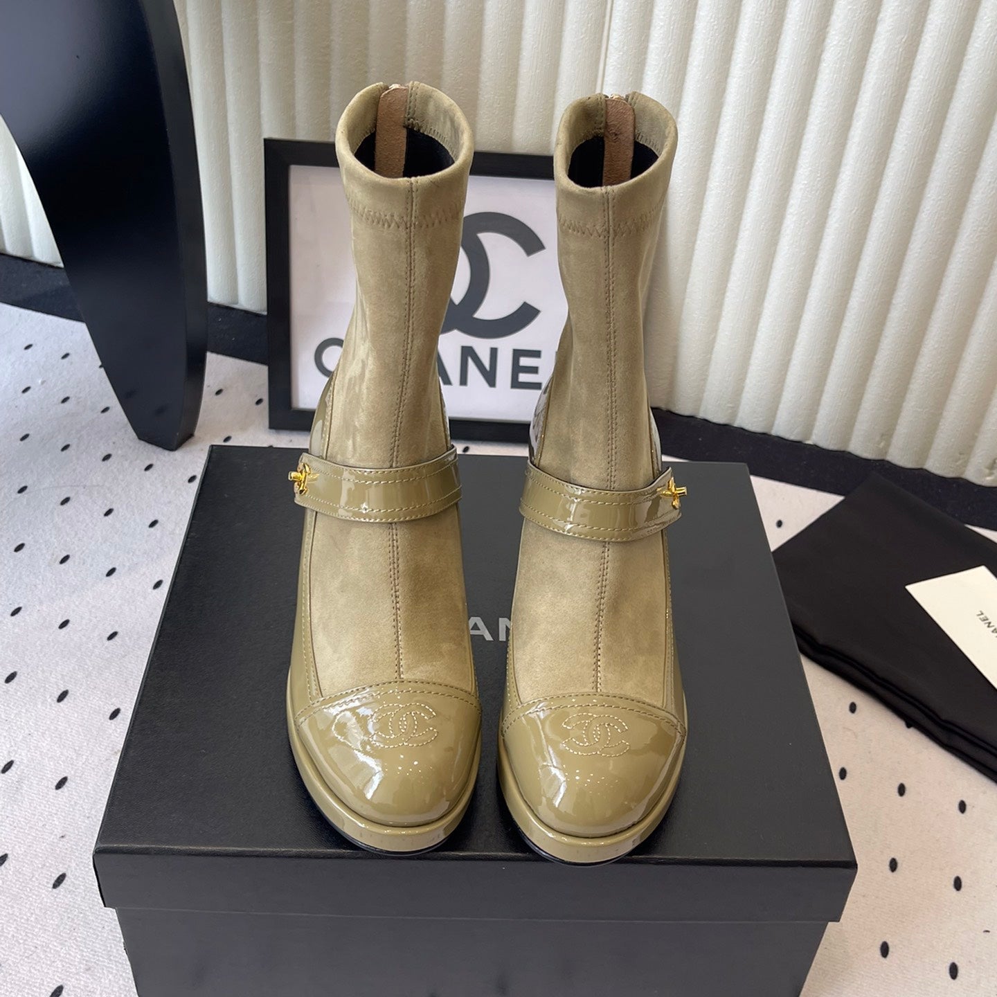 CC 25 Short Boot Olive Green Suede Patent Leather 514104