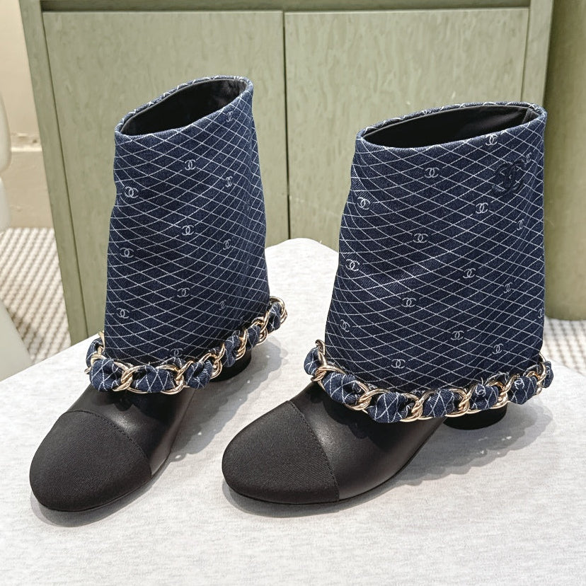 CC 25 Long Boot Navy Blue Black Denim Fabric Calfskin 515273