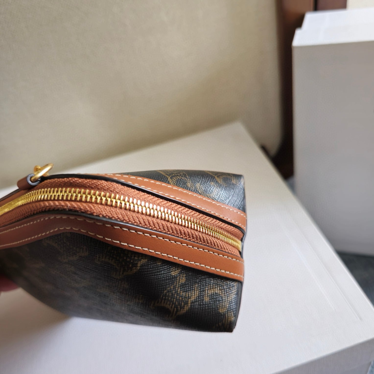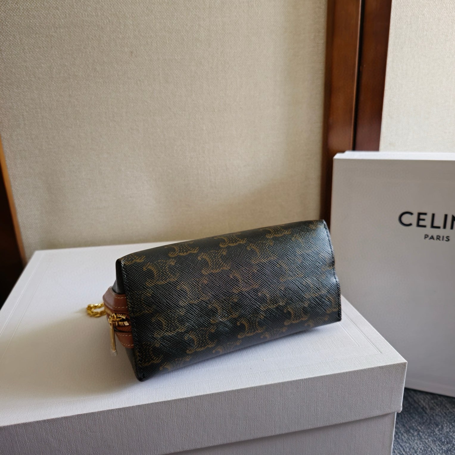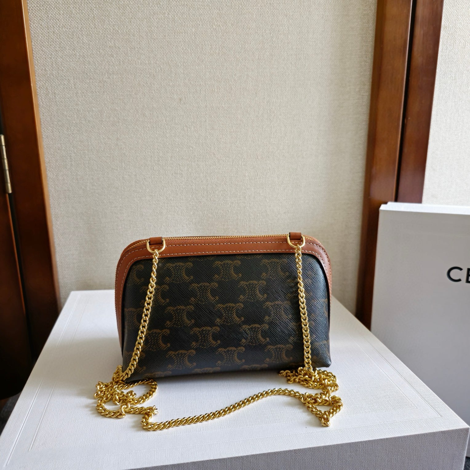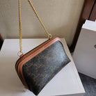 CELlNE Triomphe Clutch On Chain Bag 16cm Brown Canvas And Tan Leather