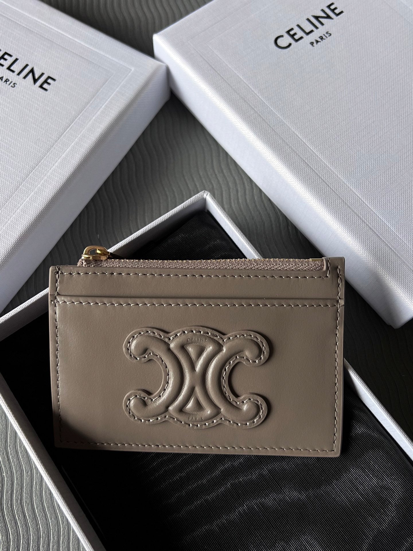 TRIOMPHE Zipped Card Holder Modern Taupe Cowhide Leather