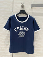 Celine 25 Arc de Triomphe Letter Short Sleeve T-shirt Navy Blue mix White Cotton