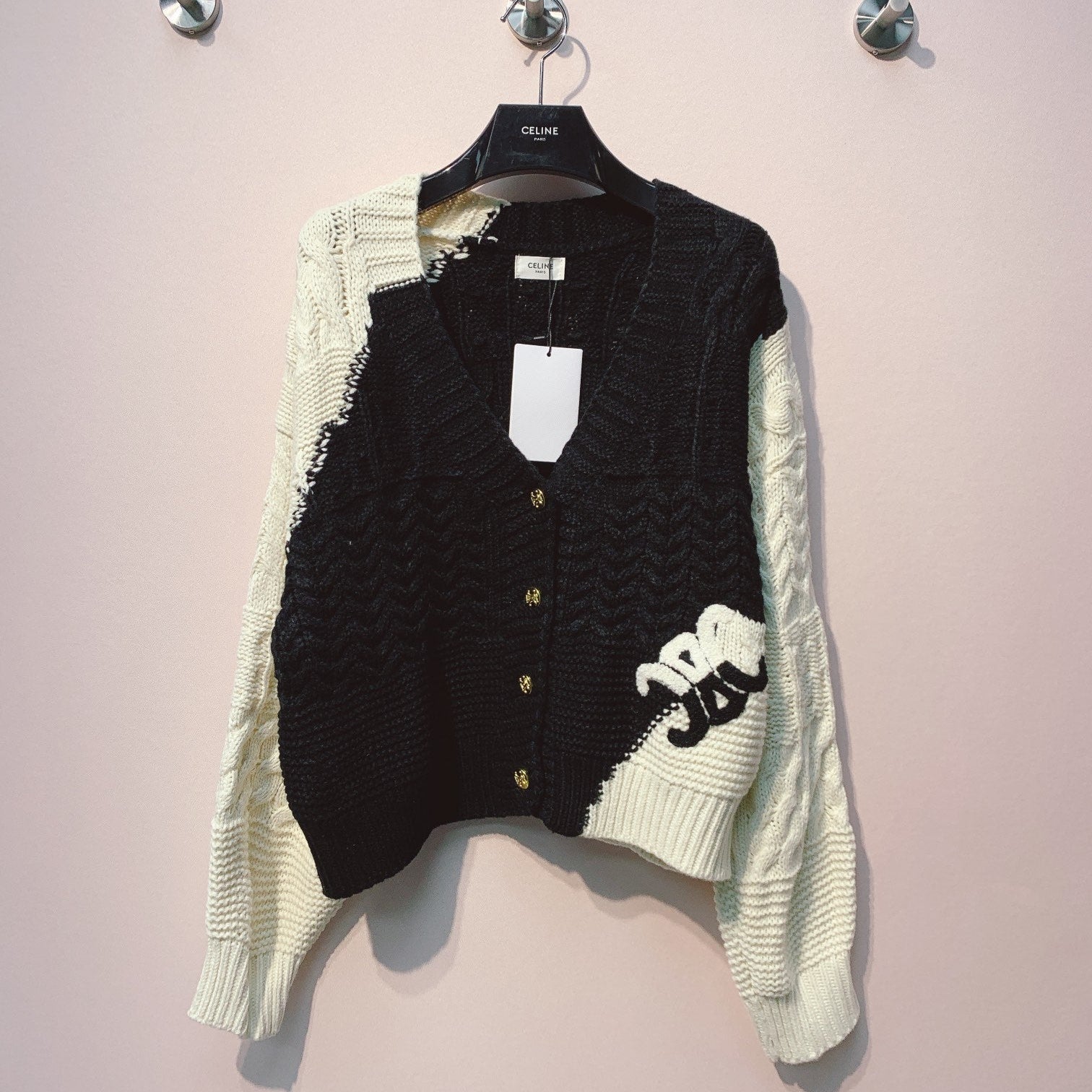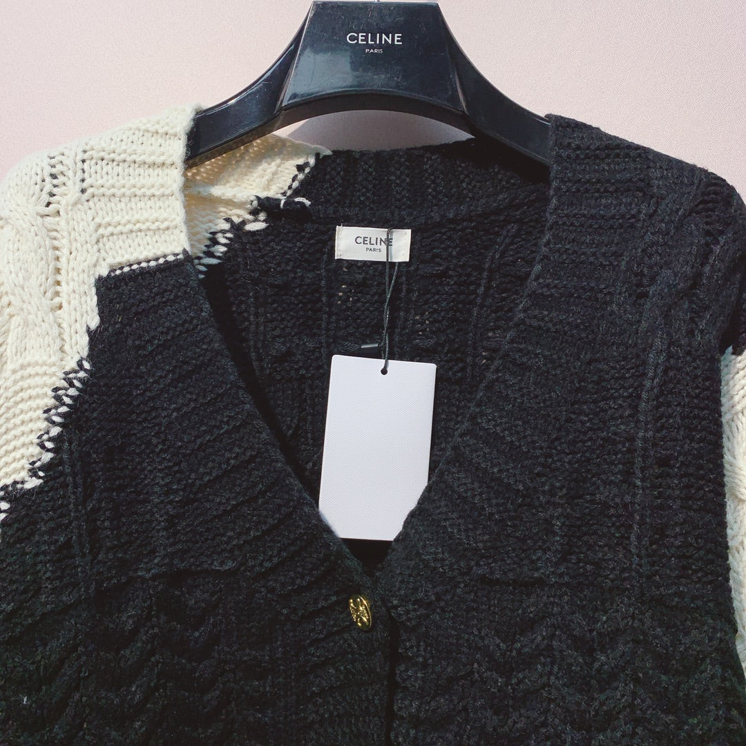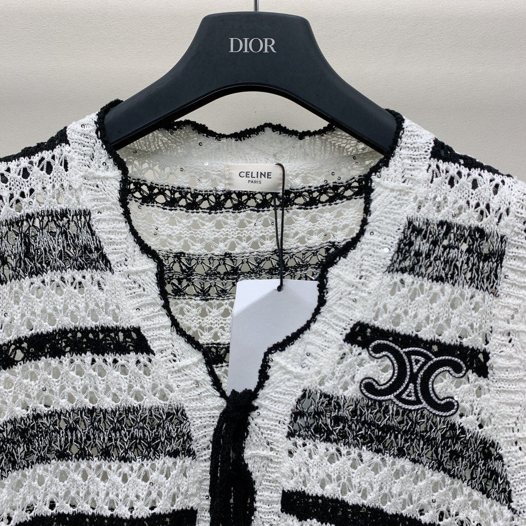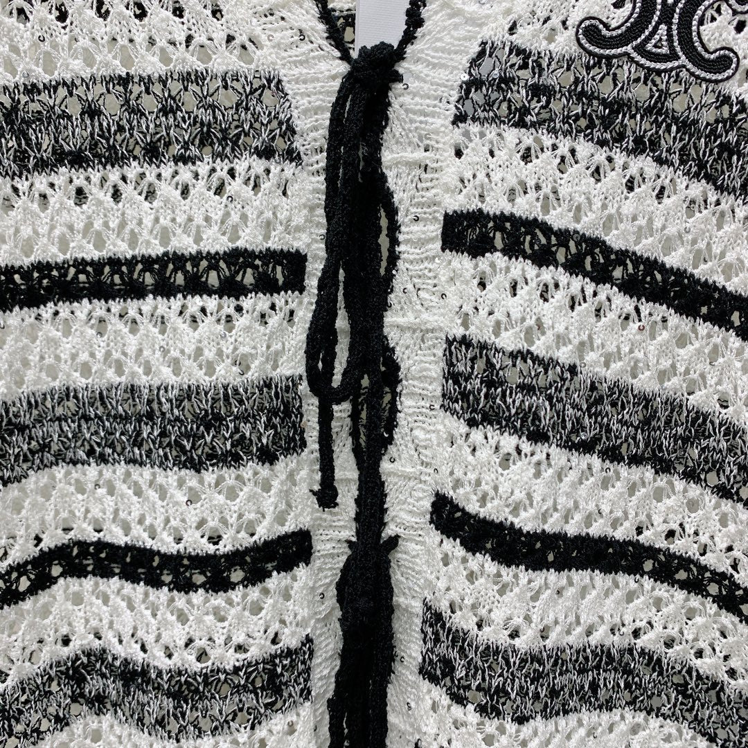 Celine 25 Hollow Crochet Cardigan Black White Wool Polyester 277568