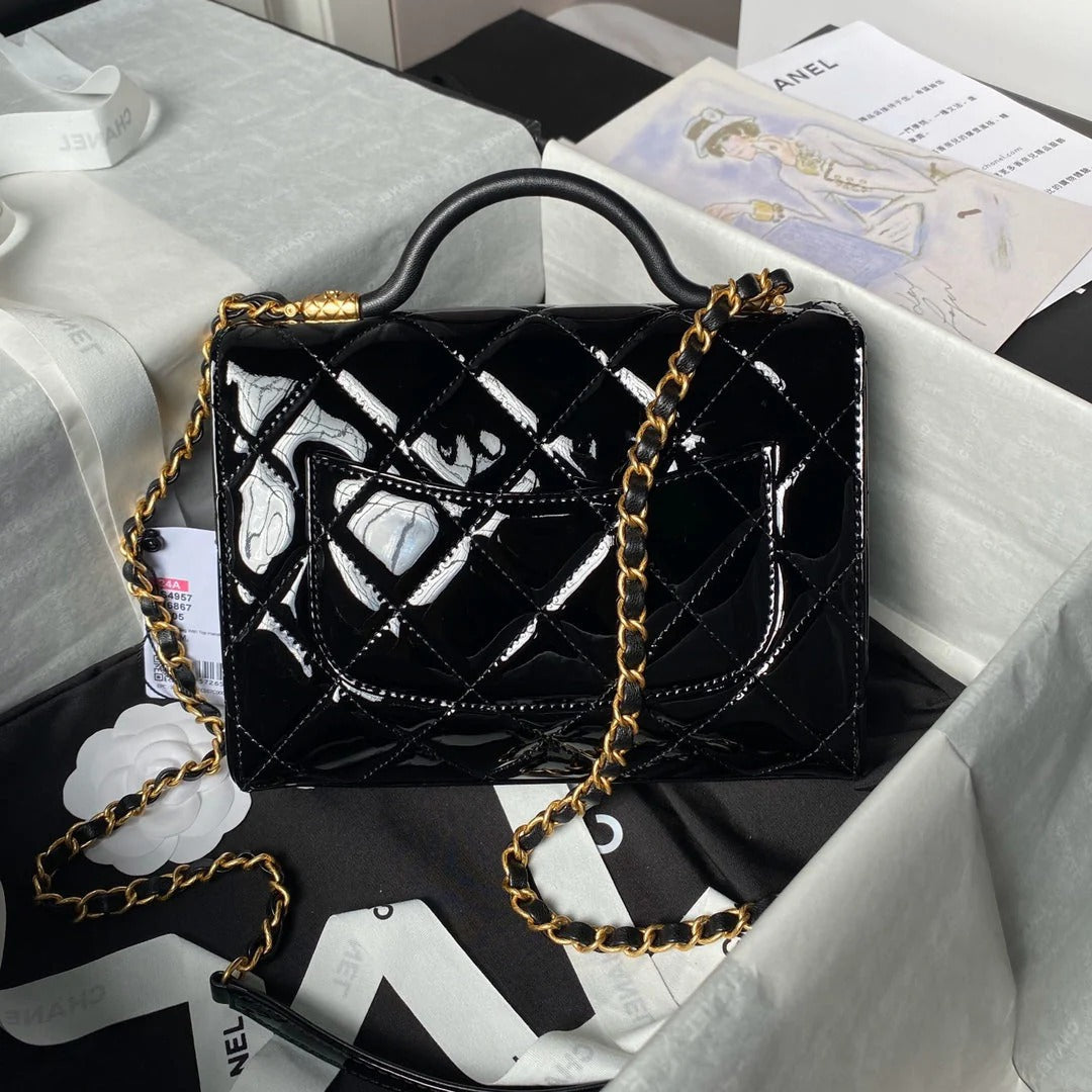 CC 25S FLAP BAG 18 CM IN BLACK PATENT LAMBSKIN WITH TOP HANDLE