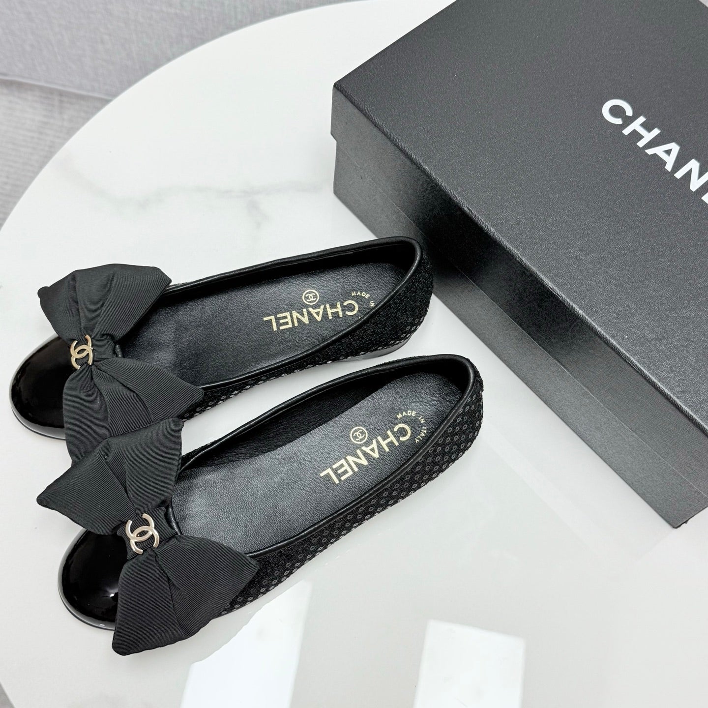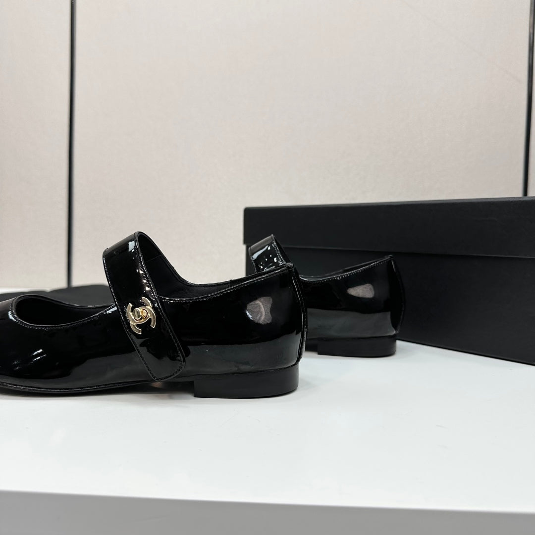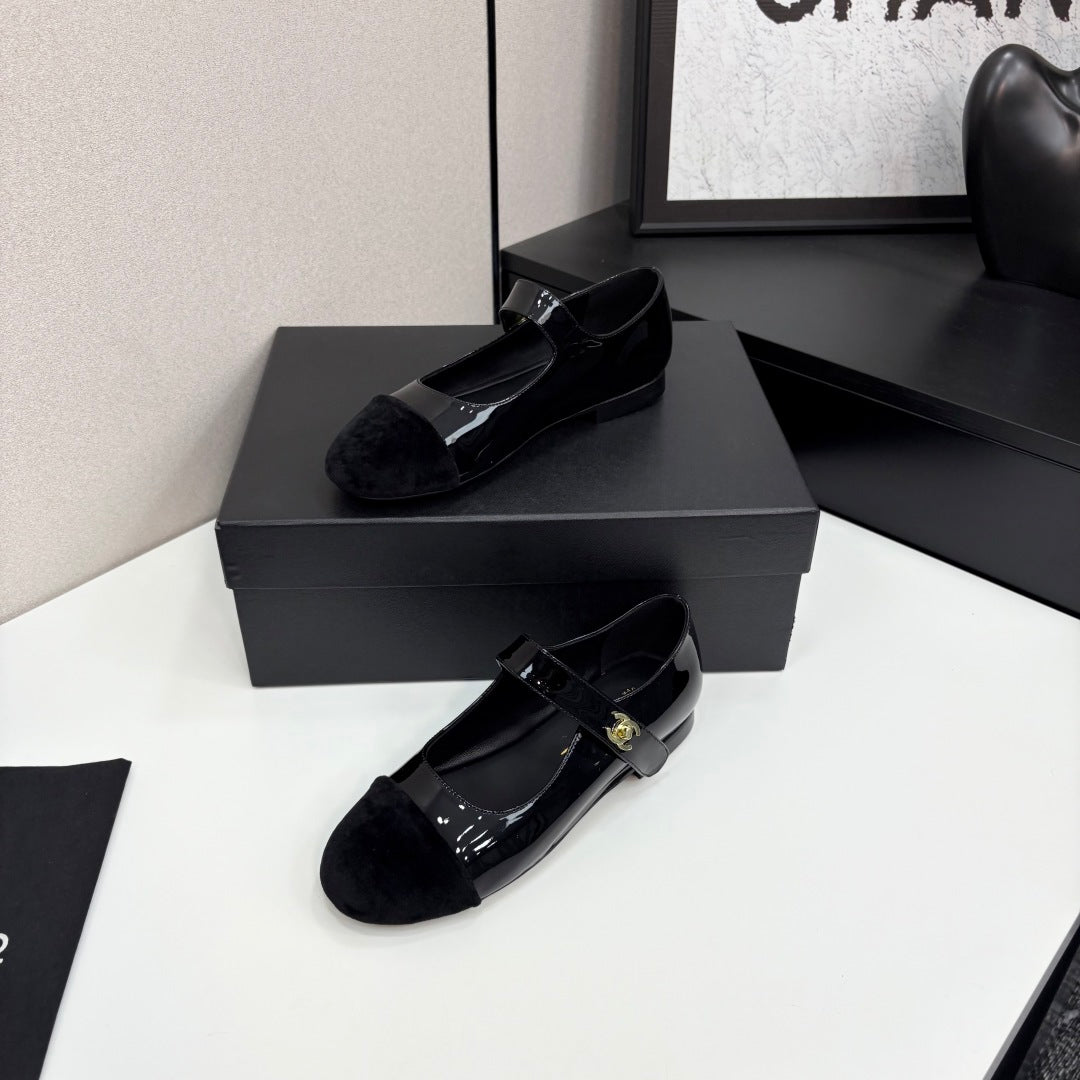 CC 25P Ballet Flat Flower Black Calfskin Patent Calfskin