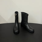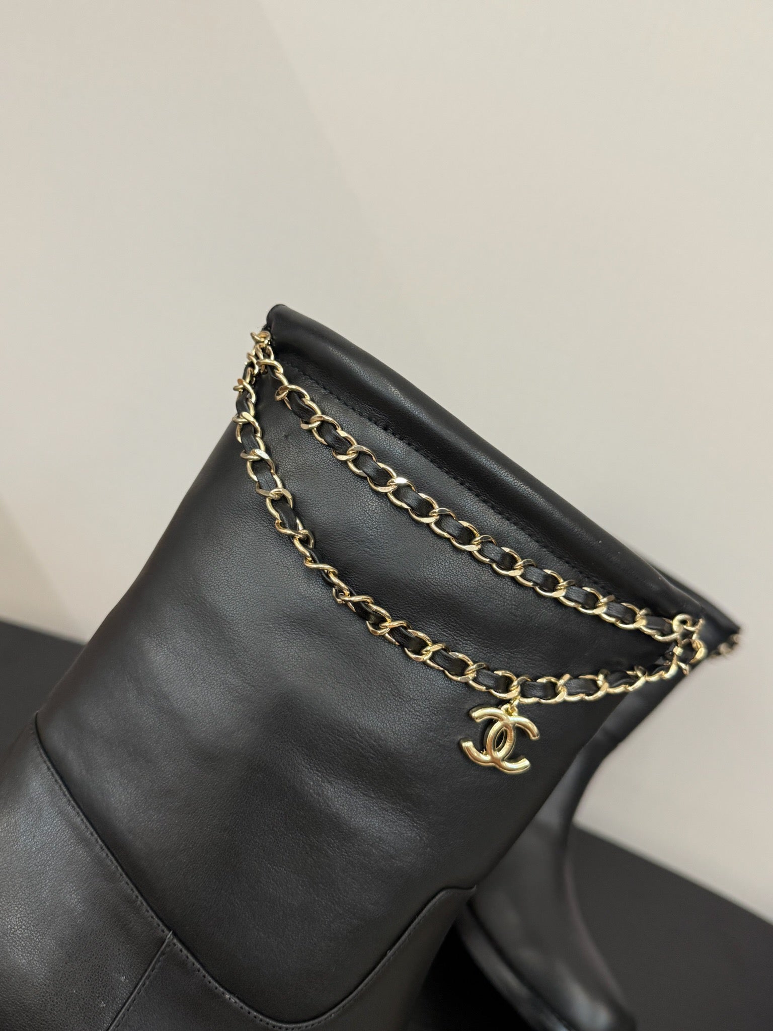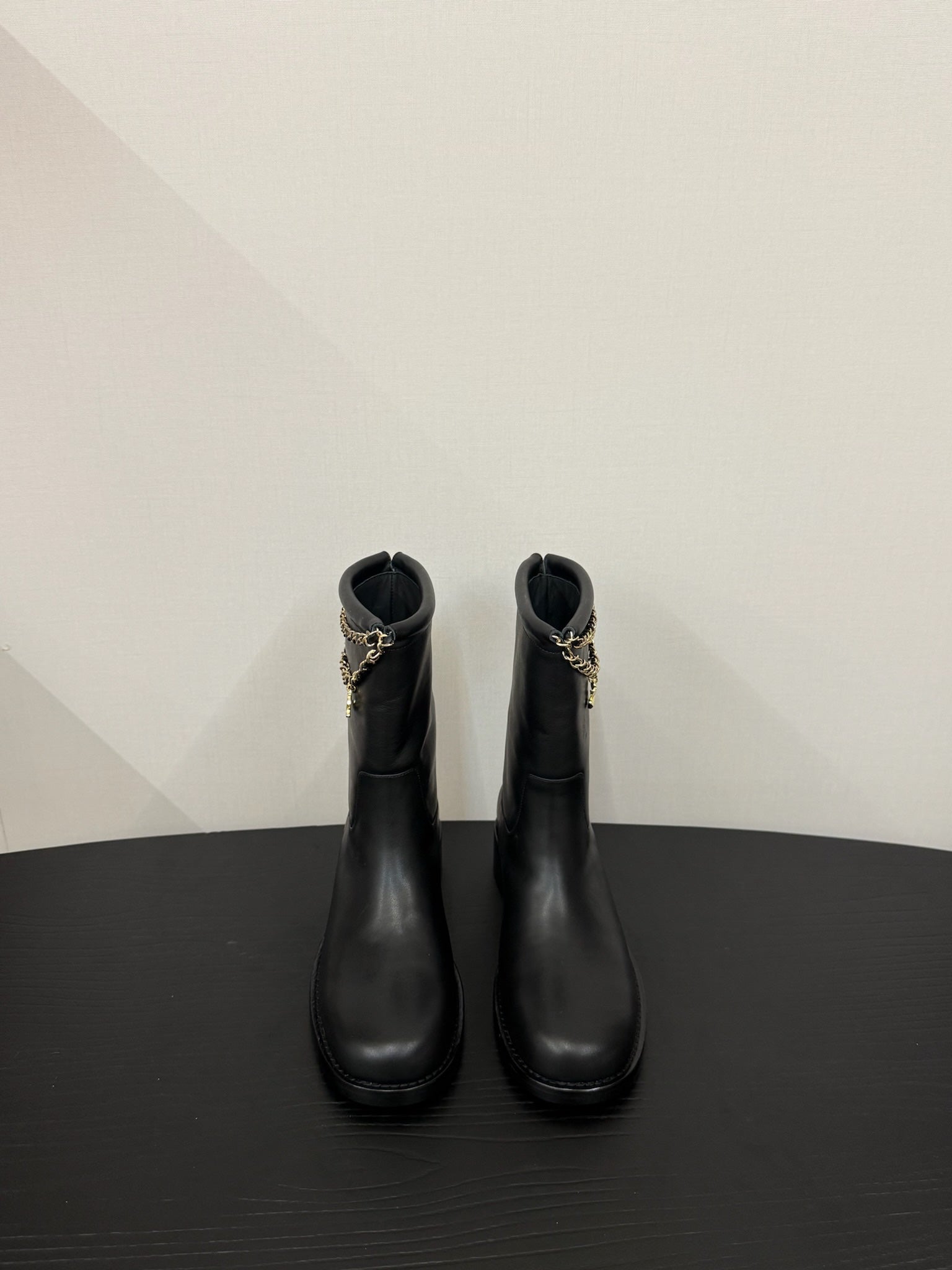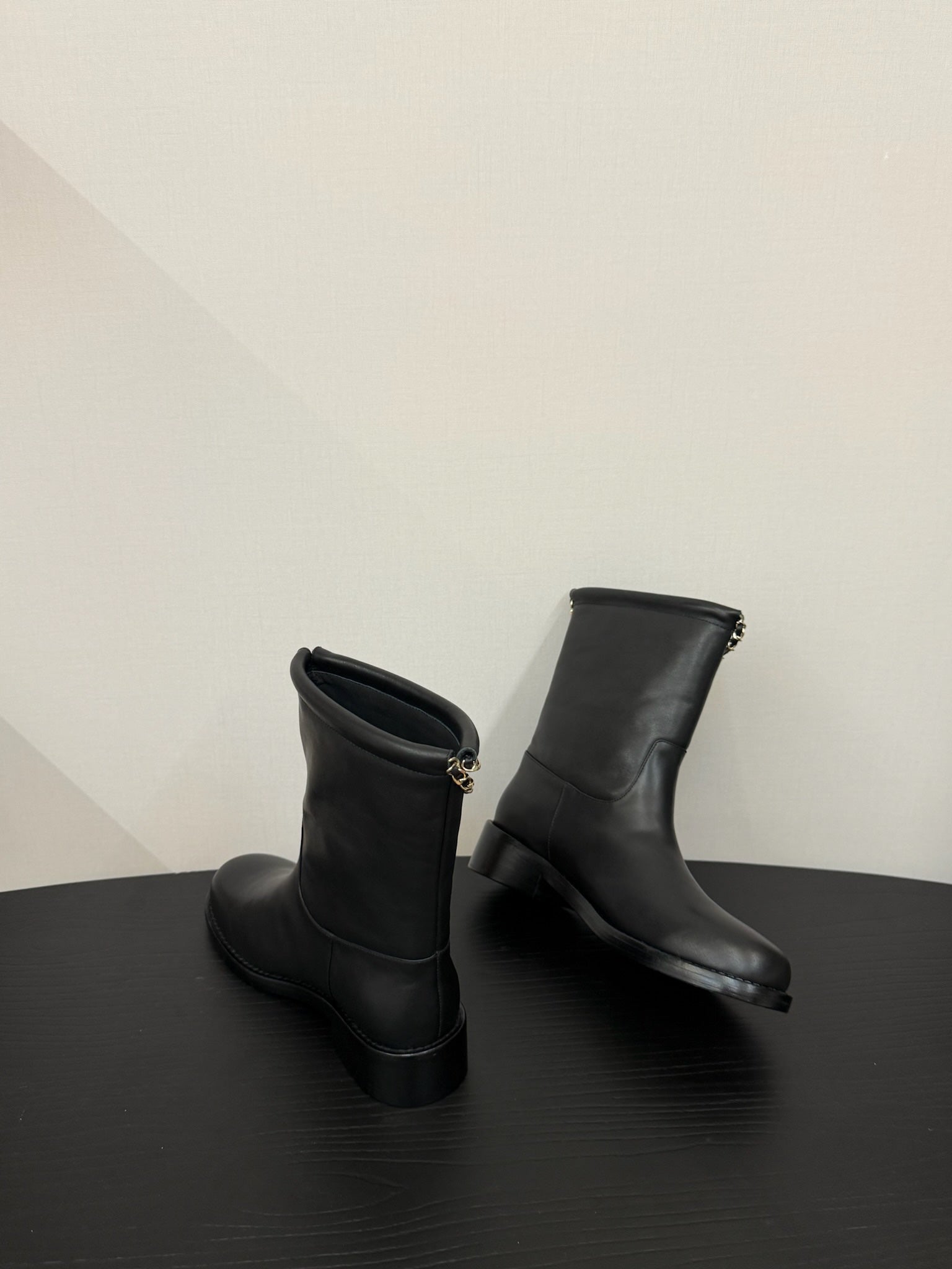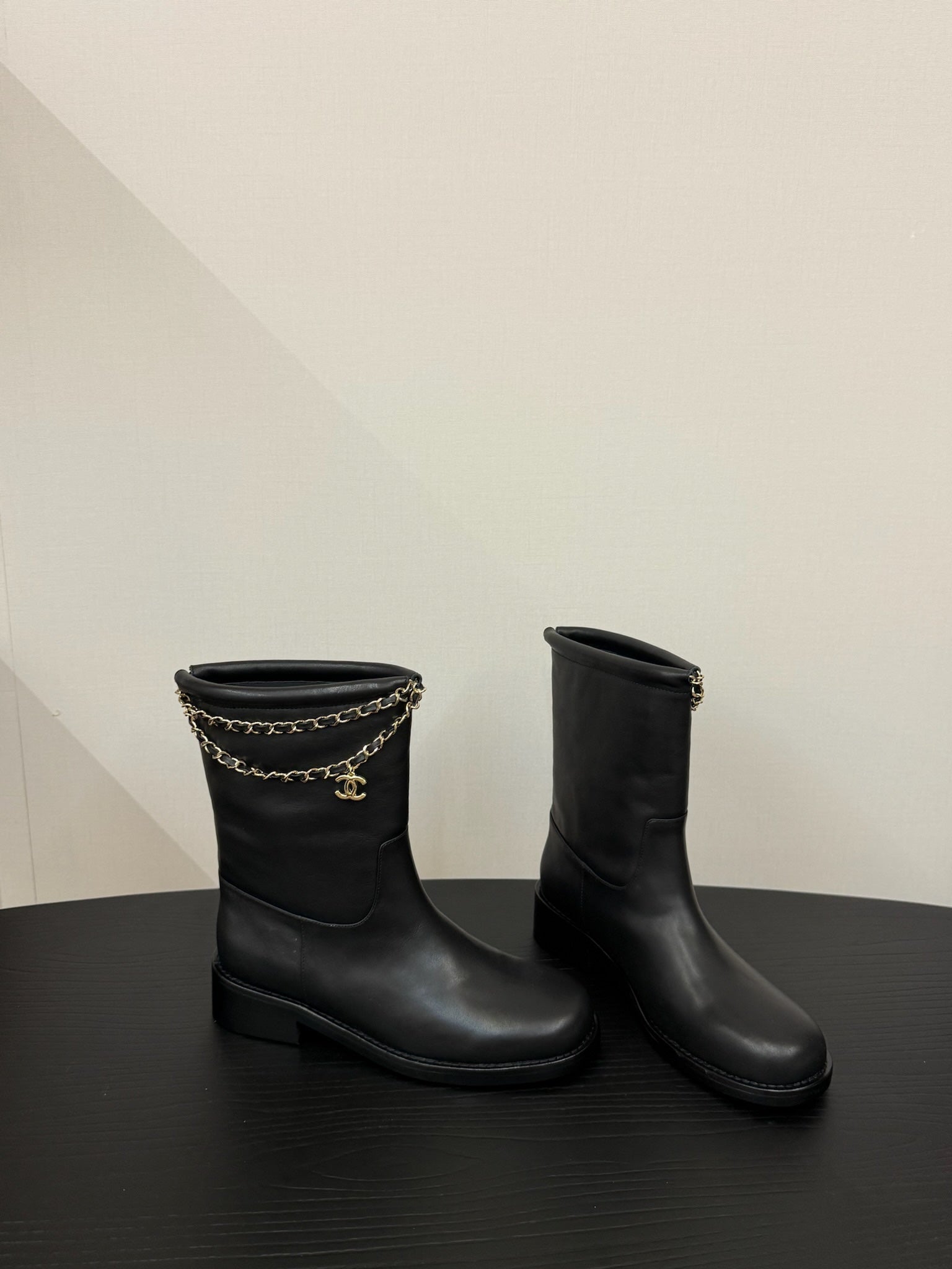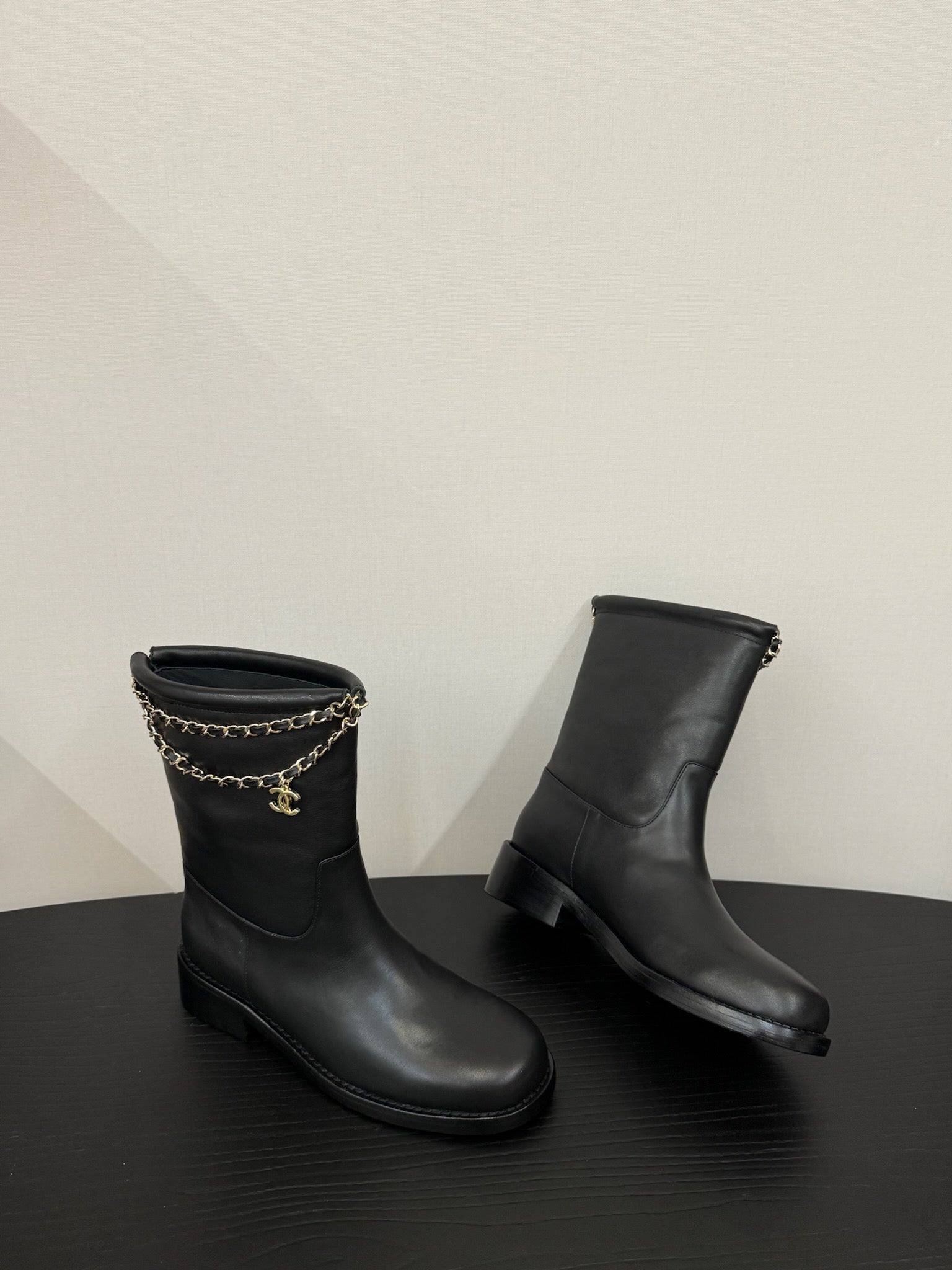 CC 25s Short Flat Chain Knight Boots Black Leather 417841