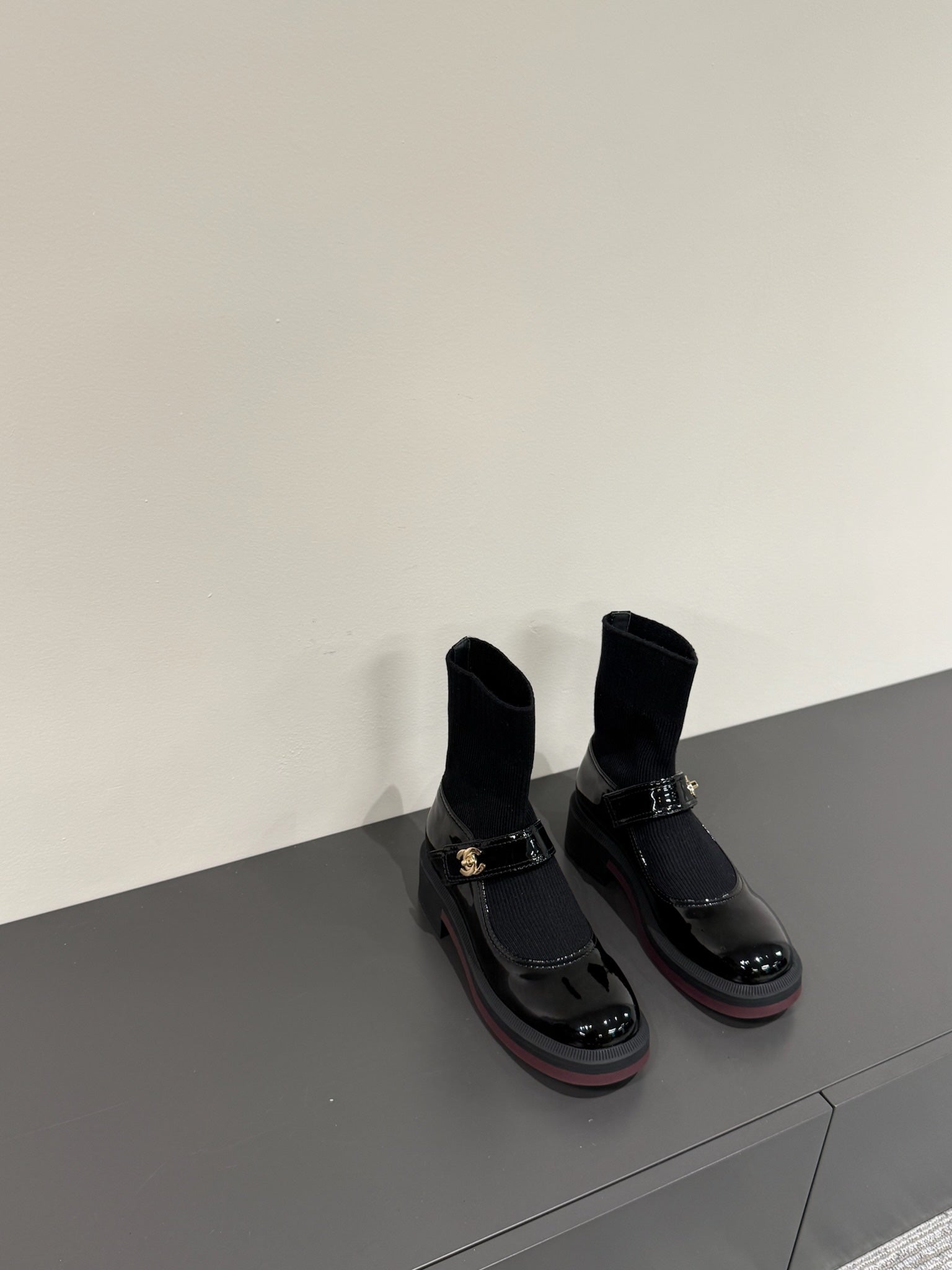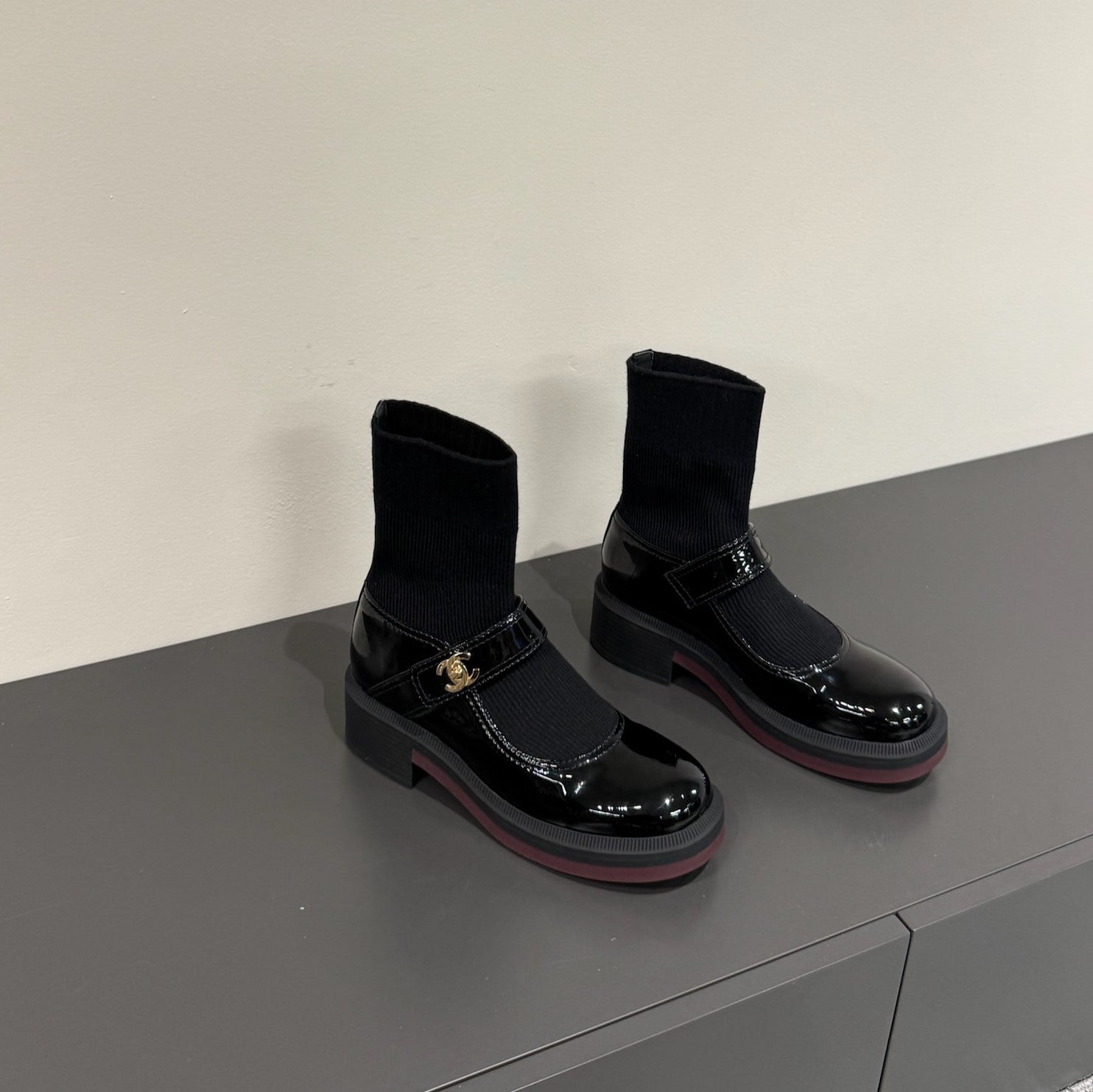 CC 25ss Short Sock Boots Black Patent Leather& Wool 417818