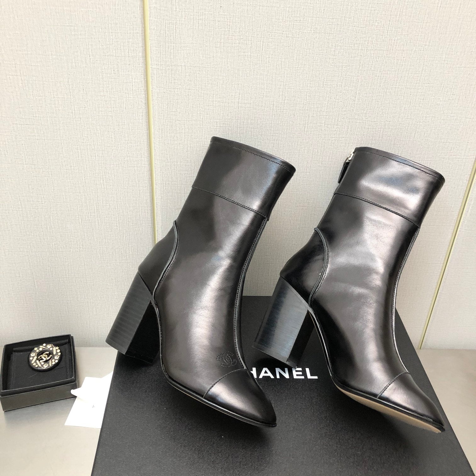 Chanel 2025𝐒𝐒 High Heeled Ankle Boots Black Glossy Leather 507547