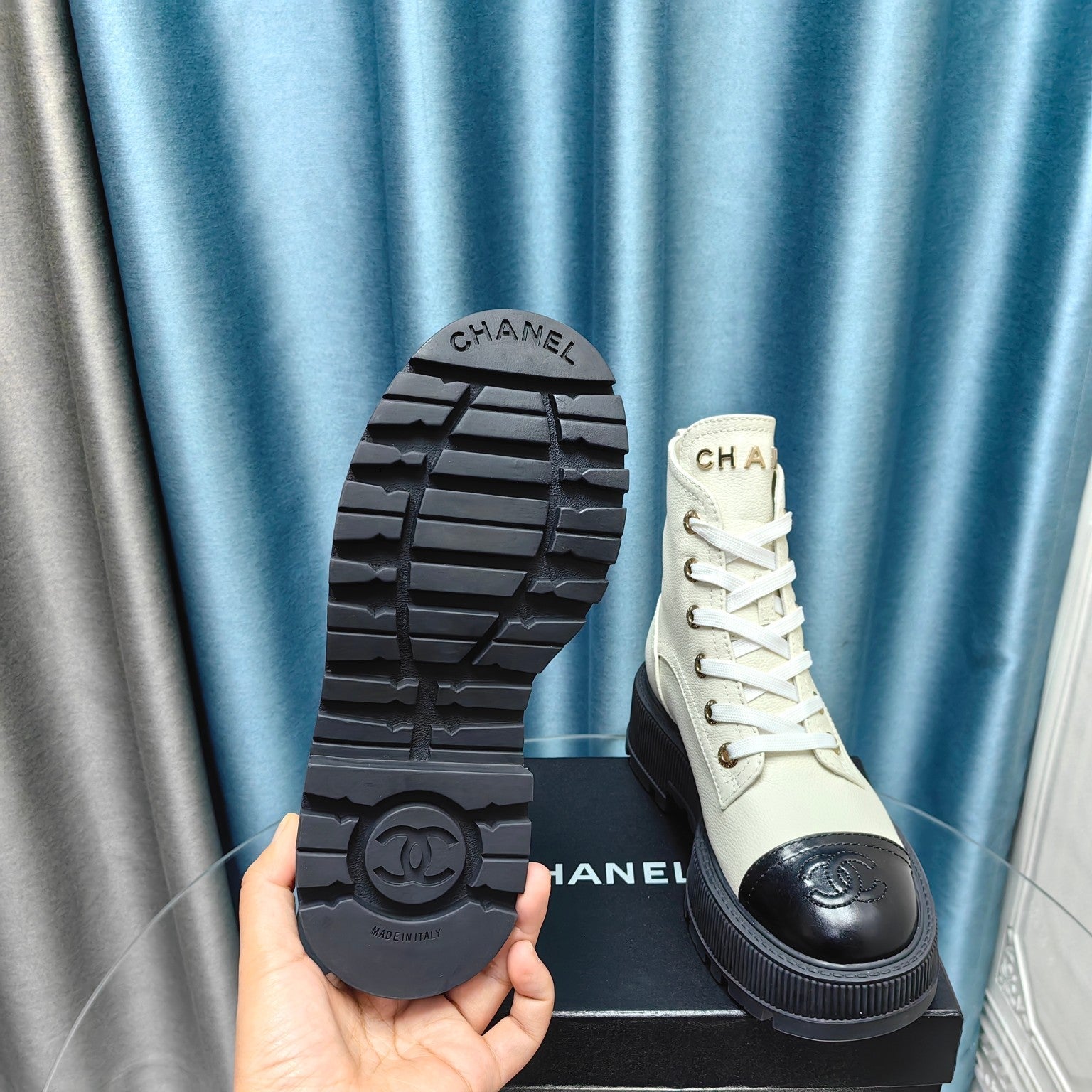 Chanel High-Top Boots Platform Heel 7cm Cream Glossy Leather 507533