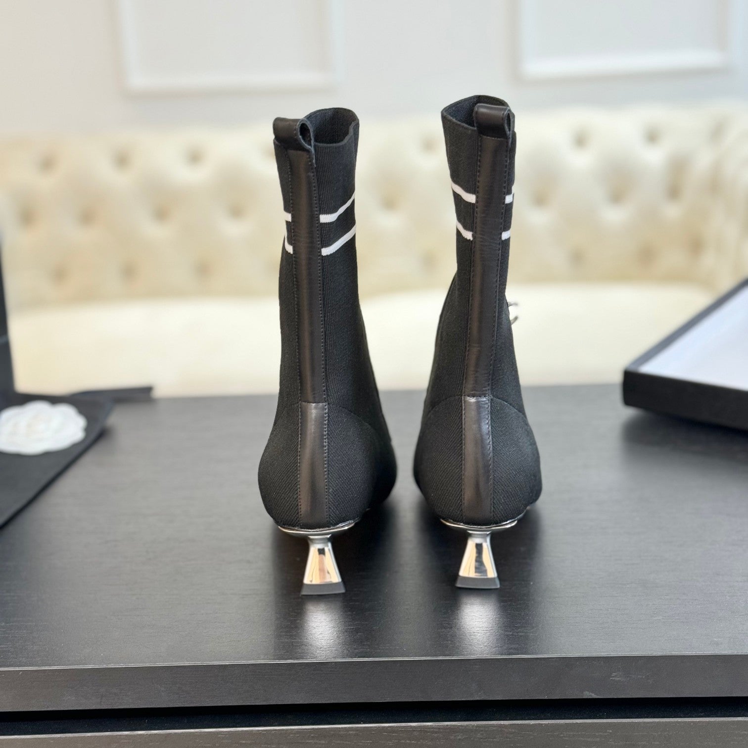 Chanel 2025𝐒𝐒 High Heeled Ankle Boots Cream and Black Glossy Leather 507546