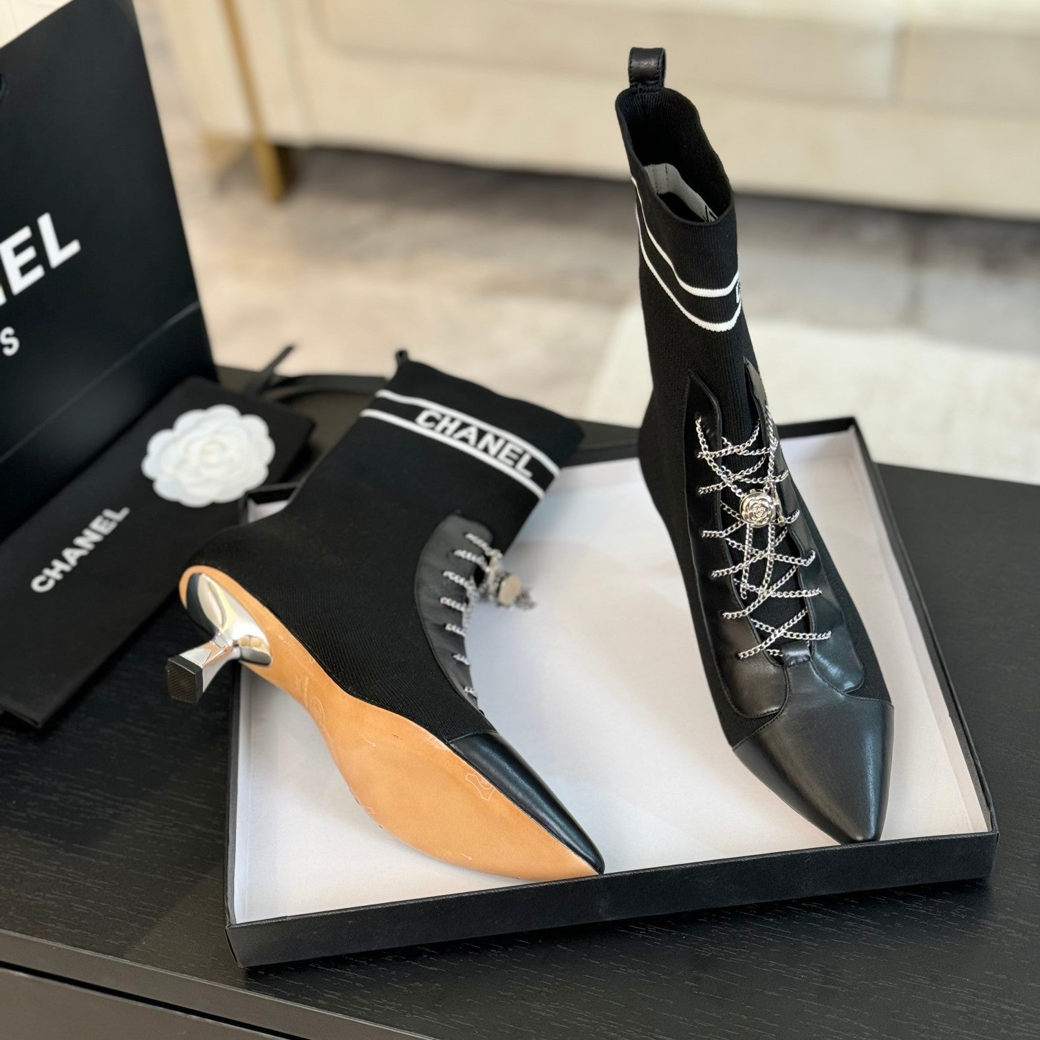 CC 25 Chelsea High Boots With Chain 85mm Black Calfskin 428221