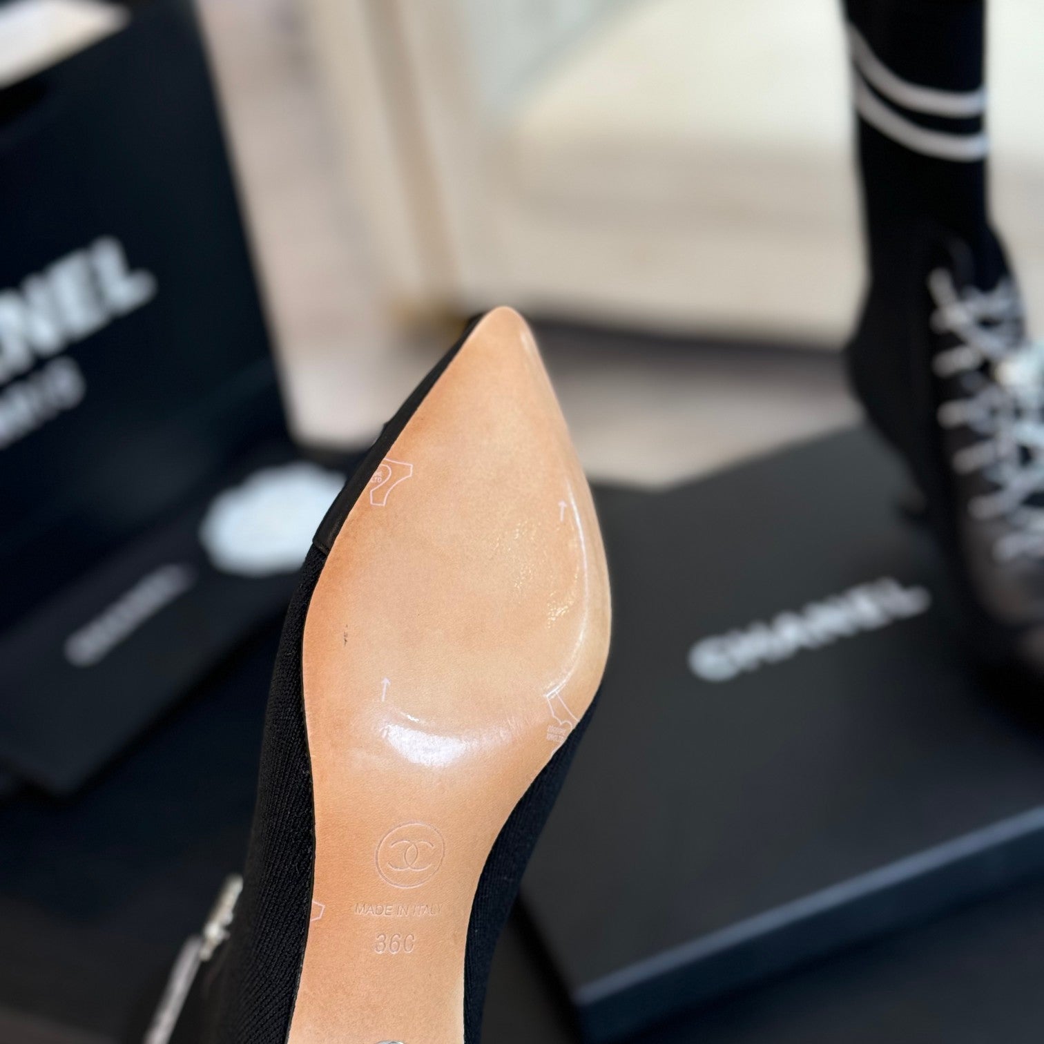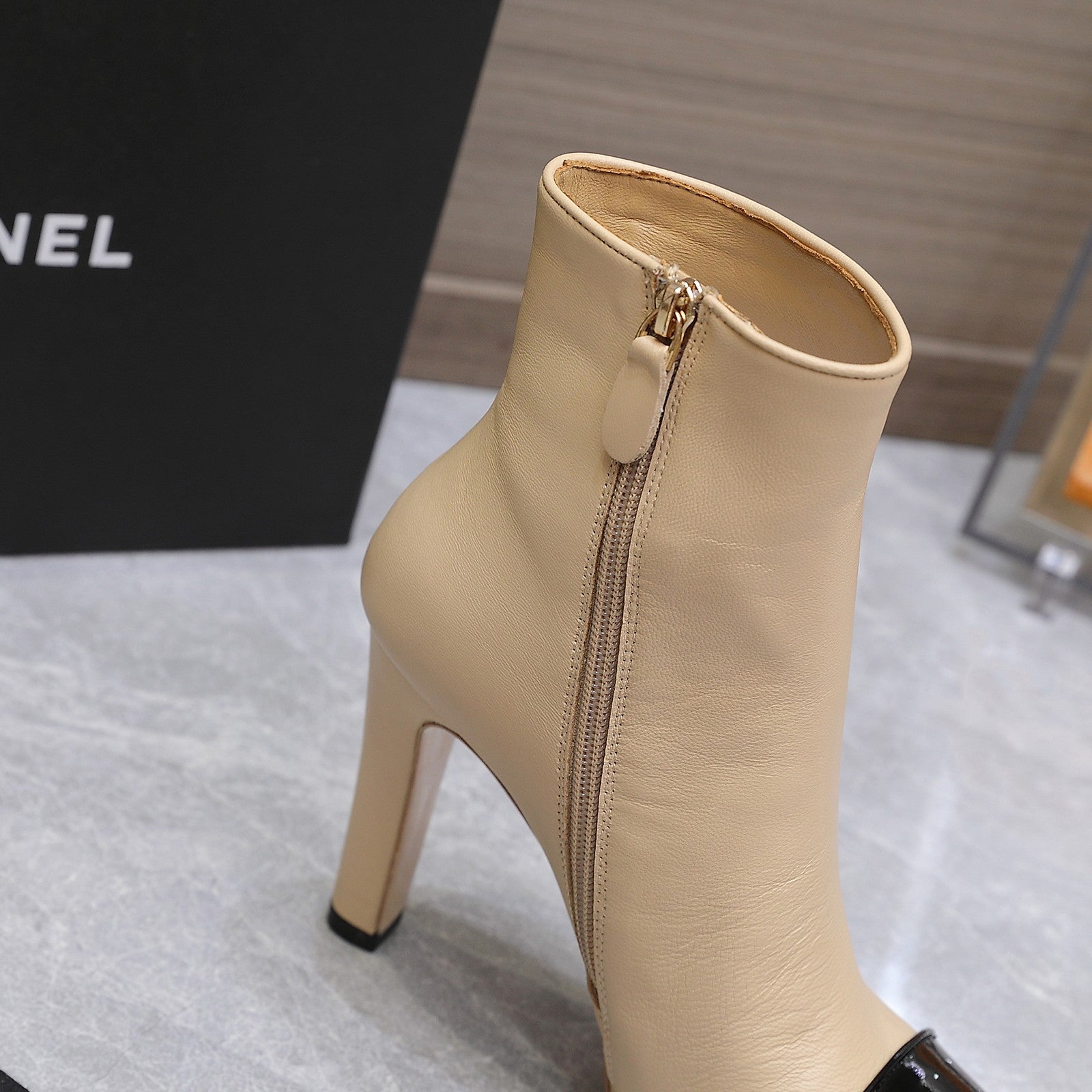 Chanel 2025𝐒𝐒 High Heeled Ankle Boots Light Beige & Black Glossy Leather 507545