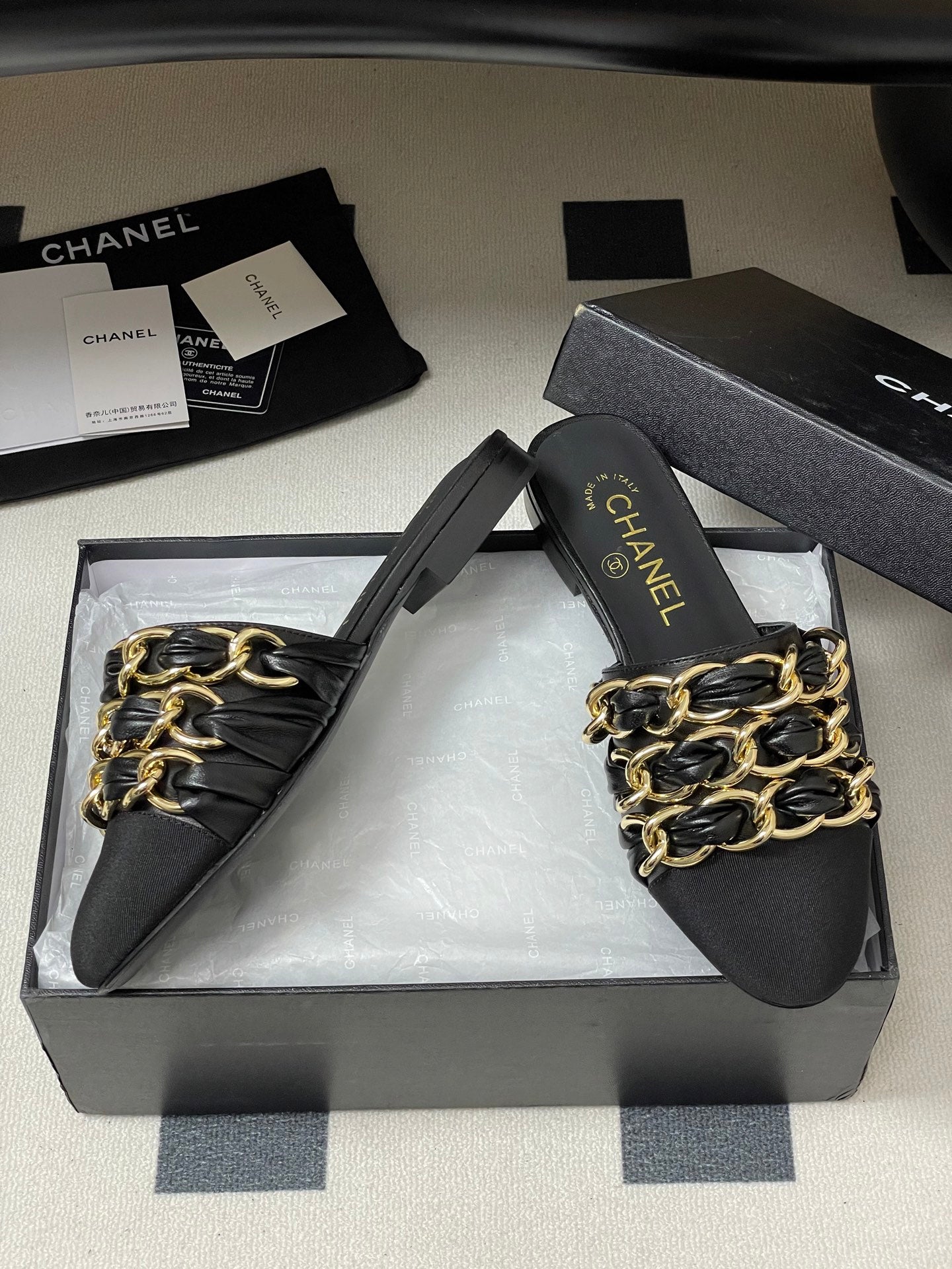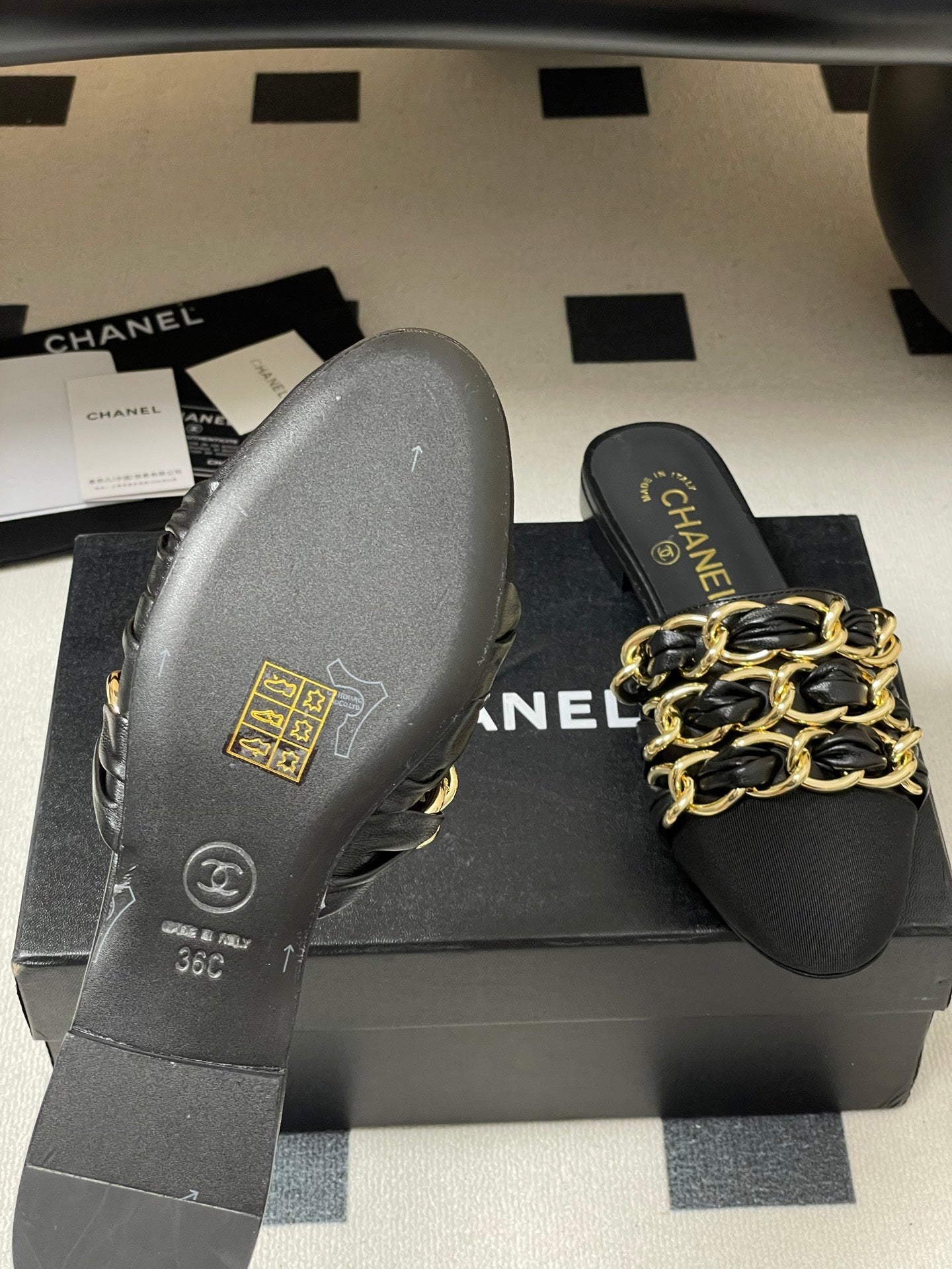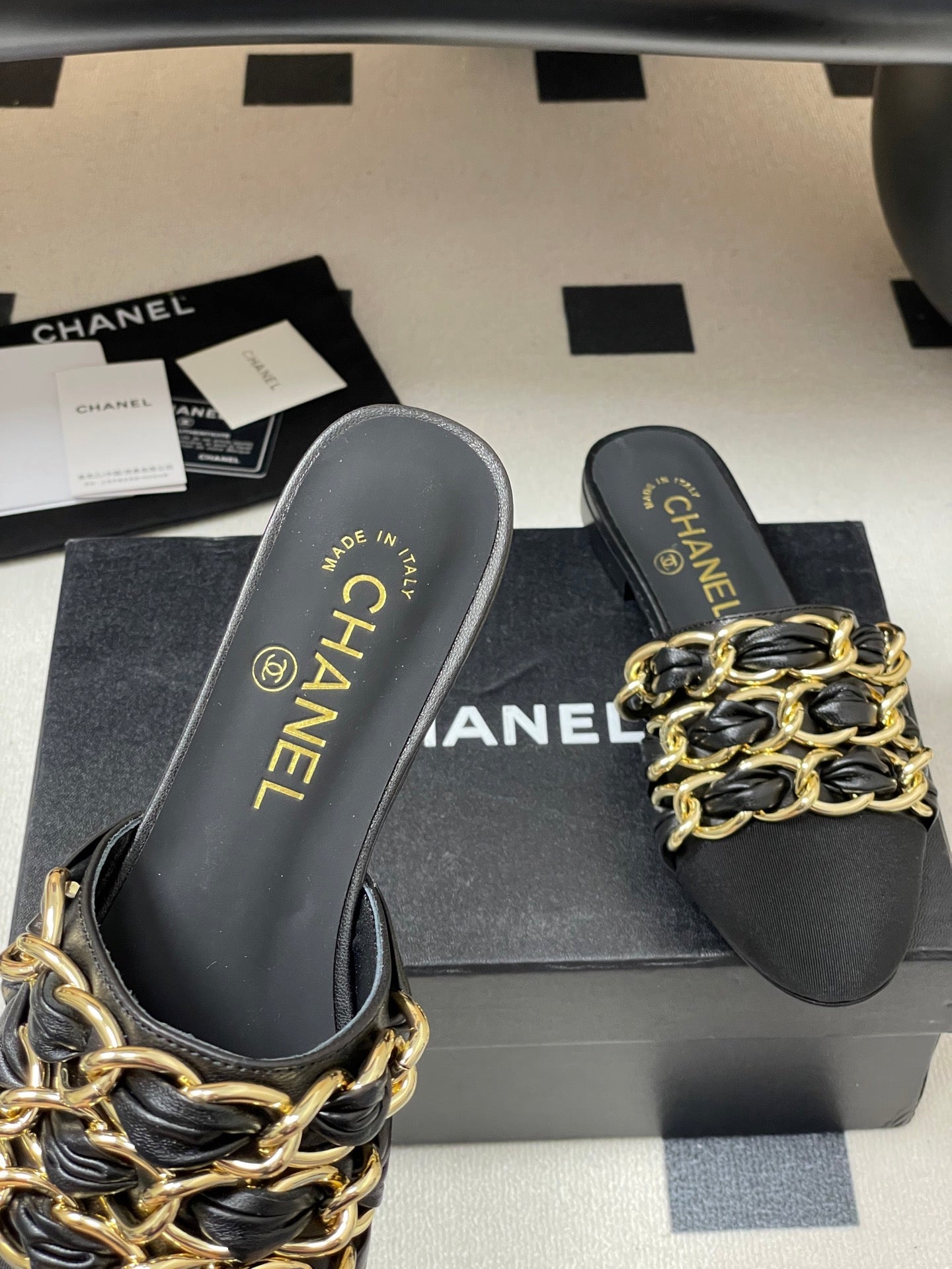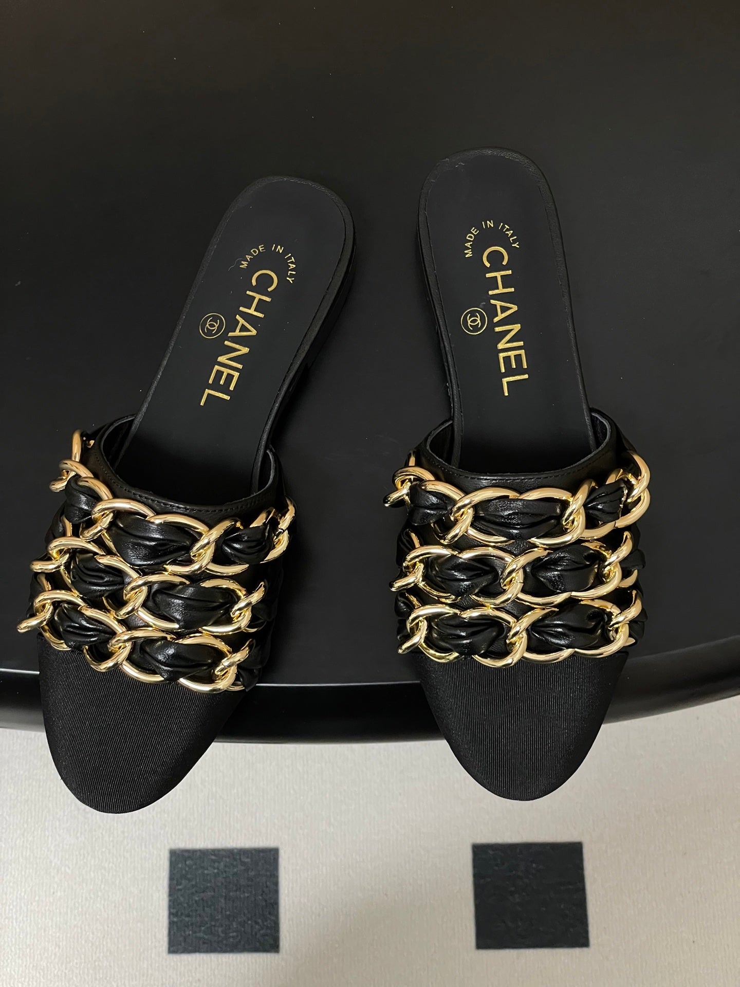 CC 25B Chain Closed Toe Flat Mule Black Sheepskin 393890