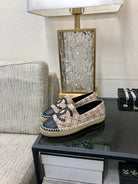 ESPADRILLE CAMEL BEIGE TWEED FABRIC AND BLACK CALFSKIN FLATS