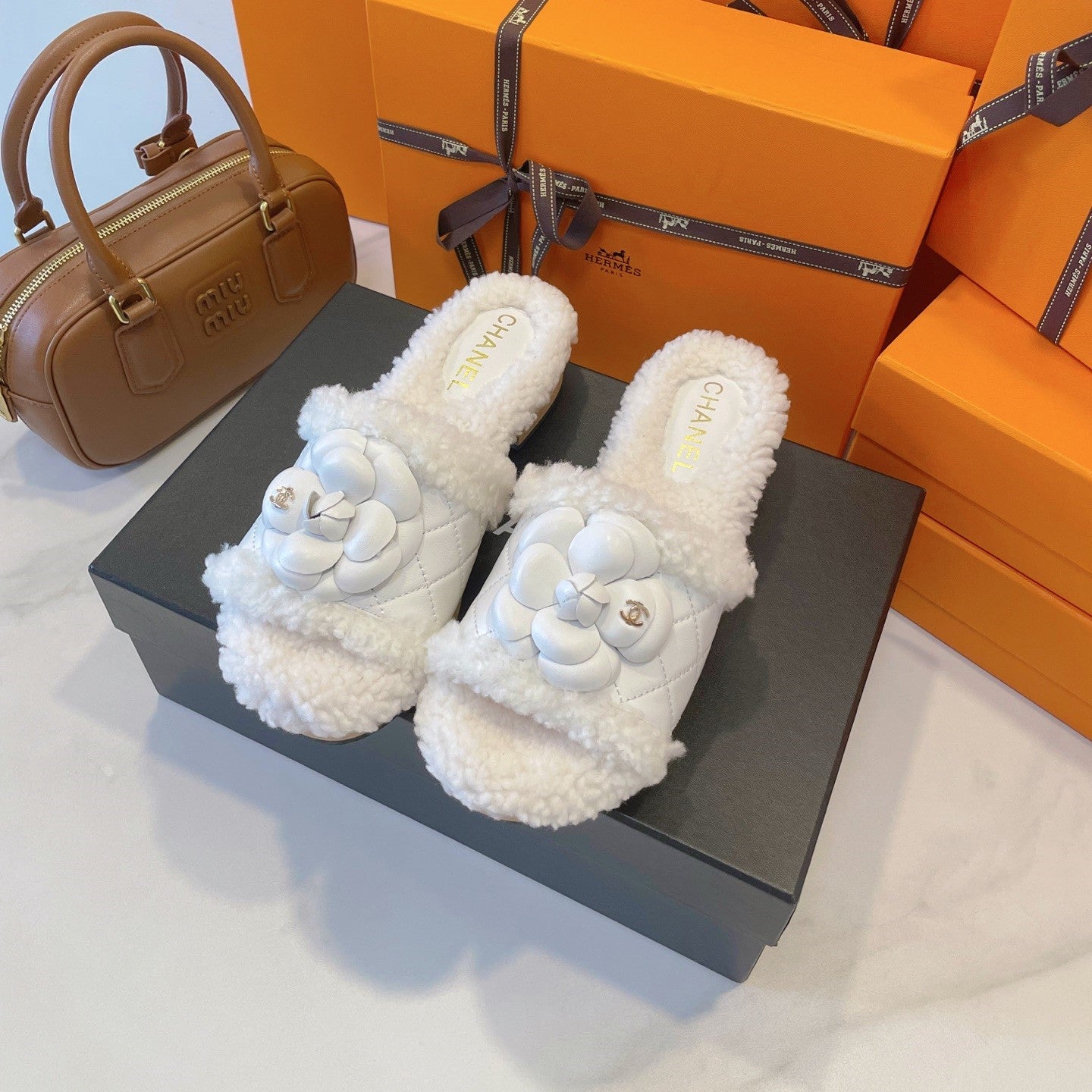 CC 25C Logo Slippers 50mm White Shearling Wood Sheepskin 423695