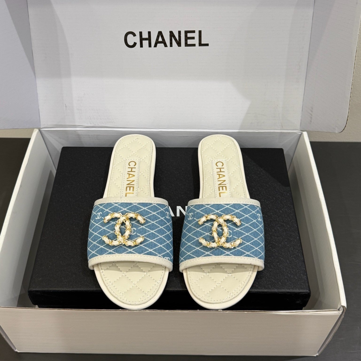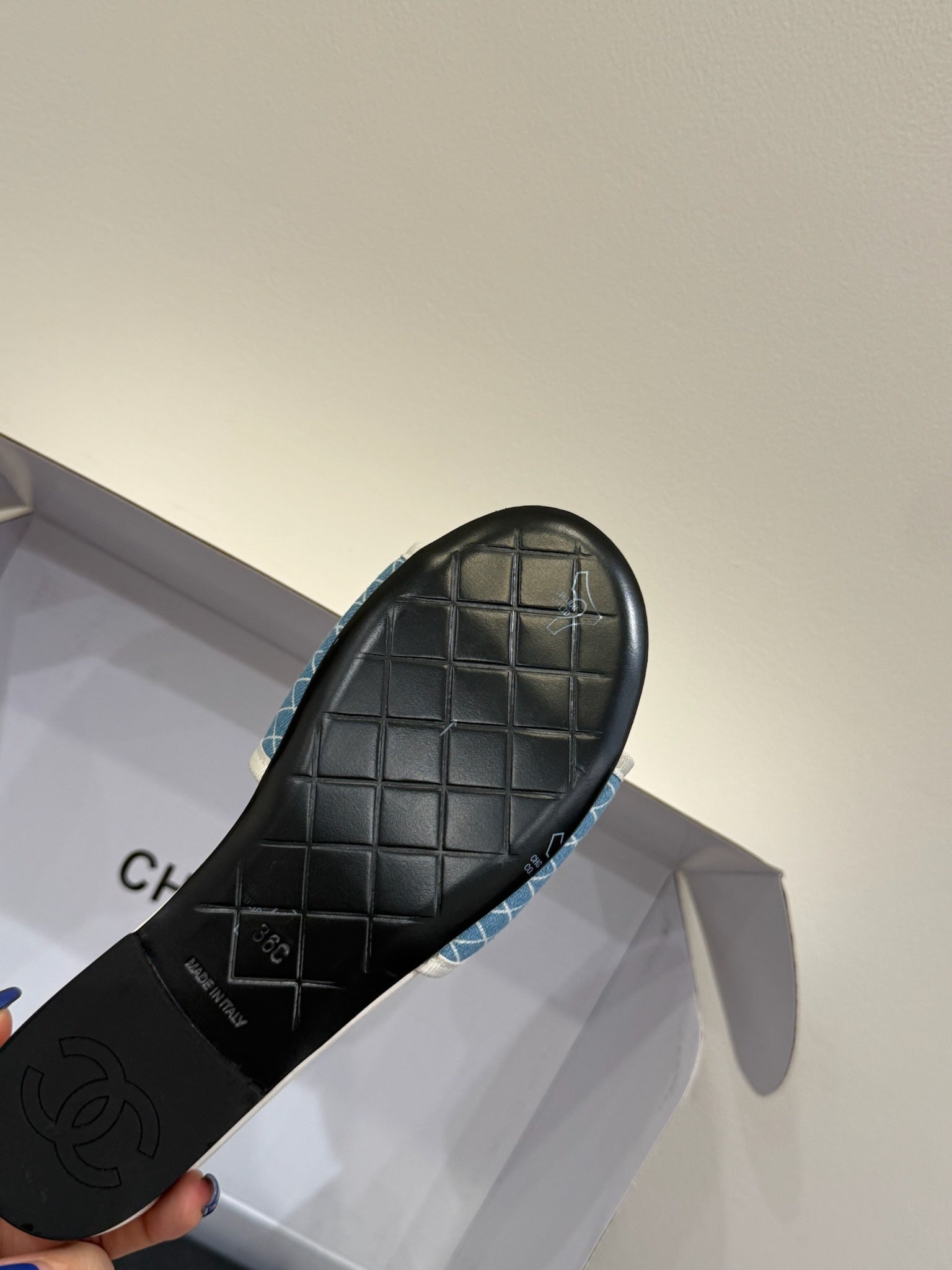CC 25ss Chain Flat Slippers Blue White Cowhide & Sheepskin 417566