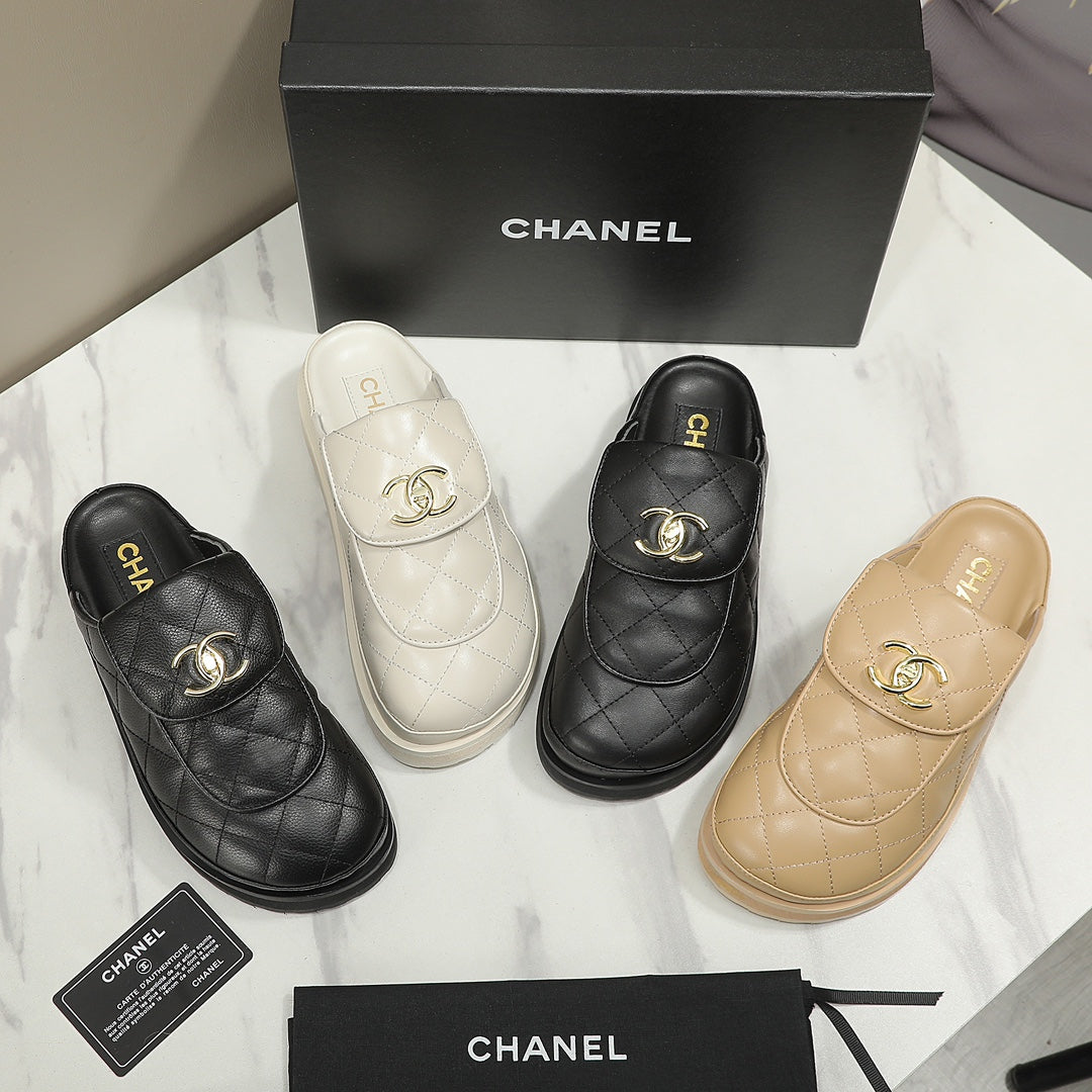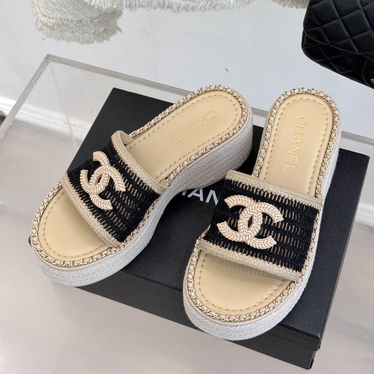 CC Mesh Hollow Chain Double C Thick-Soled Slippers 70mm Beige Black 265650