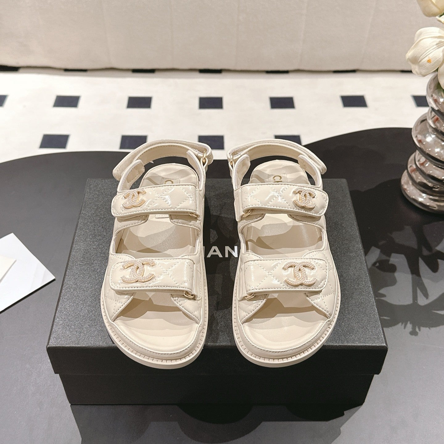 cc 25p logo with pearl sandal cream leather 237593