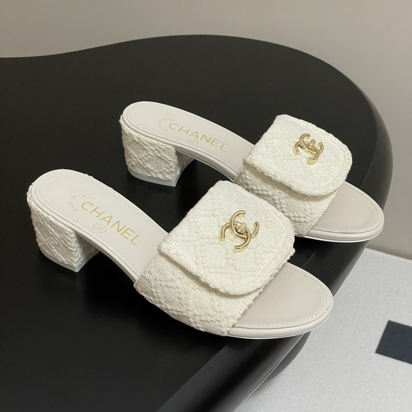 CC 25S Buckle Bag Mule Sandal 50mm White Fabric and Sheepskin 247601