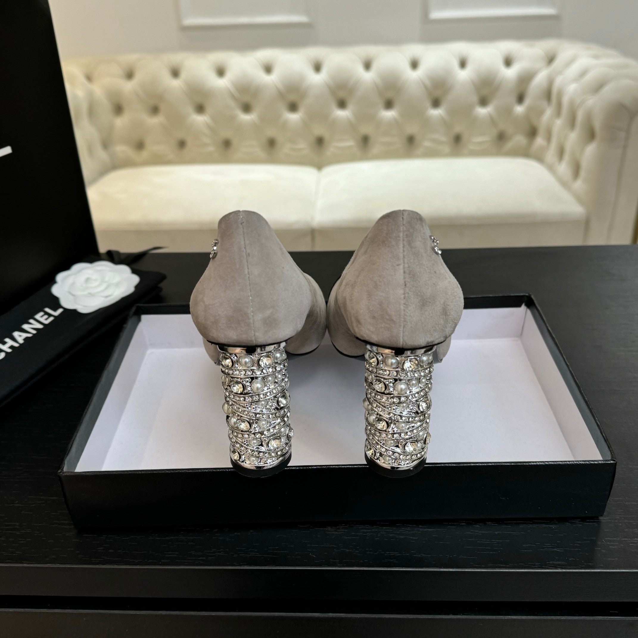 T-STRAP PEARL HEEL 85 MM SANDALS IN PASTEL GRAY SUEDE
