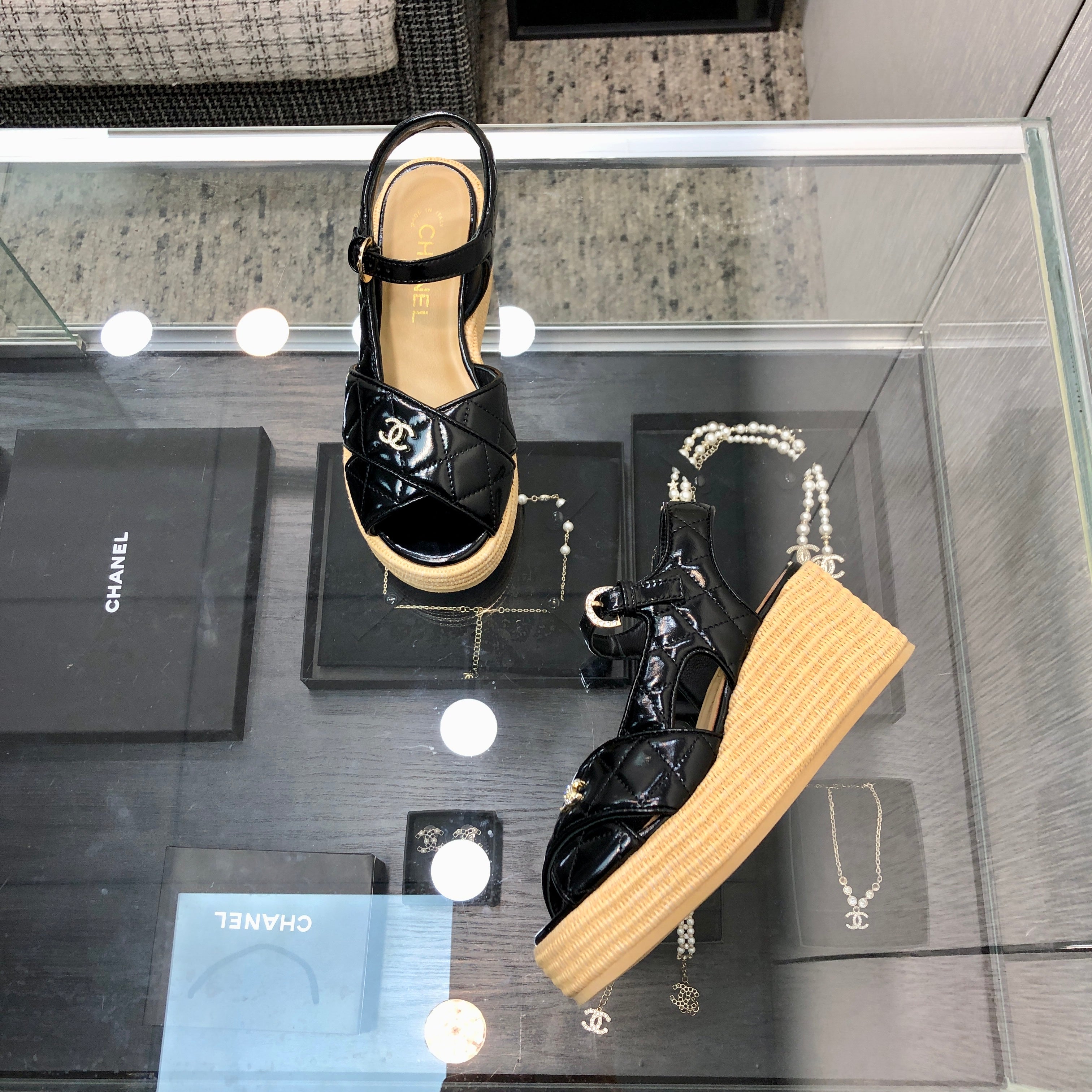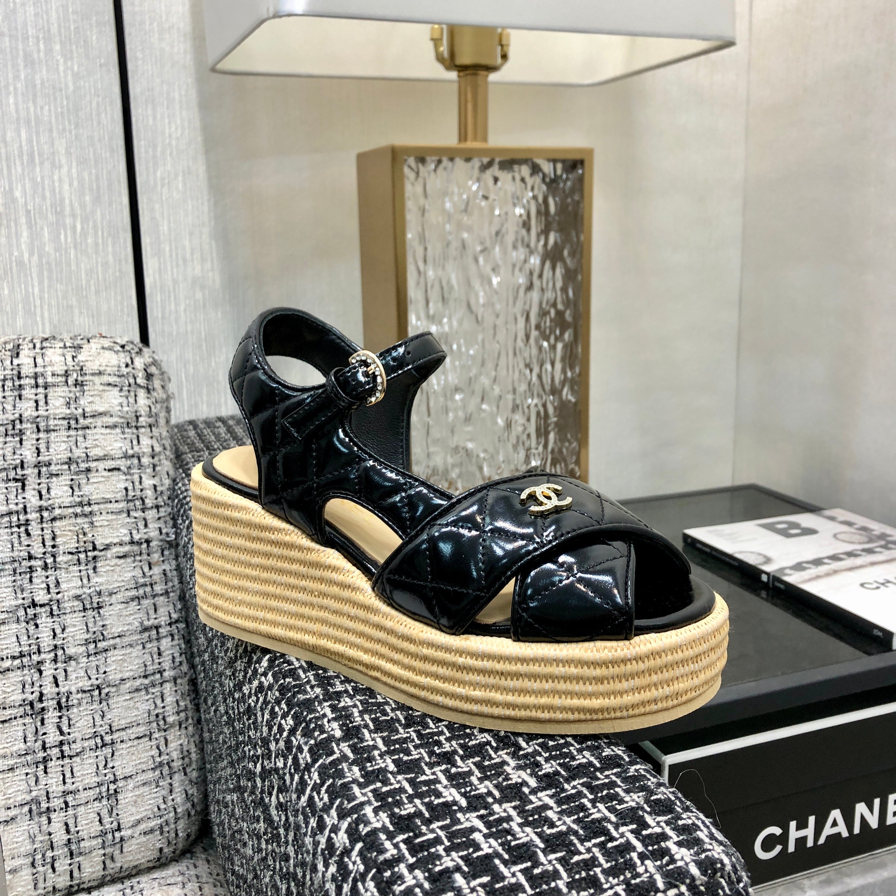 PEEP-TOE THICK SOLE SANDALS IN BLACK PATENT LAMBSKIN