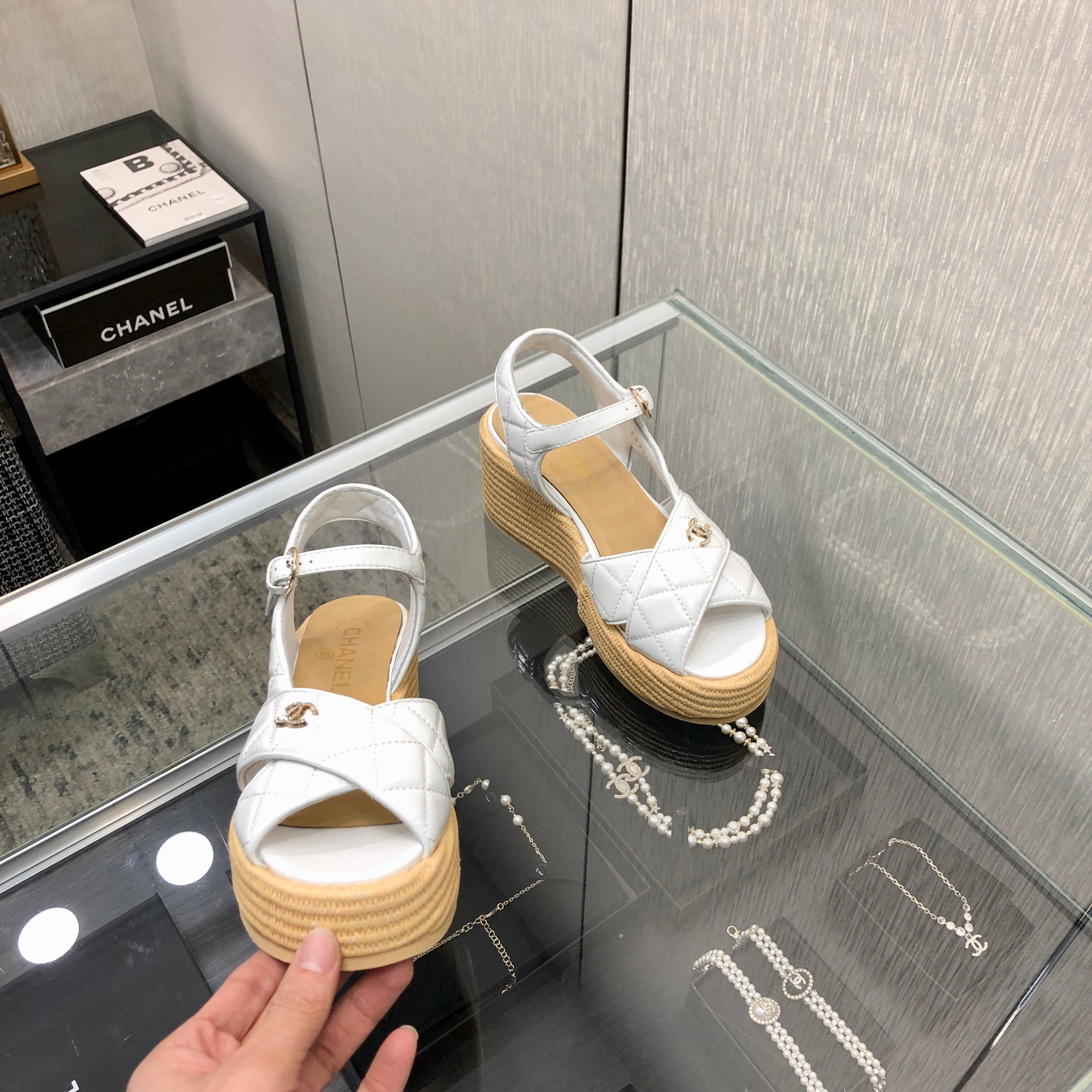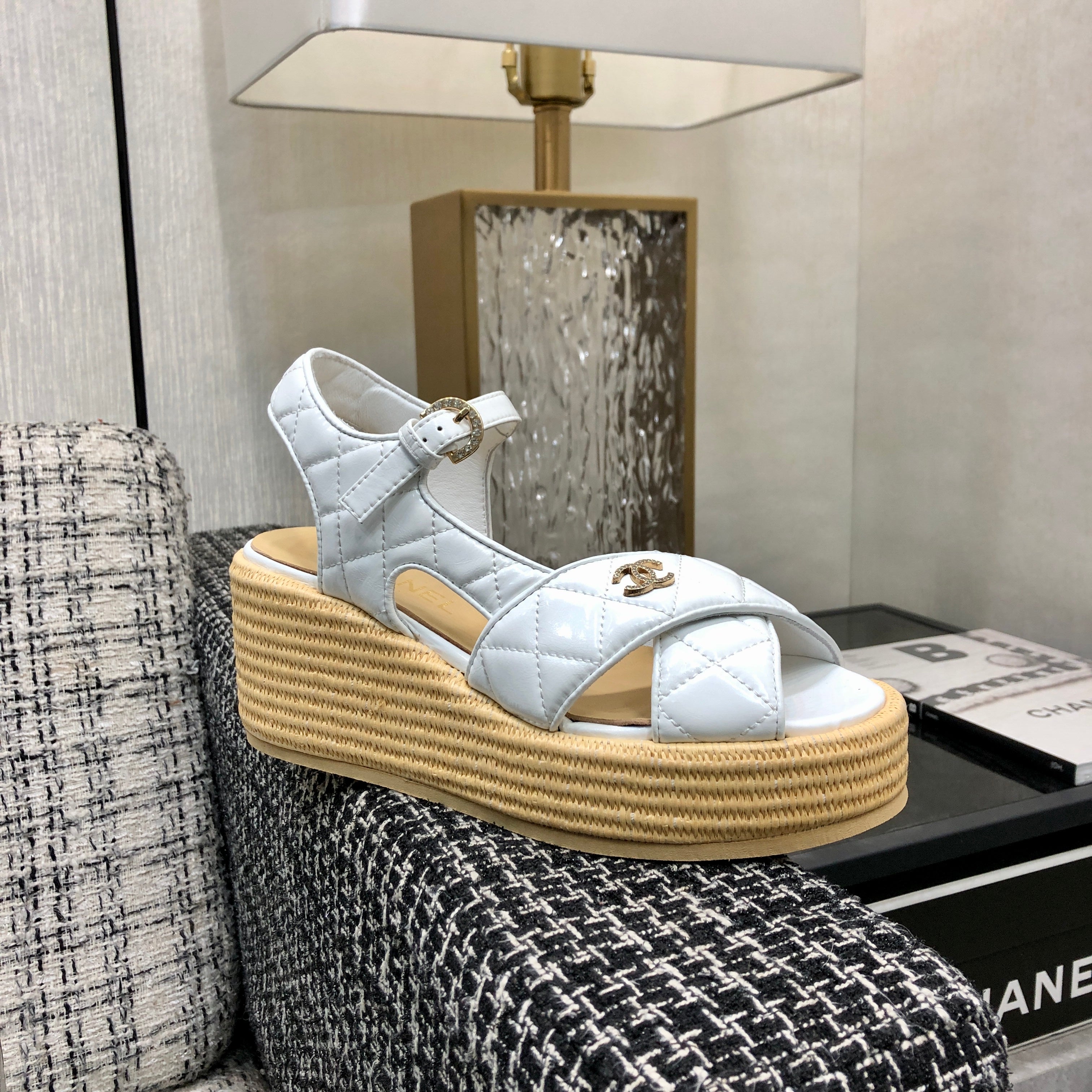 PEEP-TOE THICK SOLE SANDALS IN WHITE PATENT LAMBSKIN