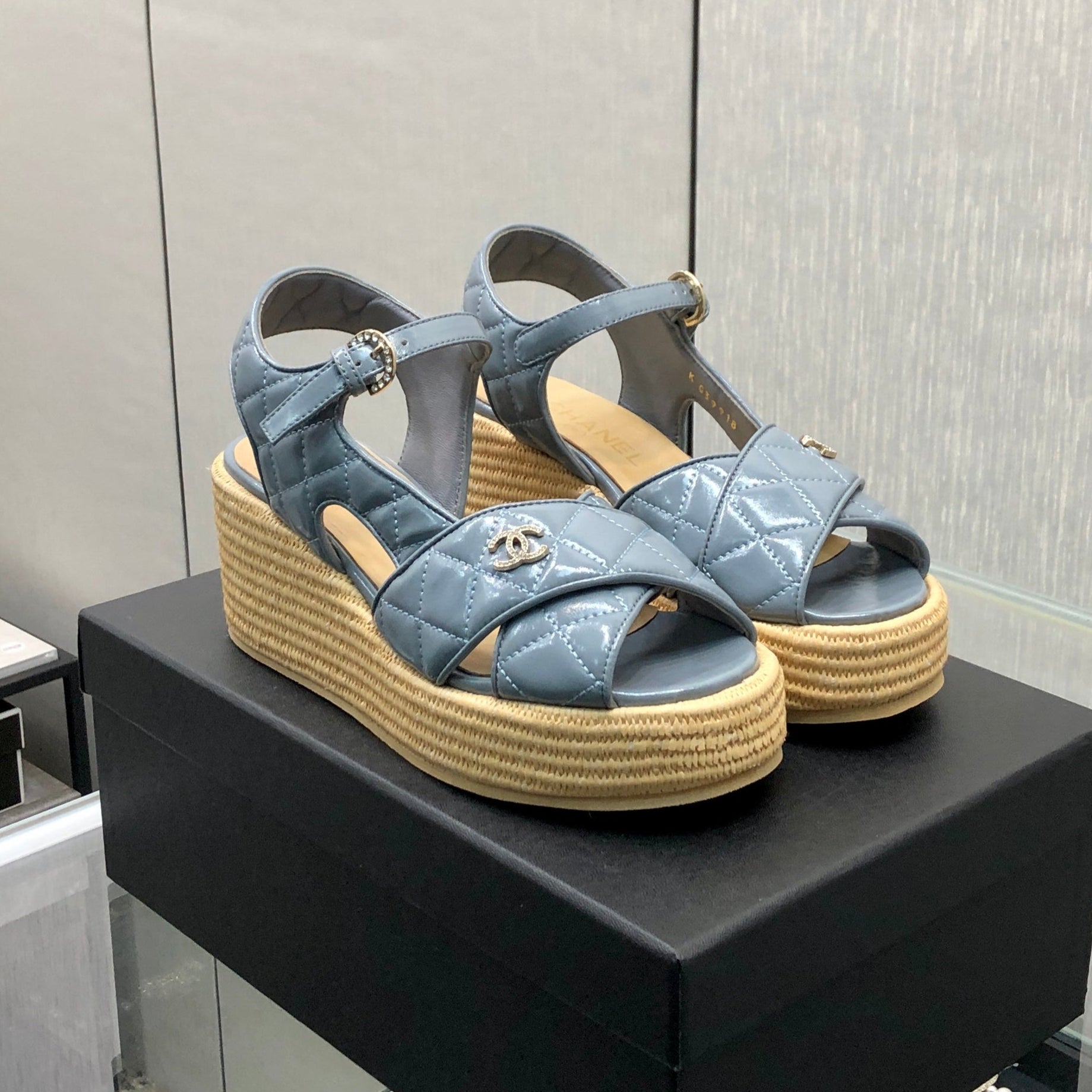 PEEP-TOE THICK SOLE SANDALS IN STONE BLUE PATENT LAMBSKIN