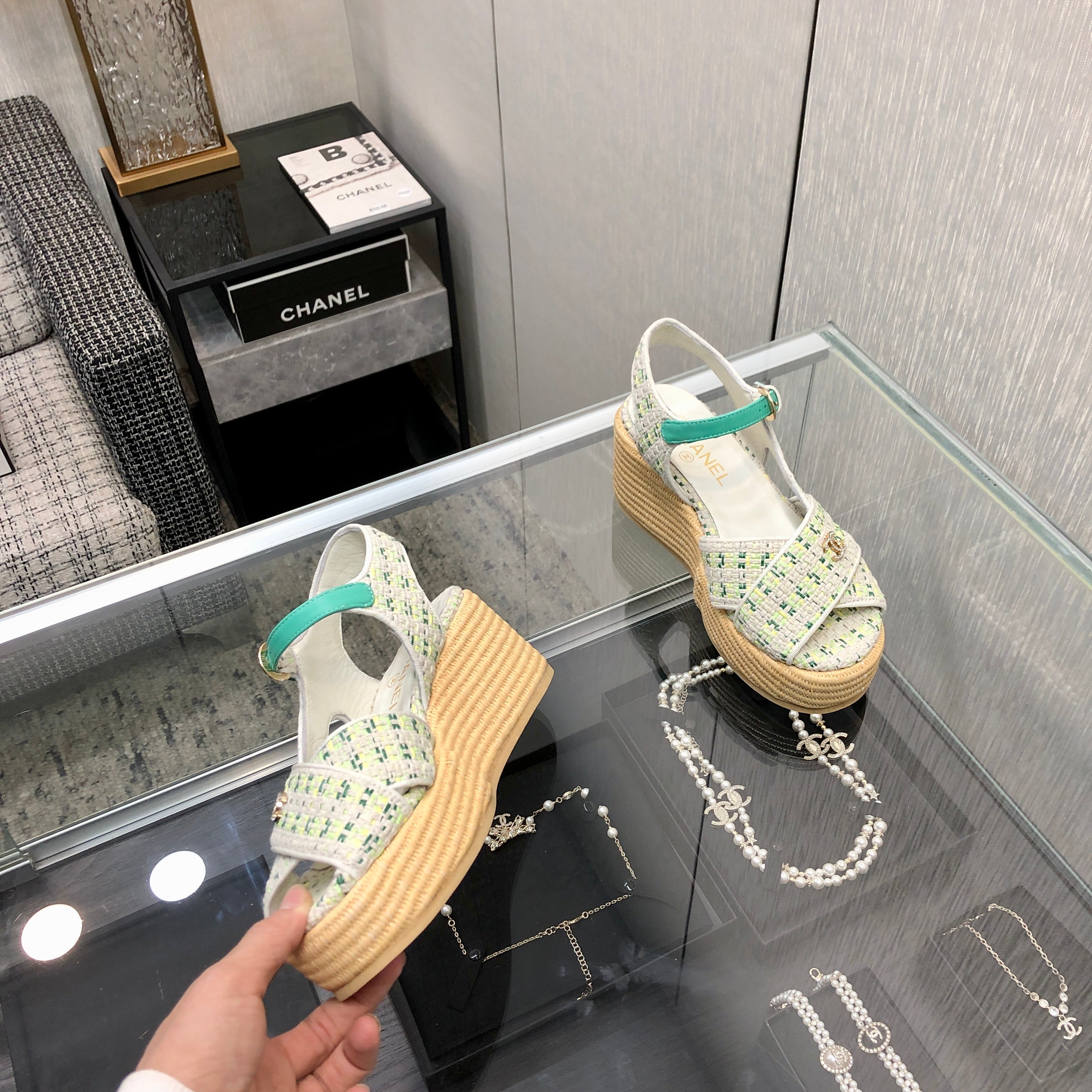 PEEP-TOE THICK SOLE SANDALS IN WHITE MIX TEA GREEN WOVEN FABRIC