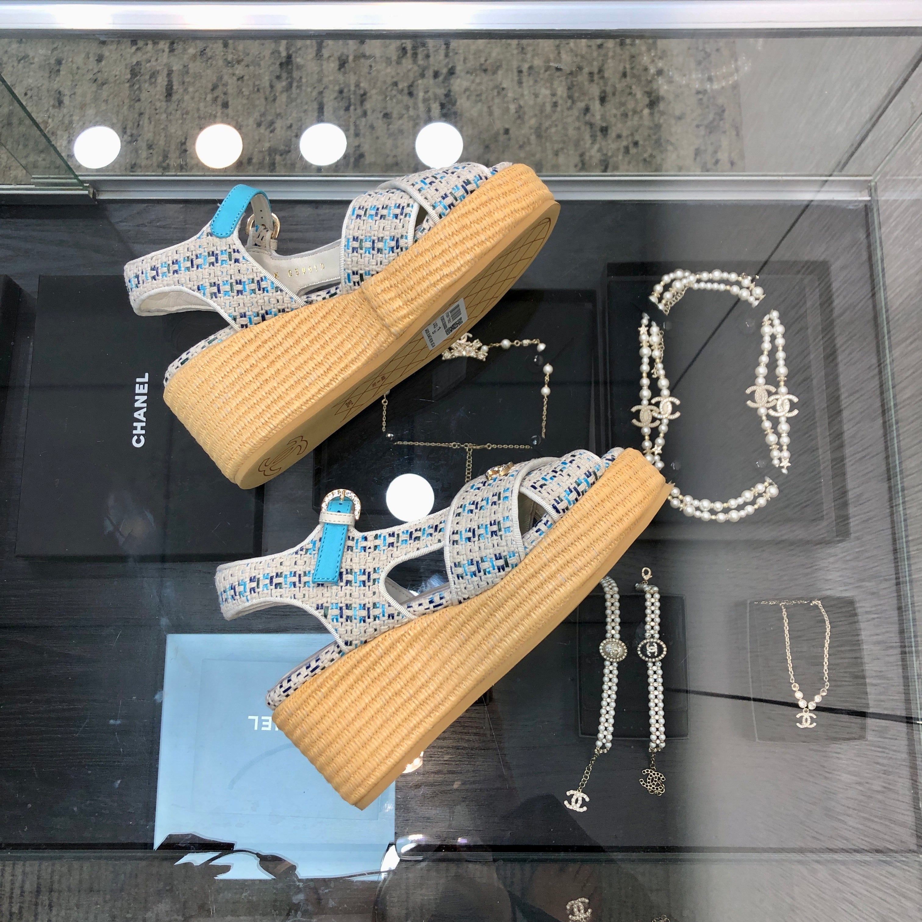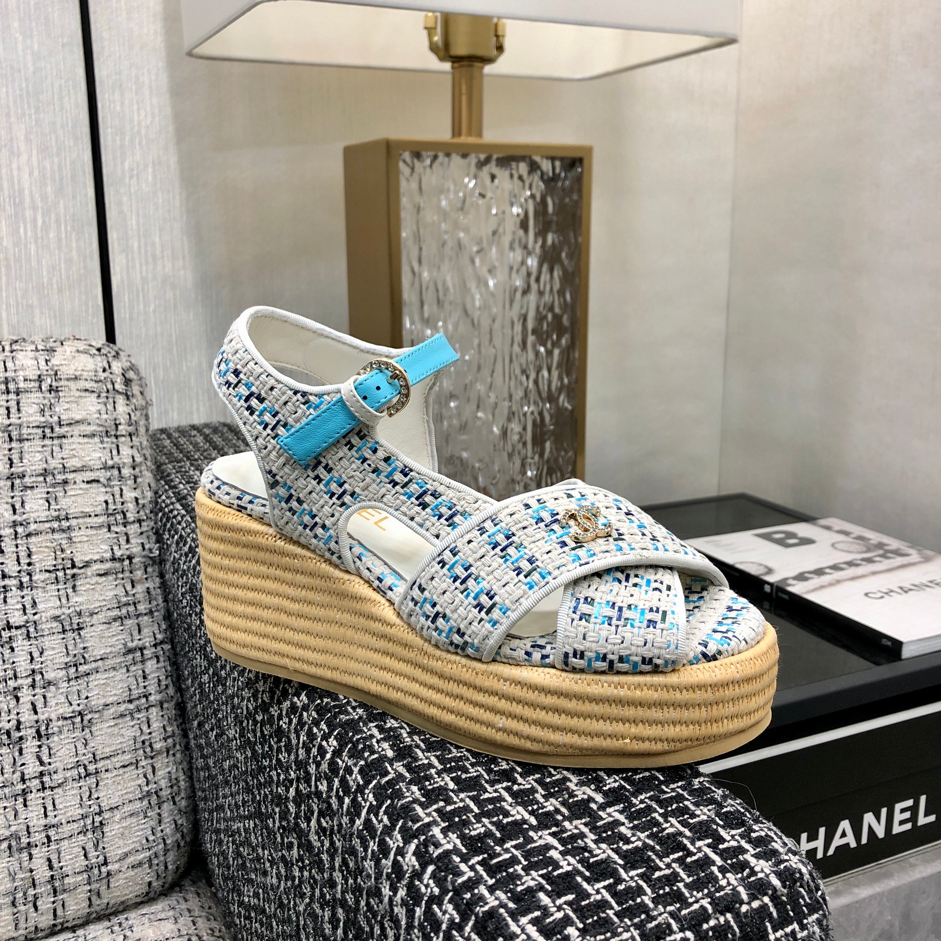 PEEP-TOE THICK SOLE SANDALS IN WHITE MIX BLUE WOVEN FABRIC