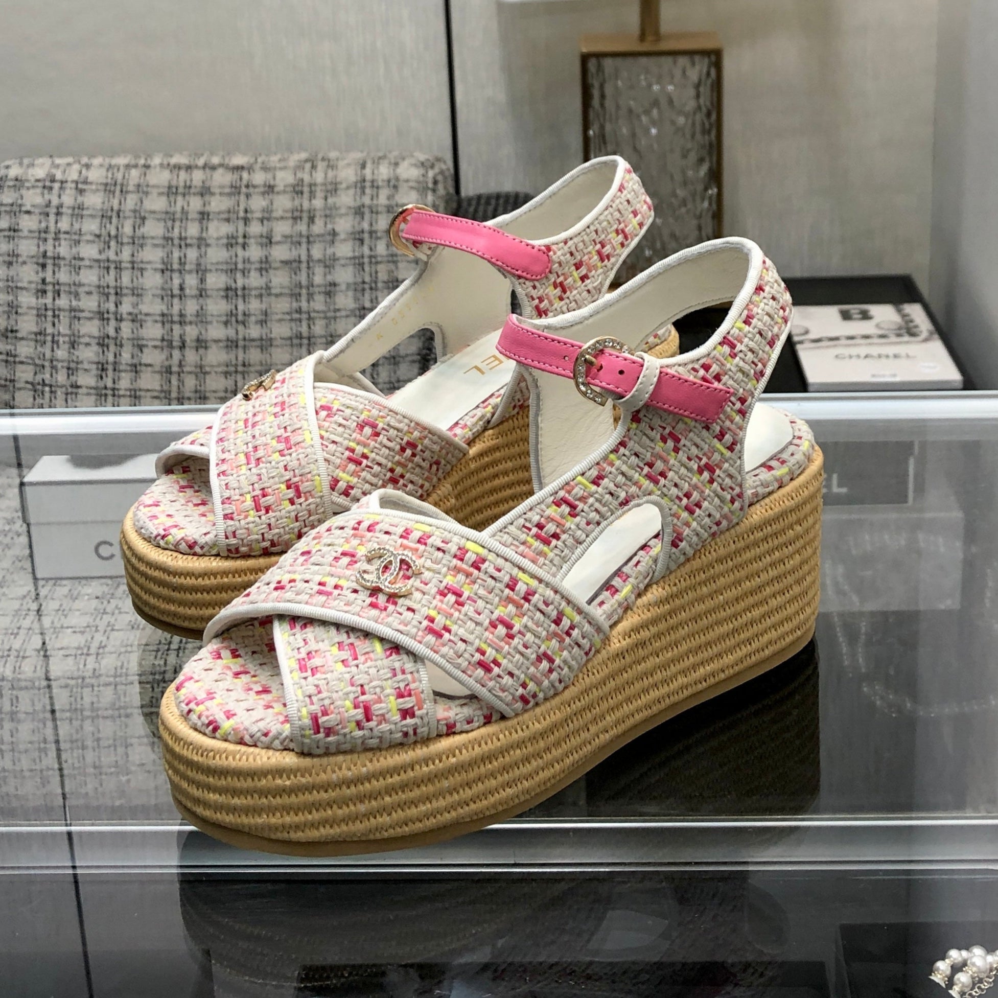 PEEP-TOE THICK SOLE SANDALS IN WHITE MIX BRIGHT PINK WOVEN FABRIC