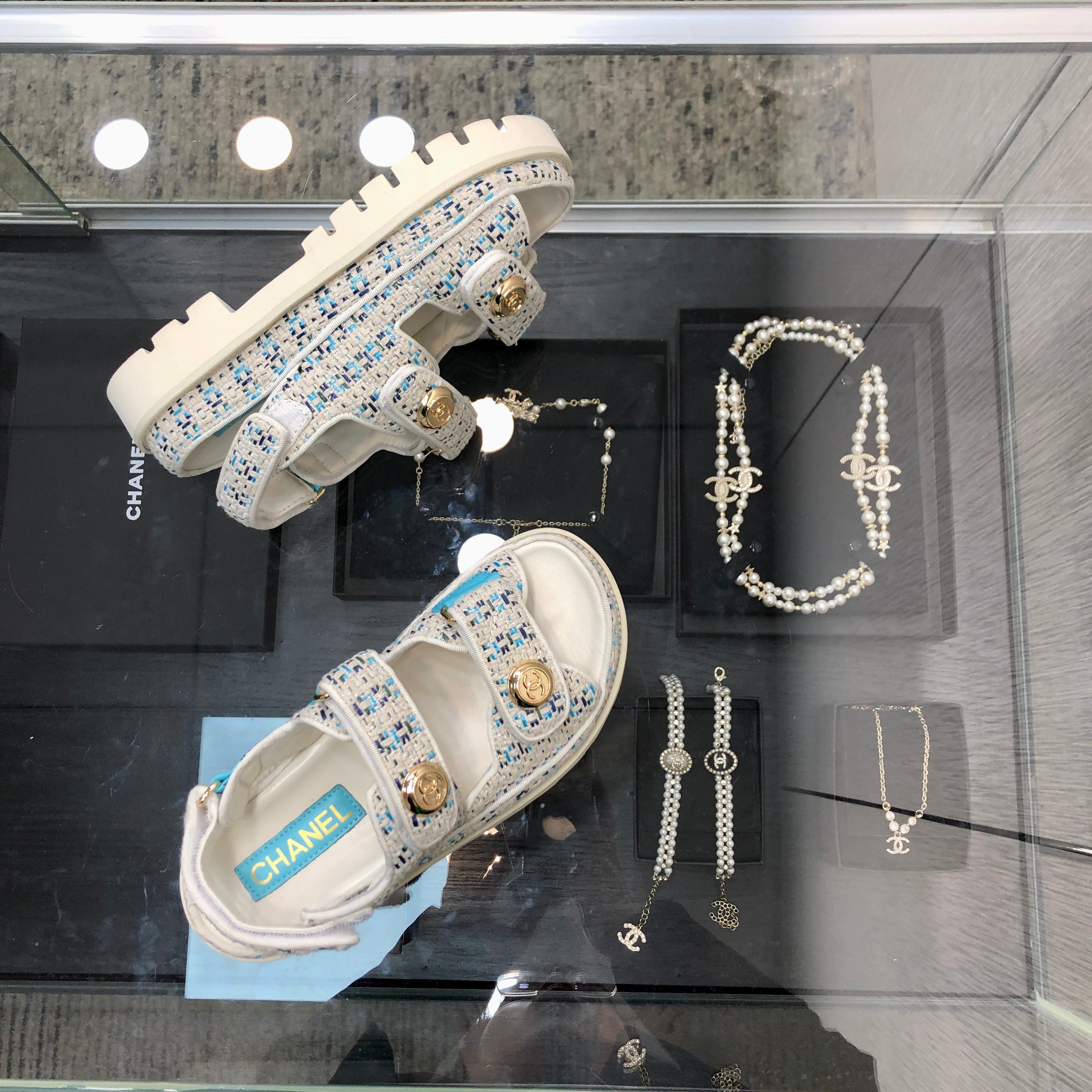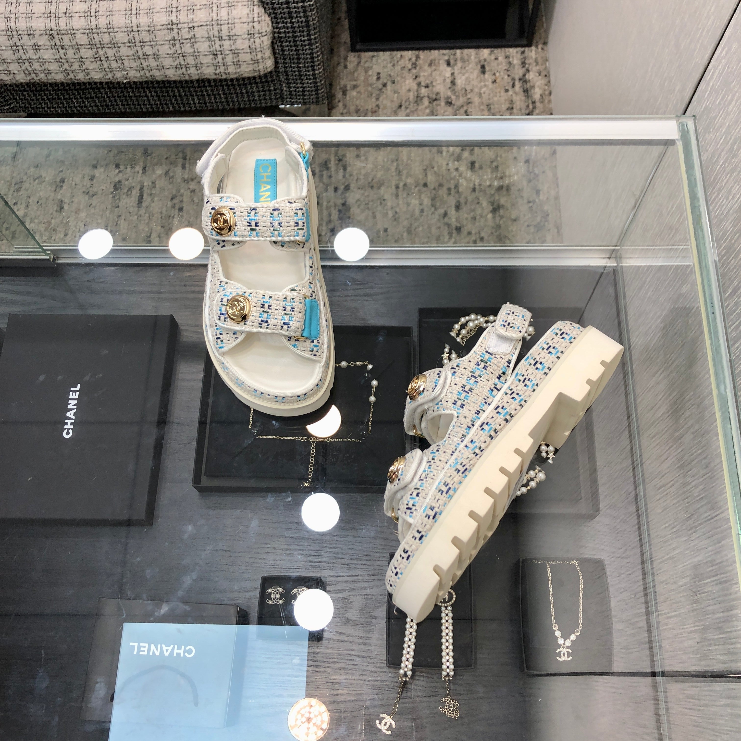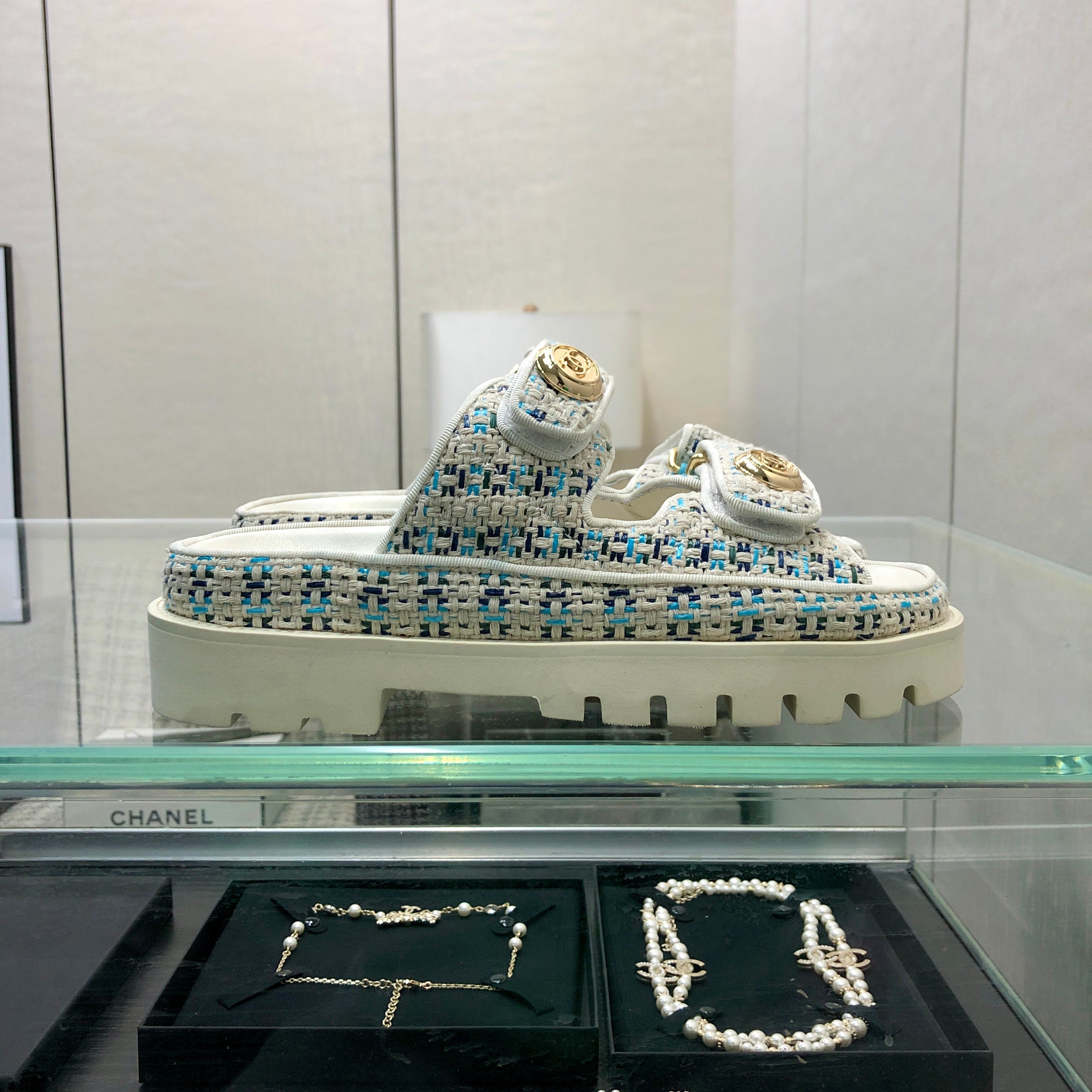 DAD SANDAL IN WHITE MIX LIGHT BLUE TWEED FABRIC