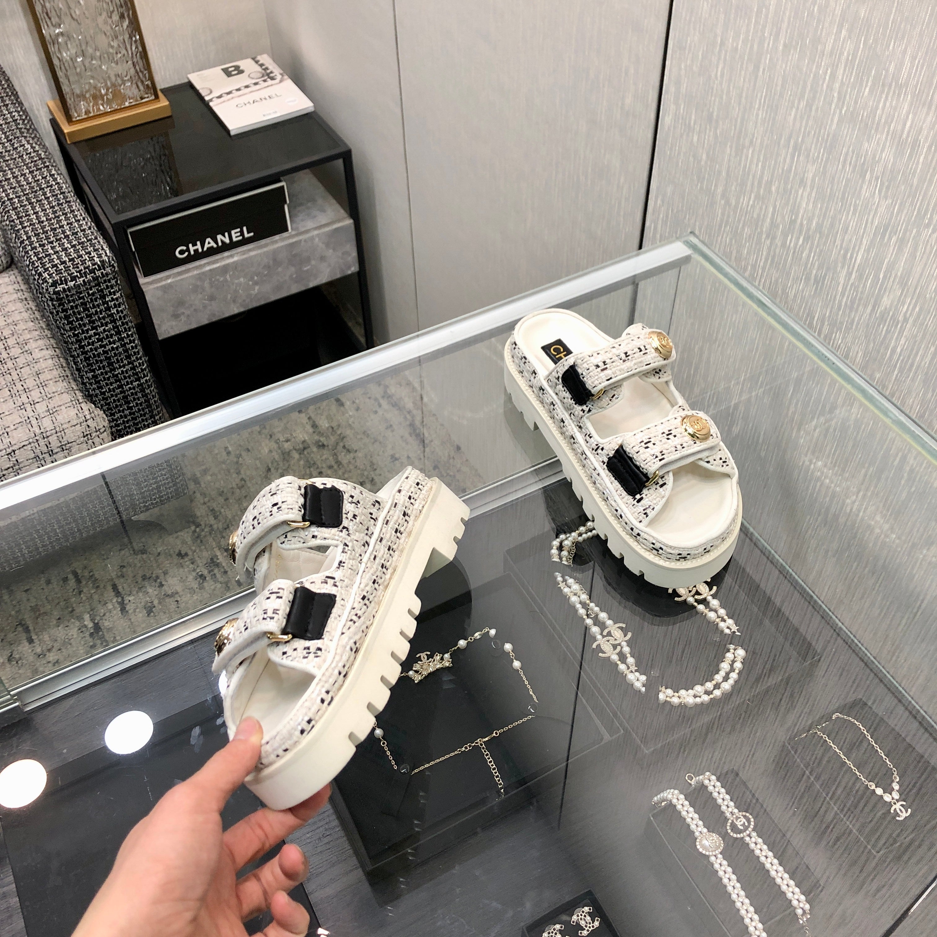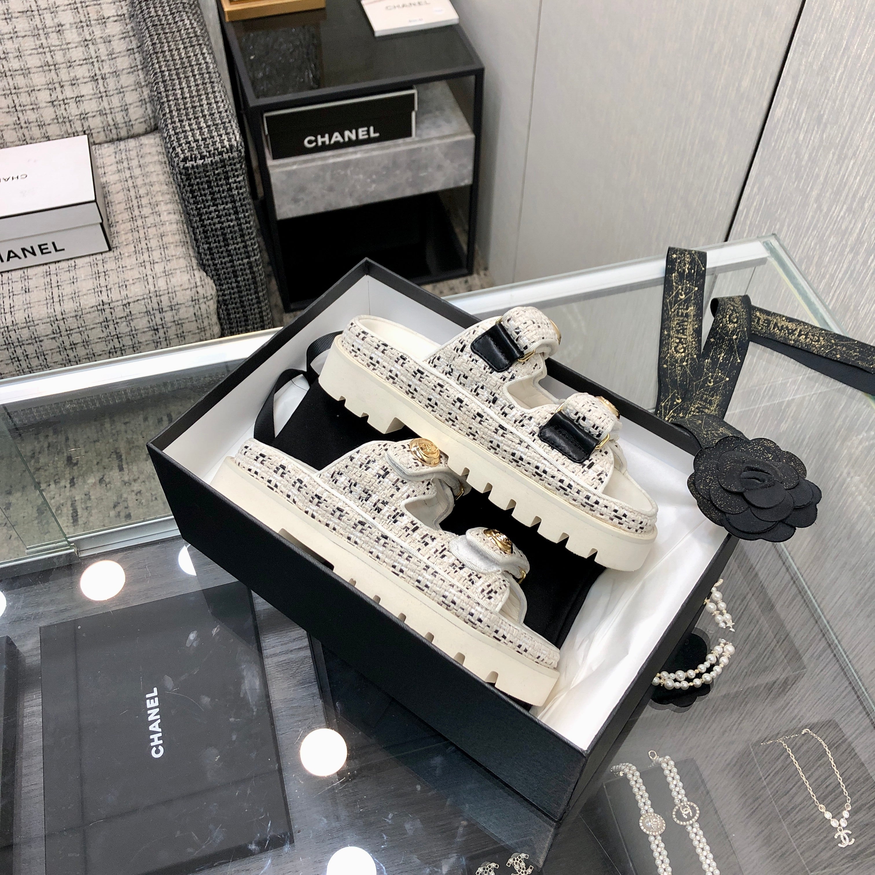 DAD SANDAL IN WHITE MIX BLACK TWEED FABRIC