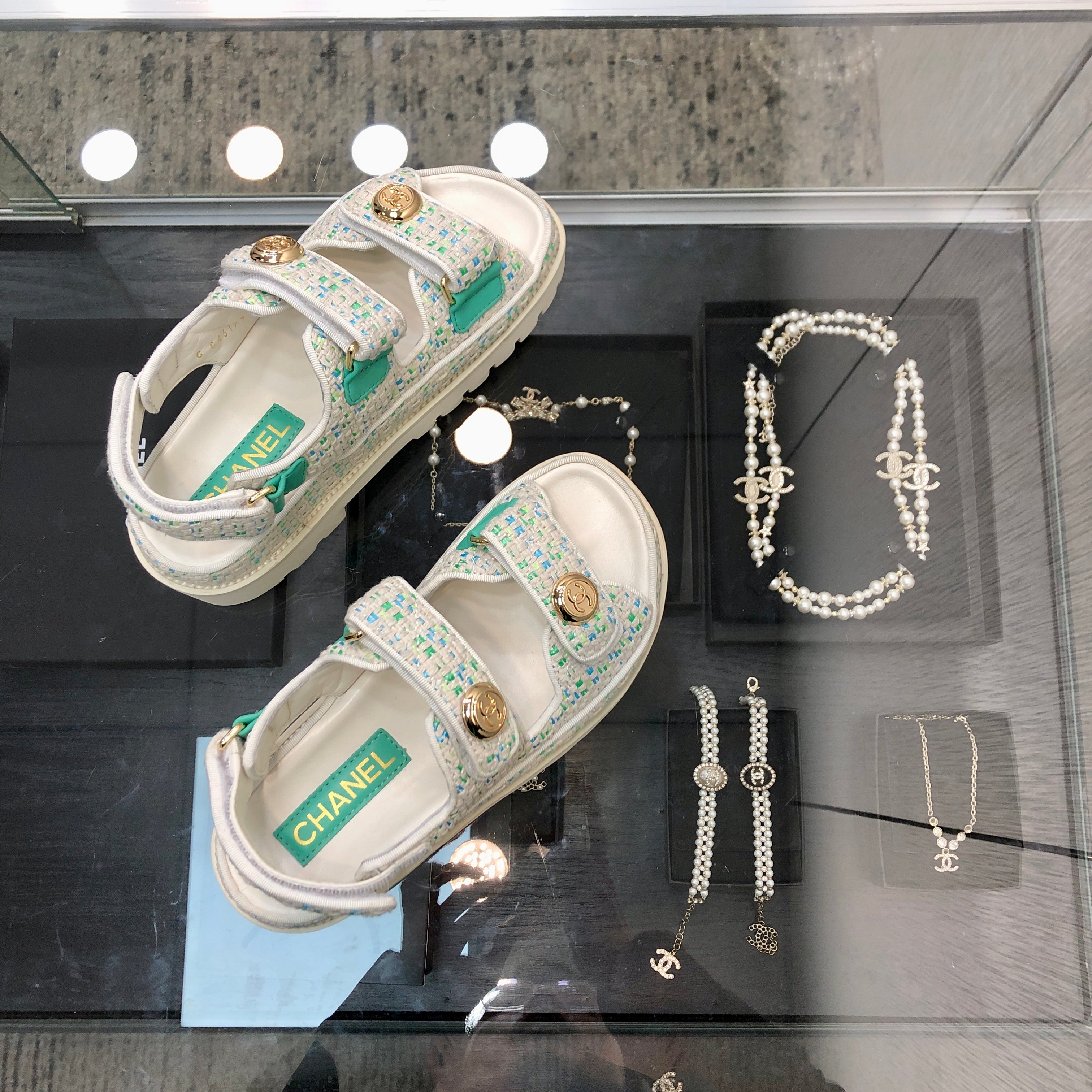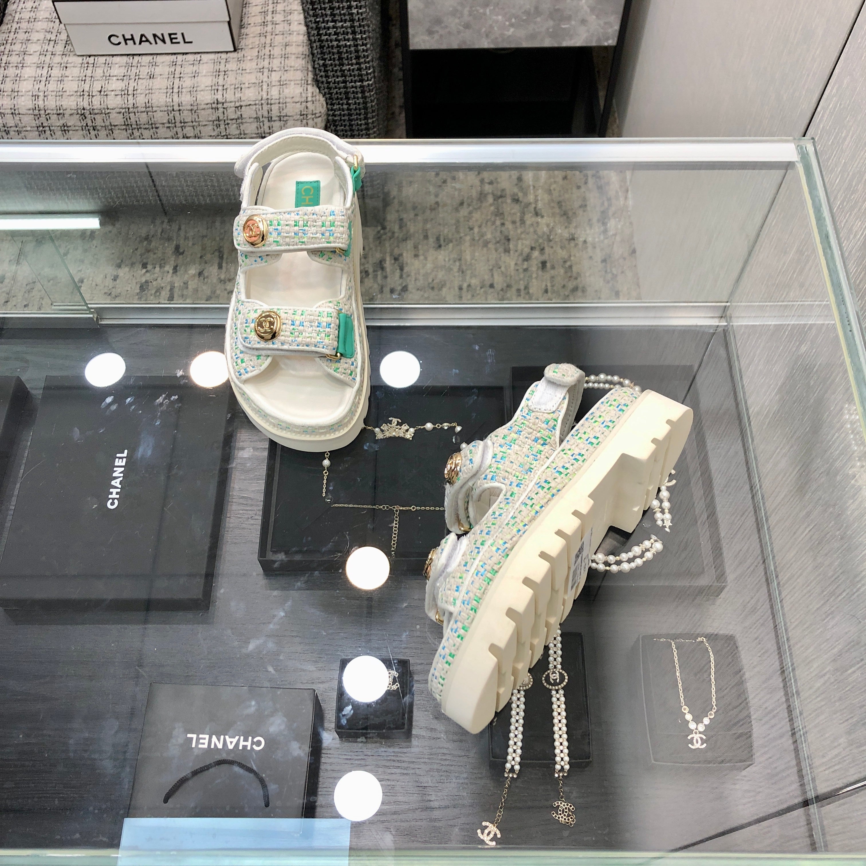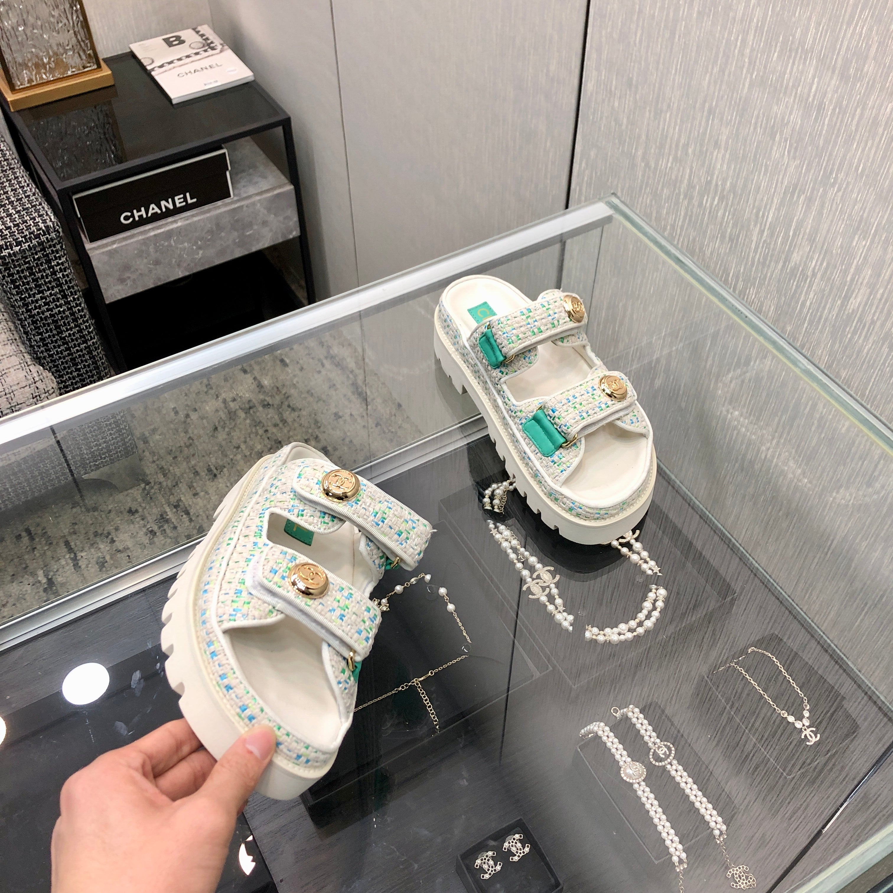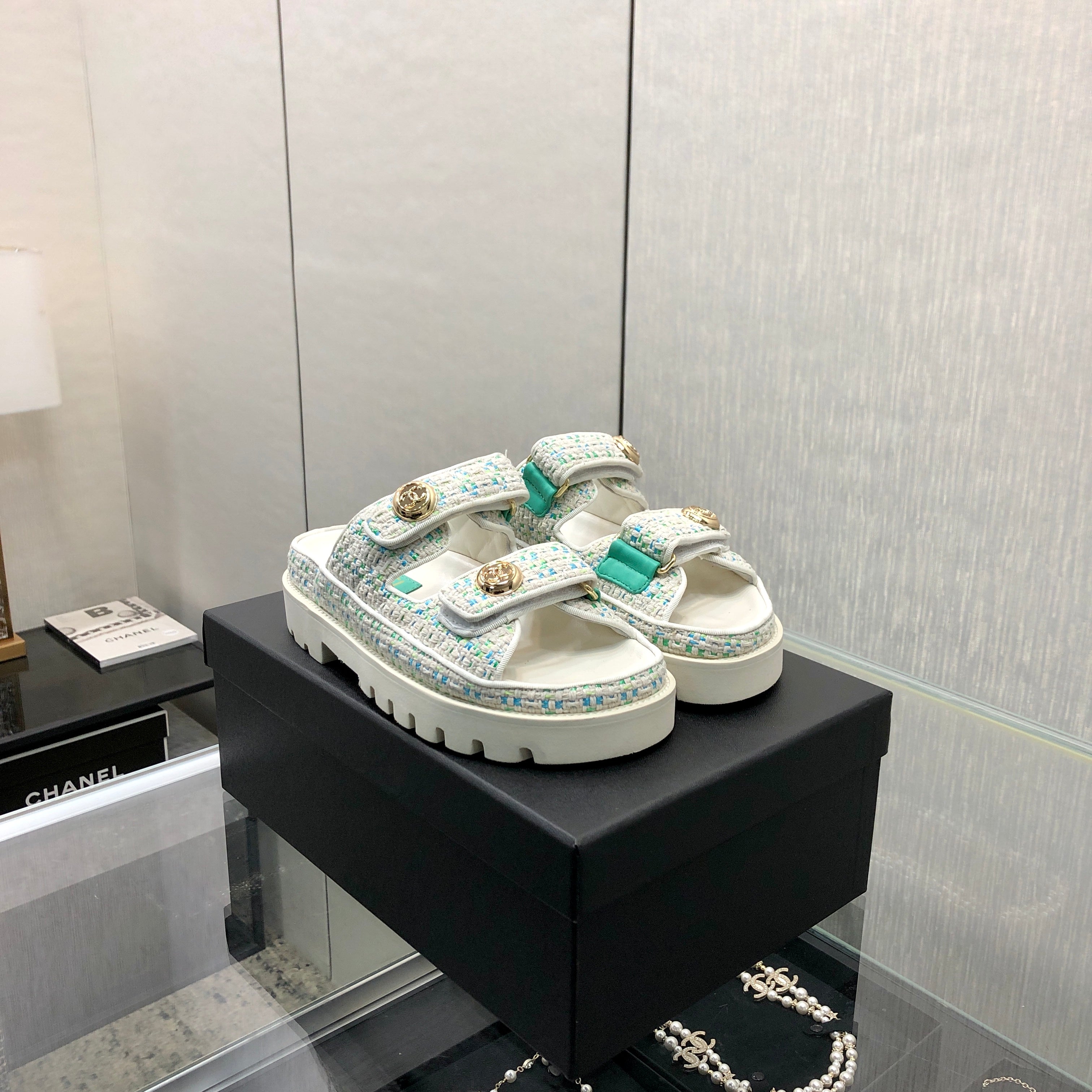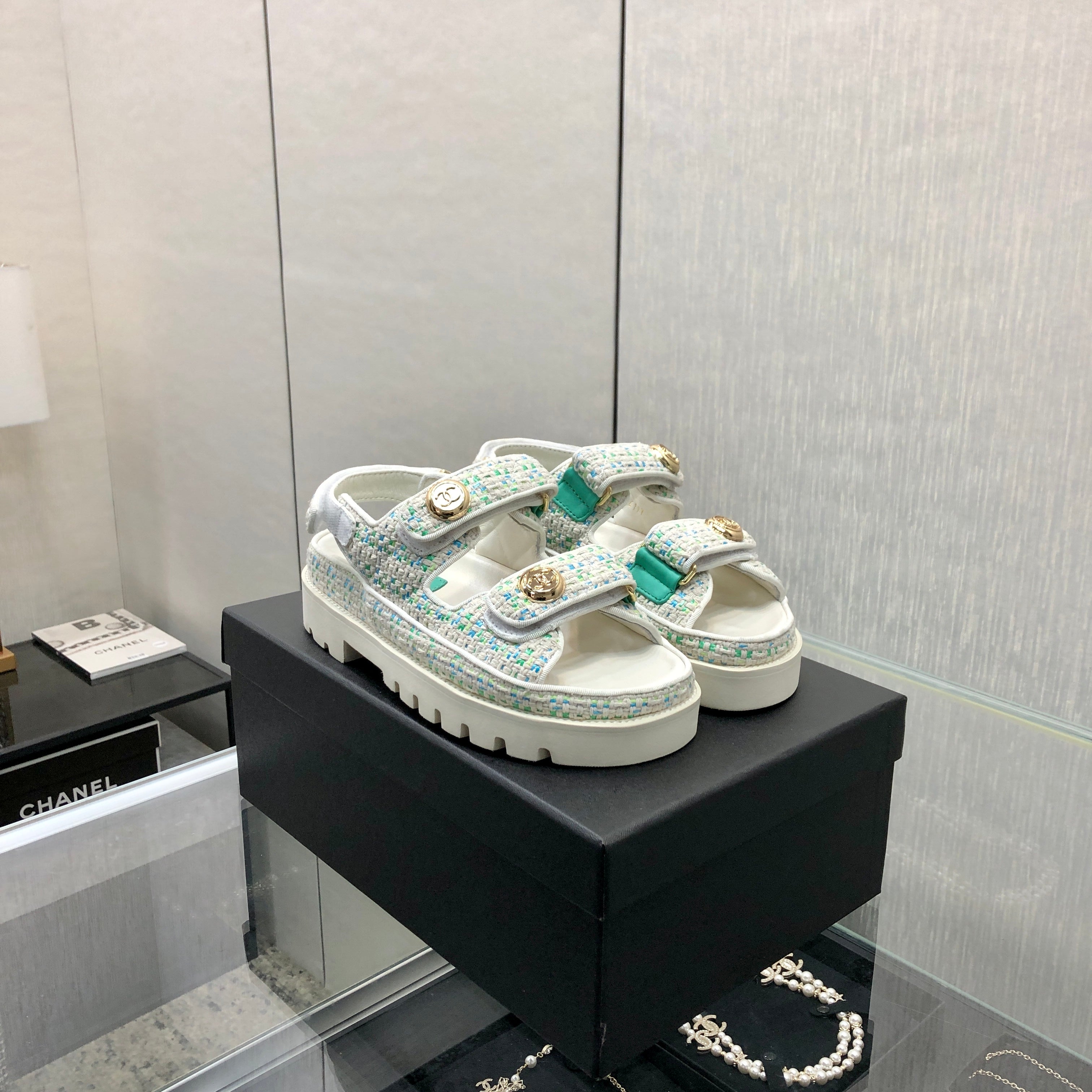 DAD SANDAL IN WHITE MIX PERSIAN GREEN TWEED FABRIC