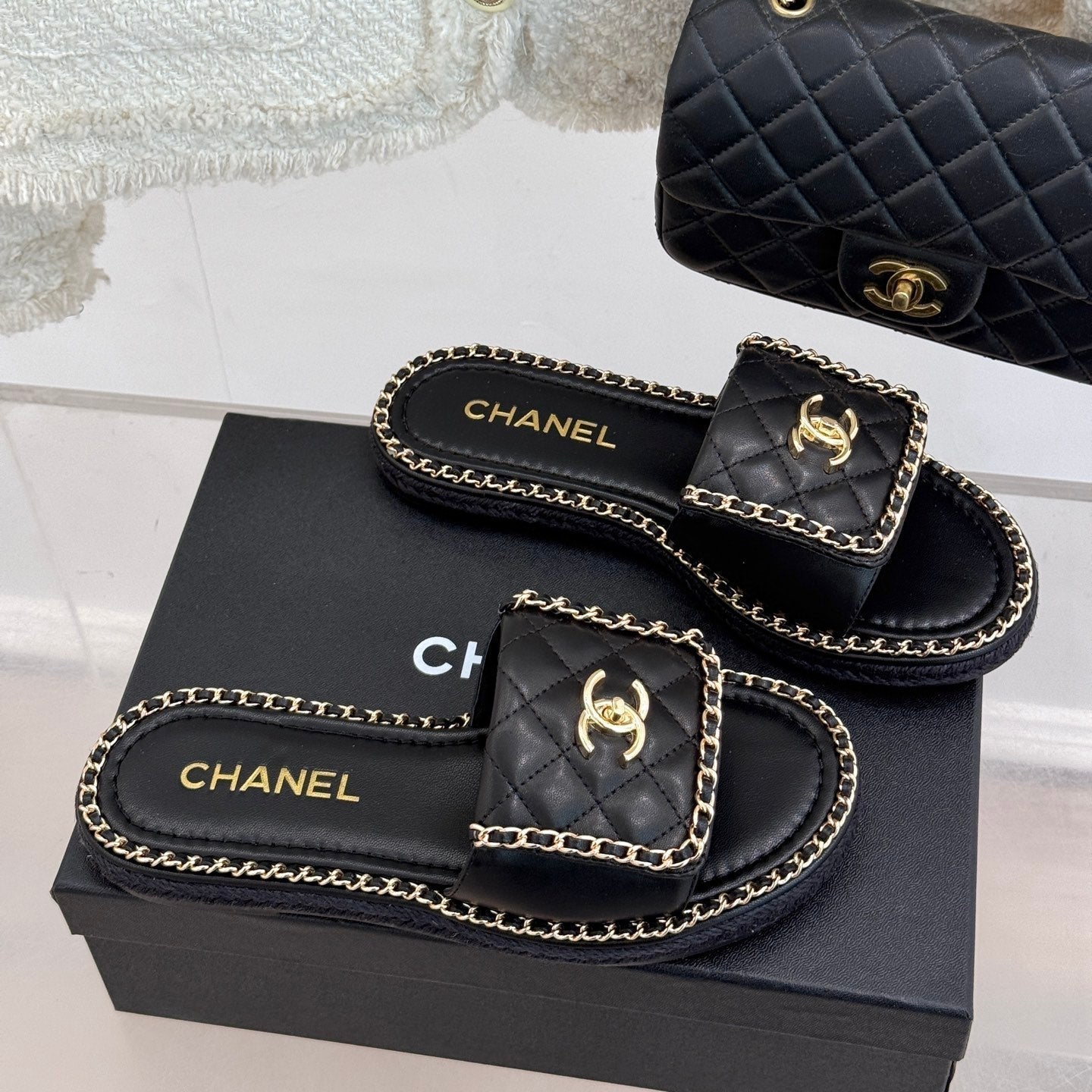 DIAMOND QUILTED CHAIN LAZY SLIPPERS IN BLACK LAMBSKIN