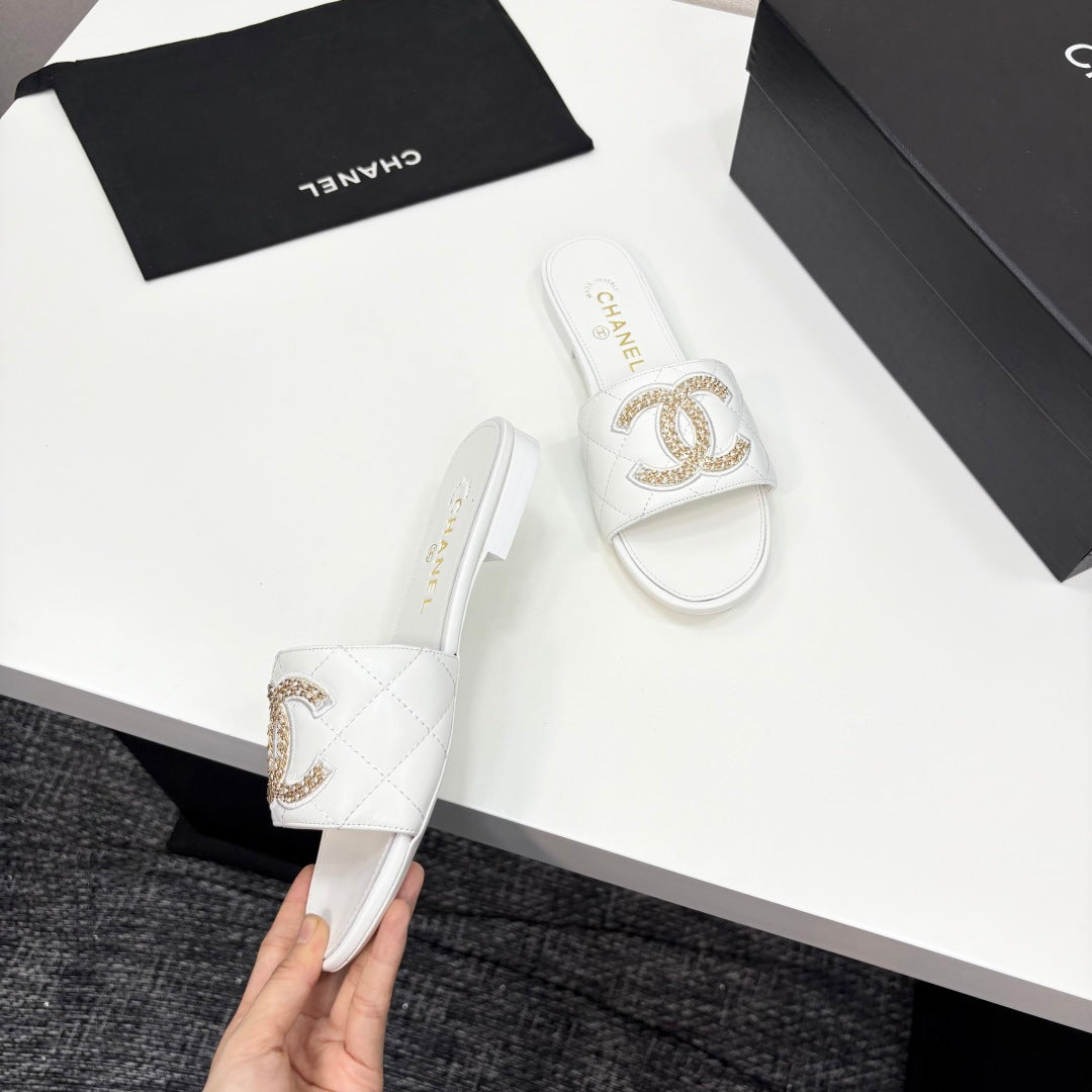 CC 25 Doubble Chain Embroidered Slippers White Fabric And Sheepskin 352492