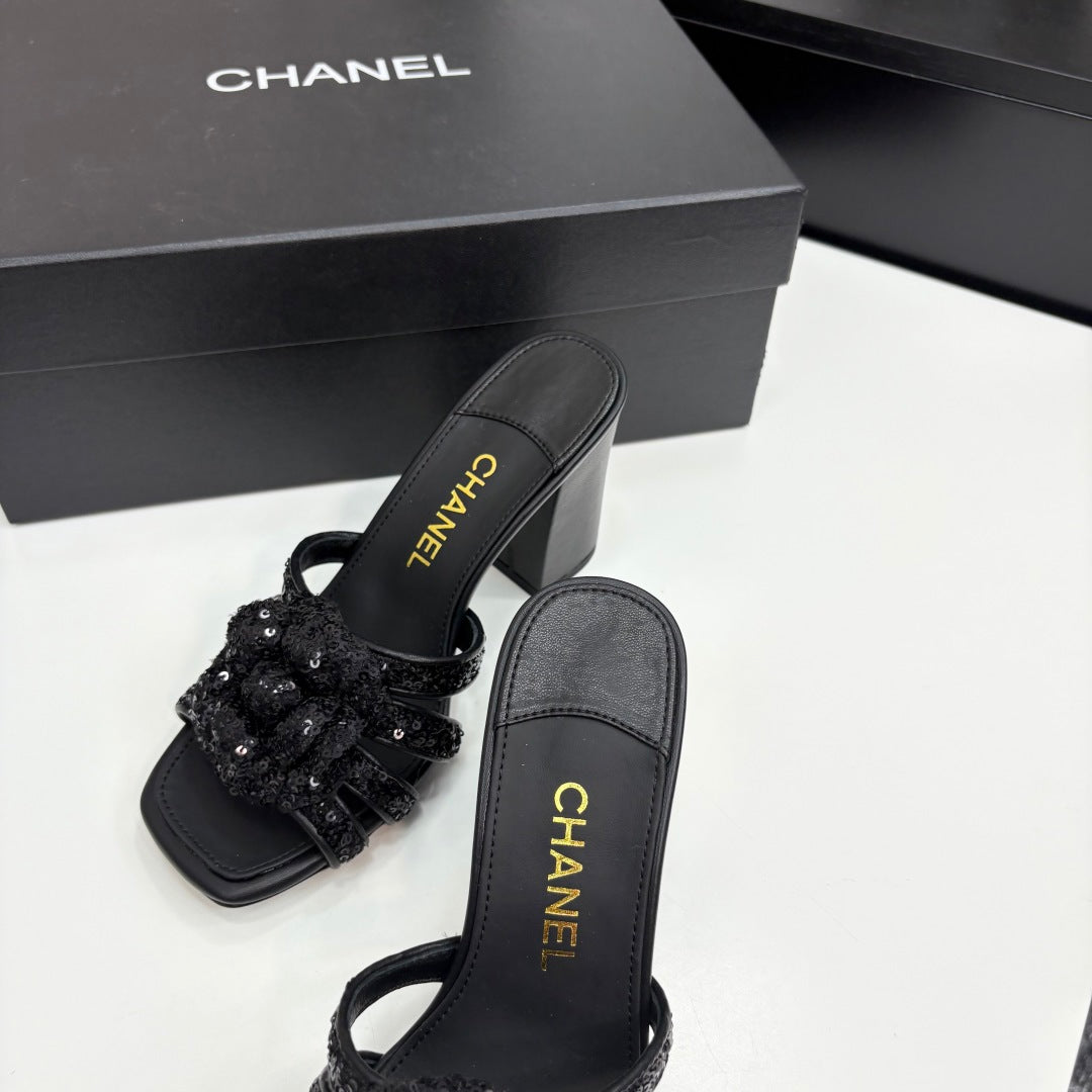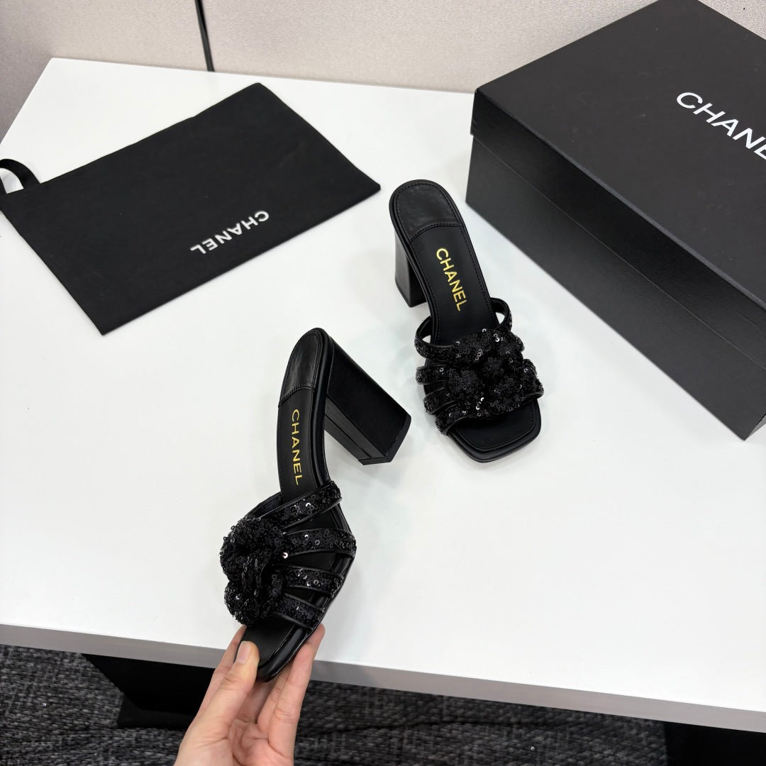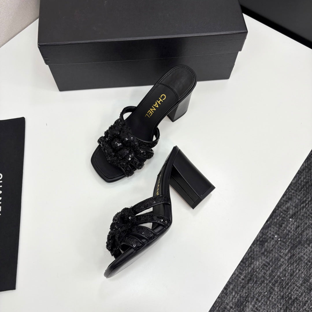 CC 25 Camellia Open Heel Mule Sandals 50mm Black Coarse Glitter Fabric And Sheepskin 368856