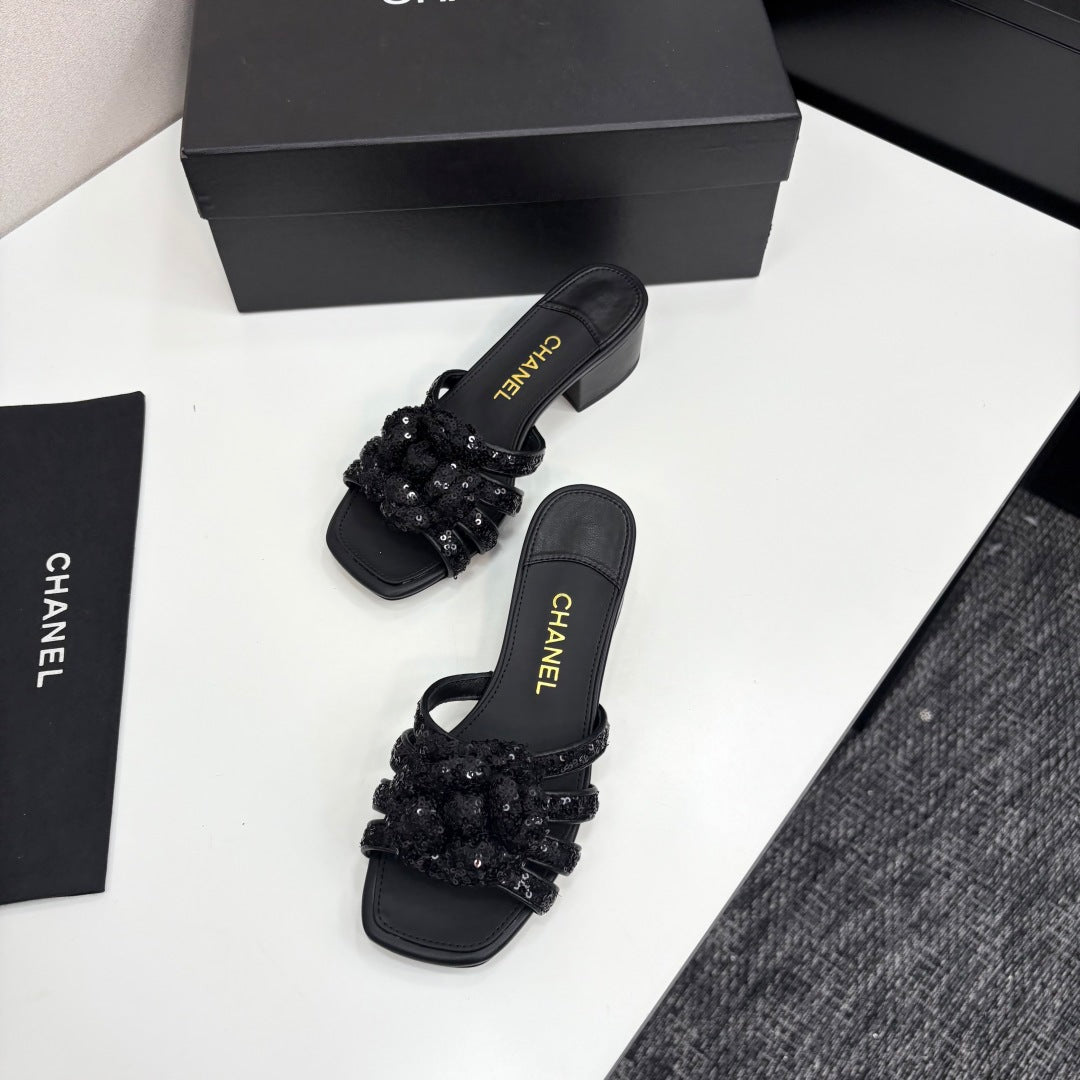 CC 25 Camellia Open Flat Mule Black Coarse Glitter Fabric And Sheepskin 368853