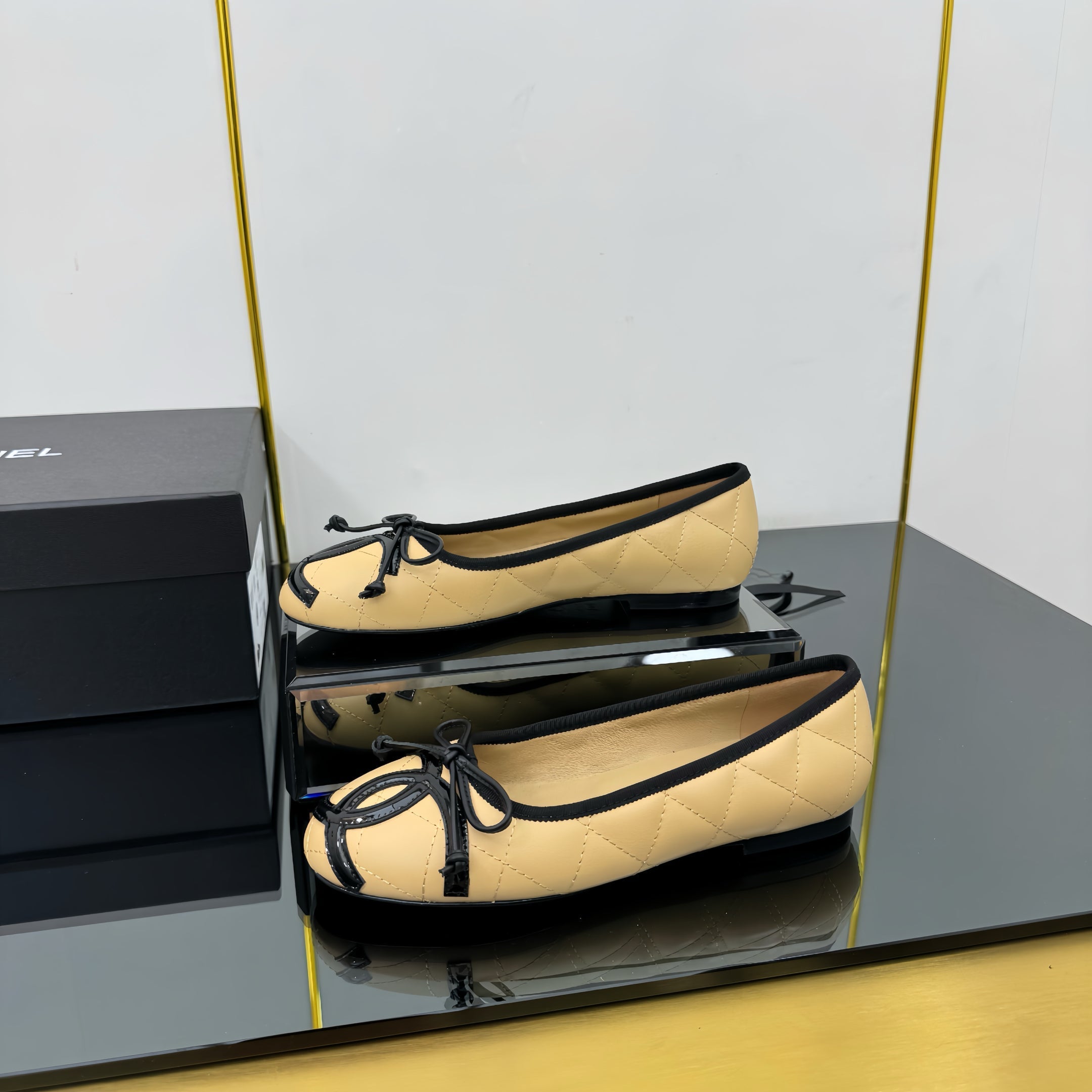 CC 25 Cambon Ballet Flat Beige Black Quilted Calfskin