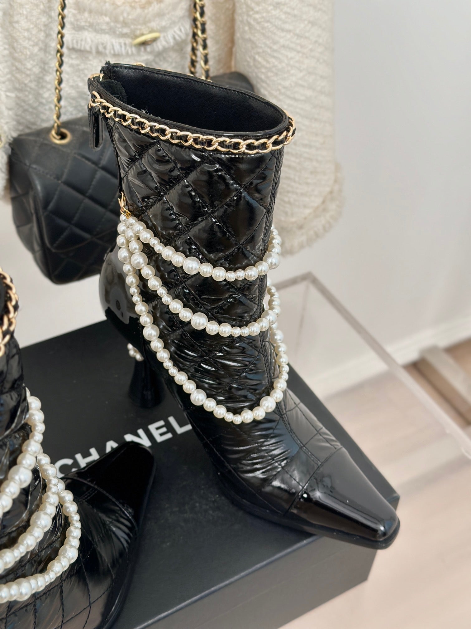 CC Short Boots 80mm Glossy Black Wrinkled Quilted Calfskin