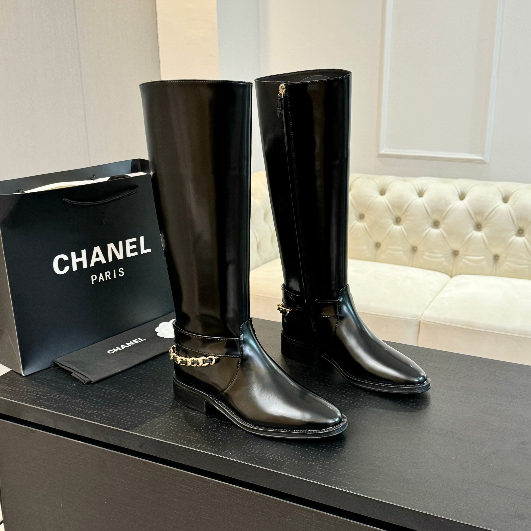 CC High Boots 30mm Glossy Black Chain Cowhide