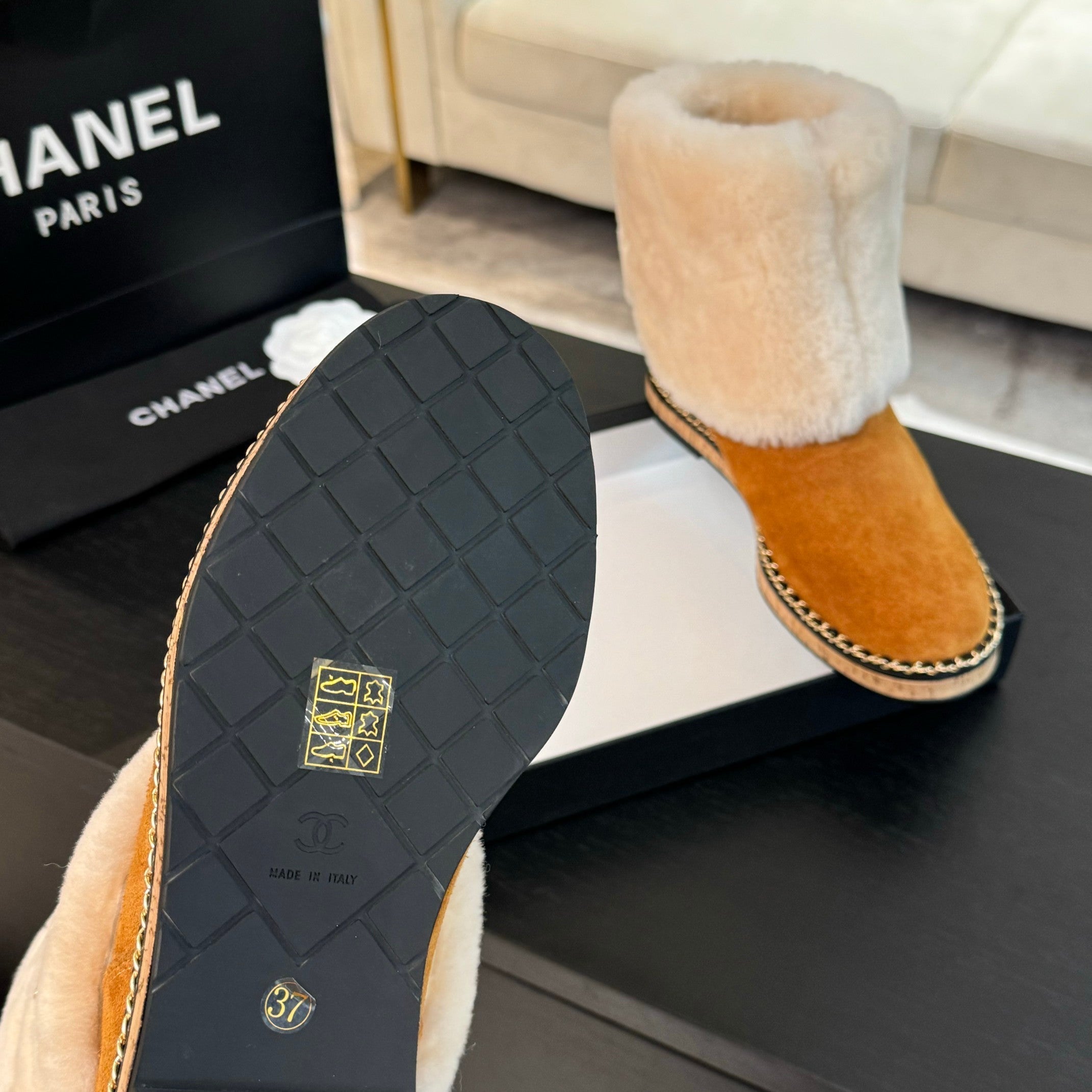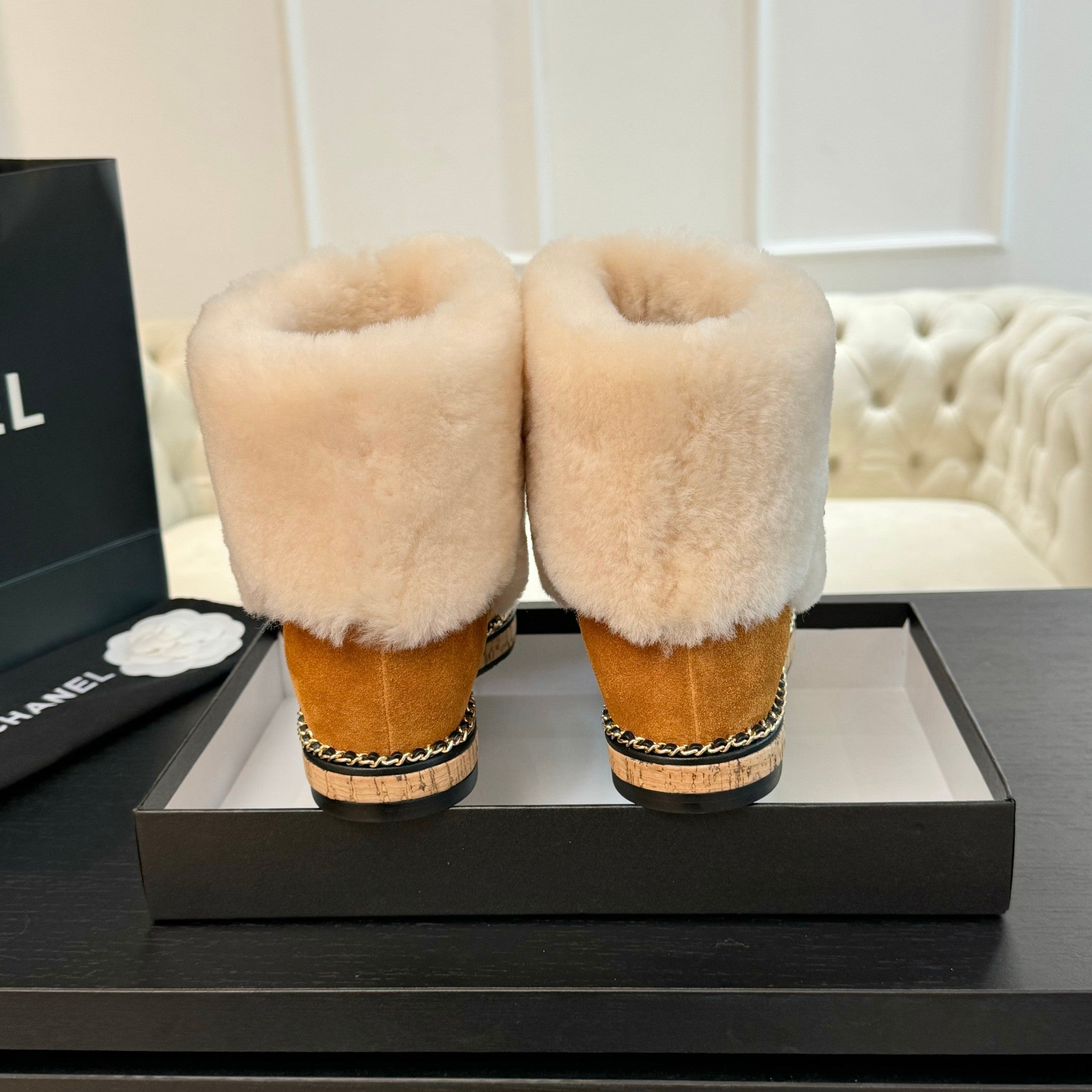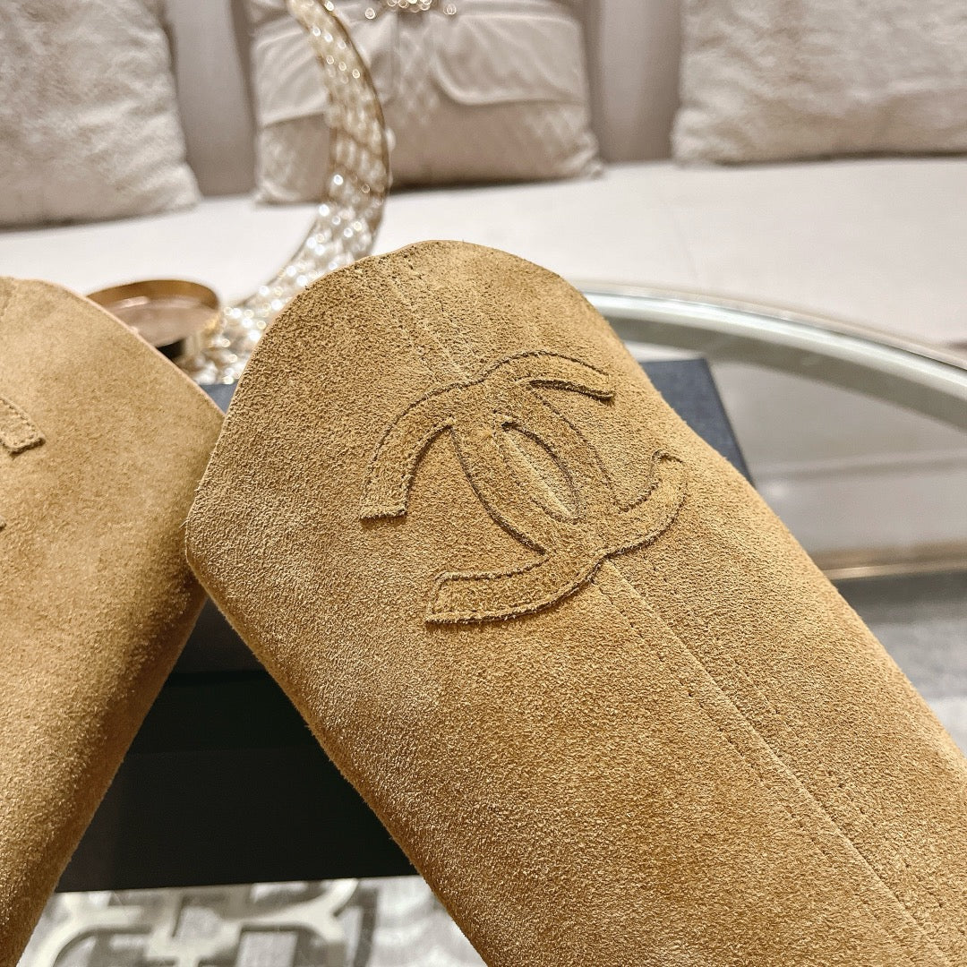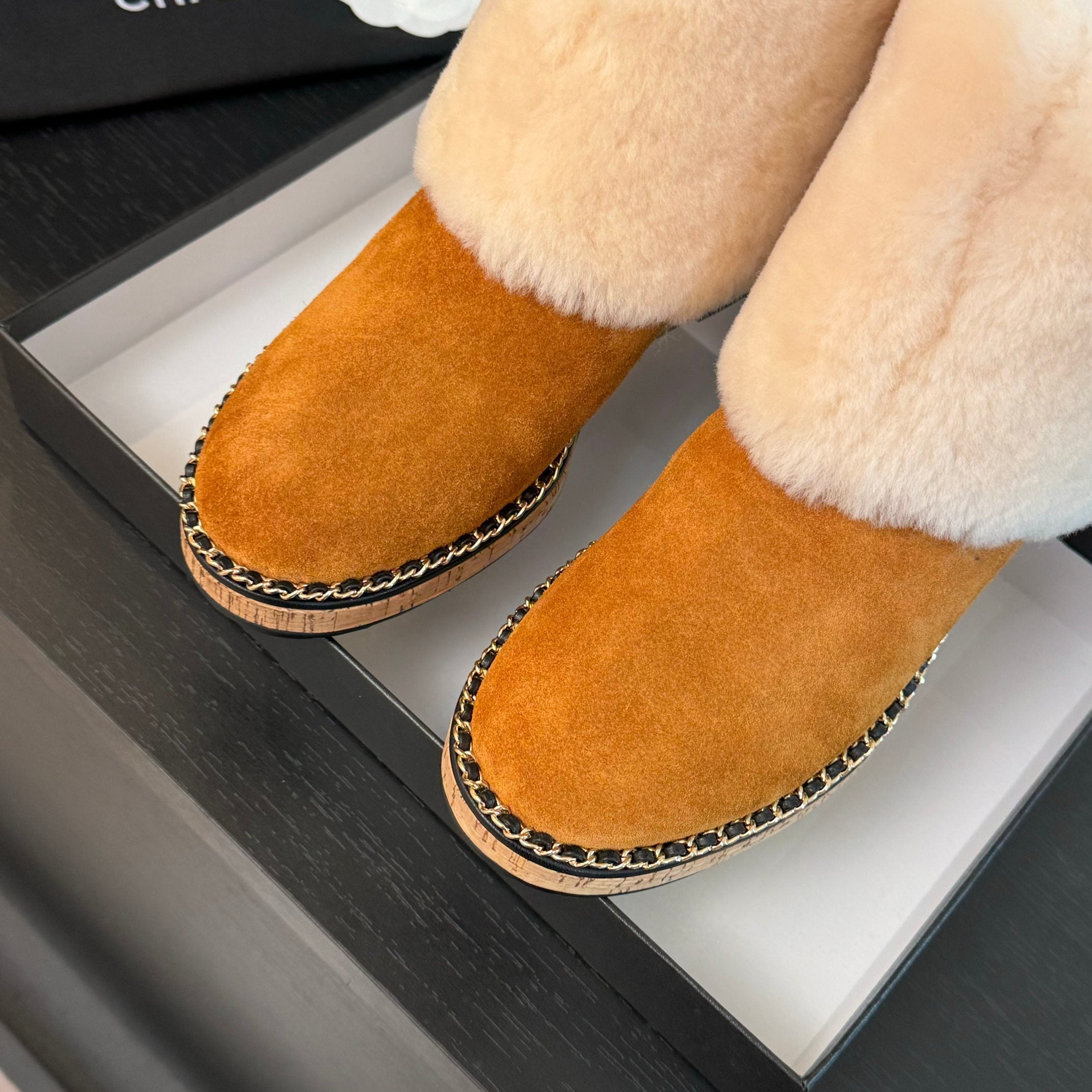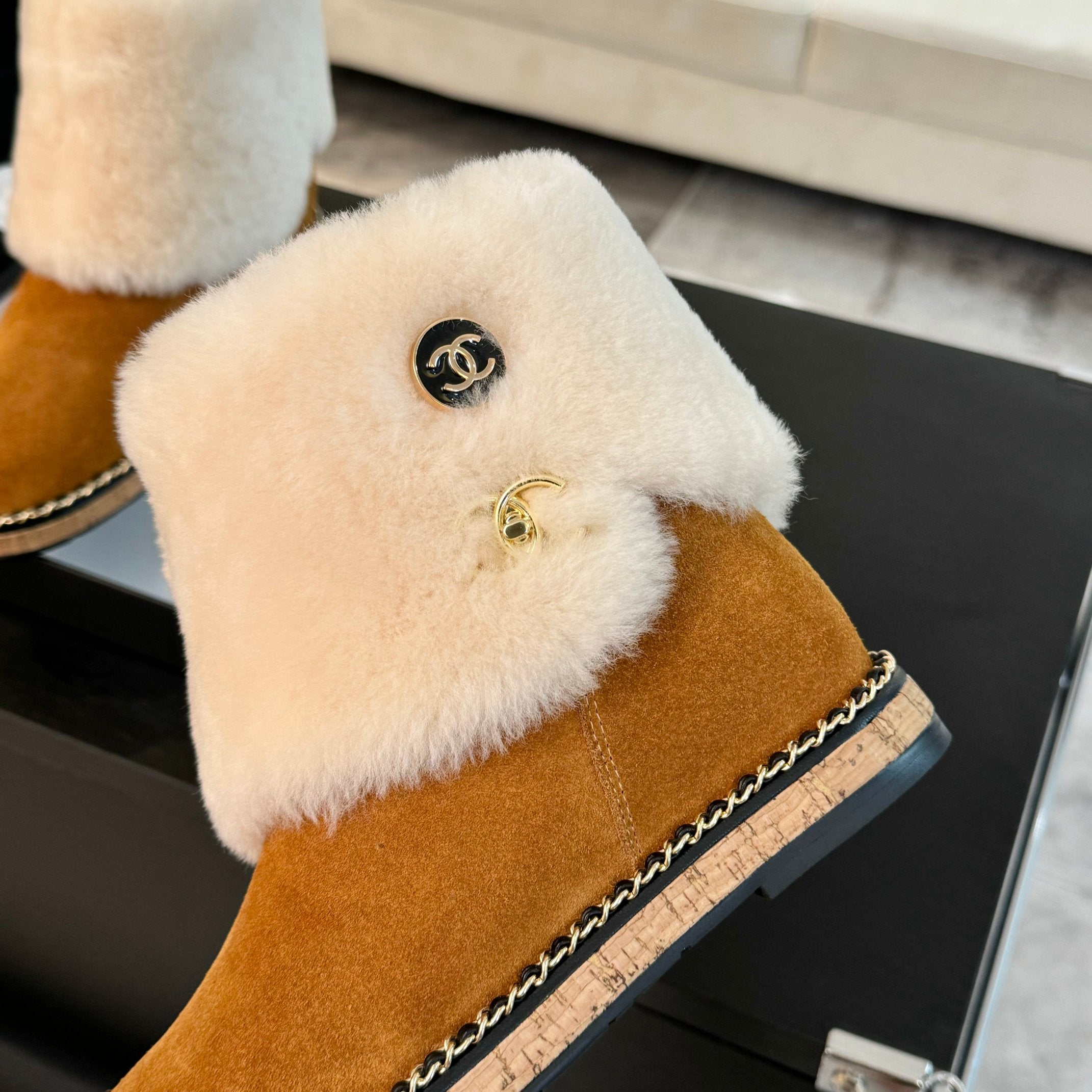 CC Flat Ankle Boots Yellow Brown With Chain Suede And Fleece