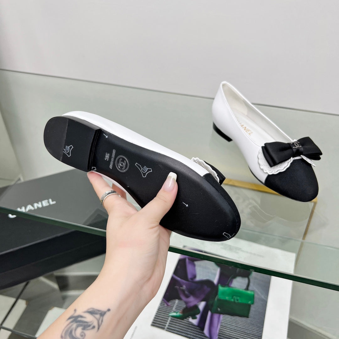CC Ballet Flats White With Camellia Black Lambskin