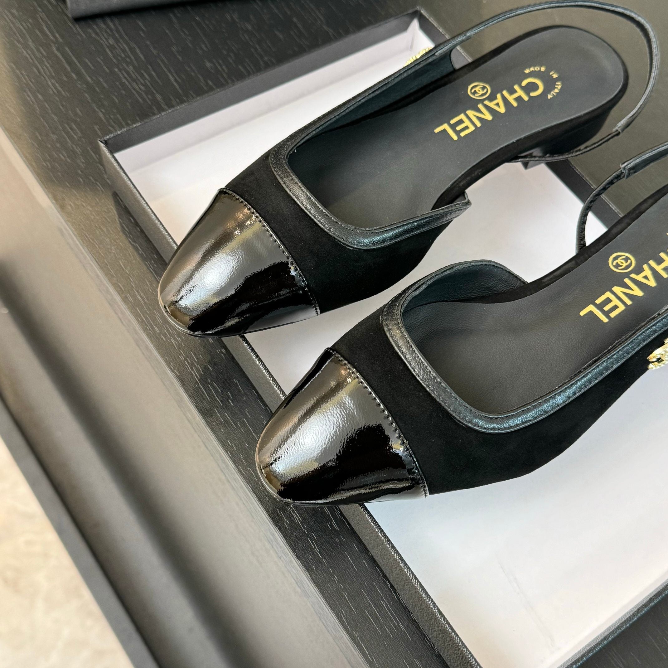 cc slingback pumps 90 in black lambskin and black patent calfskin 137448